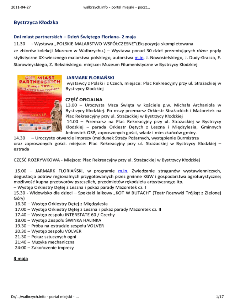 2011-04-27 walbrzych.info - portal miejski - poczt… Bystrzyca Kłodzka Dni miast partnerskich – Dzień Świętego Floriana‐ 2 maja 11.30 ‐ Wystawa „POLSKIE MALARSTWO WSPÓŁCZESNE”(Ekspozycja skompletowana ze zbiorów kolekcji Muzeum w Wałbrzychu.) – Wystawa ponad 30 dzieł prezentujących różne prądy stylistyczne XX‐wiecznego malarstwa polskiego, autorstwa m.in. J. Nowosielskiego, J. Dudy‐Gracza, F. Starowieyskiego, Z. Beksińskiego. miejsce: Muzeum Filumenistyczne w Bystrzycy Kłodzkiej JARMARK FLORIAŃSKI wystawcy z Polski i z Czech, miejsce: Plac Rekreacyjny przy ul. Strażackiej w Bystrzycy Kłodzkiej CZĘŚĆ OFICJALNA 13.00 – Uroczysta Msza Święta w kościele p.w. Michała Archanioła w Bystrzycy Kłodzkiej. Po mszy przemarsz Orkiestr Strażackich i Mażoretek na Plac Rekreacyjny przy ul. Strażackiej w Bystrzycy Kłodzkiej 14.00 – Przemarsz na Plac Rekreacyjny przy ul. Strażackiej w Bystrzycy Kłodzkiej – parada Orkiestr Dętych z Leszna i Międzylesia, Gminnych Jednostek OSP, zaproszonych gości, władz i mieszkańców gminy. 14.30 – Uroczyste otwarcie imprezy (meldunek Straży Pożarnych, wystąpienie Burmistrza oraz zaproszonych gości. miejsce: Plac Rekreacyjny przy ul. Strażackiej w Bystrzycy Kłodzkiej – estrada CZĘŚĆ ROZRYWKOWA ‐ Miejsce: Plac Rekreacyjny przy ul. Strażackiej w Bystrzycy Kłodzkiej 15.00 – JARMARK FLORIAŃSKI, w programie m.in. Zwiedzanie straganów wystawienniczych, degustacja potraw regionalnych przygotowanych przez gminne KGW i gospodarstwa agroturystyczne; możliwość kupna przetworów pszczelich, przedmiotów rękodzieła artystycznego itp. – Występ Orkiestry Dętej z Leszna i pokaz parady Mażoretek cz. I 15.30 ‐ Widowisko dla dzieci – Spektakl lalkowy „KOT W BUTACH” (Teatr Rozrywki Trójkąt z Zielonej Góry) 16.30 – Występ Orkiestry Dętej z Międzylesia 17.00 – Występ Orkiestry Dętej z Leszna i pokaz parady Mażoretek cz. II 17.40 – Występ zespołu INTERSTATE 60 / Czechy 18.00 – Występ Zespołu ŚWINKA HALINKA 19.30 – Próba na estradzie zespołu VOLVER 20.30 – Występ zespołu VOLVER 21.30 – Pokaz sztucznych ogni 21:40 – Muzyka mechaniczna 24:00 – Zakończenie imprezy 3 maja D:/…/walbrzych.info - portal miejski - … 1/17 2011-04-27 walbrzych.info - portal miejski - poczt… Muzyczna Wiosna w Euroregionie Glacensis 12.00 – Występy Ludowych Zespołów Śpiewaczych z Polski i z Czech 15.00 – Występy zespołów smyczkowych, wokalnych, instrumentalnych 18.00 – Występy zespołów młodzieżowych MGOK ( State Of Mind, Punk.T, JoGra) 20.30 ‐ Koncert zespołu GRANS 21:30 – Pokaz Teatru Ognia TUB 22.00 – Zakończenie imprezy www.bystrzycaklodzka.pl Lądek Zdrój VII Obchody Dnia Patrona Lądka Zdroju – Św. Jerzego 29 kwietnia godz. 17.00 Wernisaż wystawy fotograficznej "Lądek‐Zdrój jakiego nie znacie" ‐ fotografie ze zbiorów Muzeum Filumenistycznego w Bystrzycy Kłodzkiej, Galeria Muzealna im. Michała Klahra, Rynek 1 30 kwietnia 10.00 Jarmark Świętojerski na rynku: rzemiosło, rękodzieło artystyczne, malarzy lądeccy, produkty regionalne, 12.00 Polonez w wykonaniu młodzieży z lądeckiego LO 13.00 Drużyna Wojów Piastowskich Jantar,: pokazy walk rycerskich, bicie monet, rzemiosło, obozowisko piastowskie 13.00 Msza Święta w intencji Mieszkańców i Gości Lądka‐Zdroju (kościół parafialny) 14.15 Paradne wejście św. Jerzego wraz z orszakiem. 14.30 Uroczysta sesja Rady Miejskiej na lądeckim rynku, wręczenie medali św. Jerzego 15.00 Artystyczny hołd dla św. Jerzego: Czesi z Cervenego Klasterca, Lądeckie Wiolinki, Orkiestra Artufices ze Stronia Śląskiego, Damascus, montaż słowno‐muzyczny w opracowaniu p Krystyny Kopytko w wykonaniu Oddziału Związku Emerytów i Rencistów w Lądku‐Zdroju, Gimnazjum Lądeckie ‐ Jarmark Talentów: Basia Chrapa ‐ śpiew /utwory Alicji Janosz i Patrycji Markowskiej/, Dorota Weber i Aleksandra Miedzianowska ‐ śpiew, Dominika Szejbak, Adrianna Kubisiak, Julia Drzał, Jakub Groń, Magdalena Wadowska, Natalia Rzepa, Aleksandra Wadowska ‐ taniec, szkolny zespół "Mades Campe" w składzie: Paweł Żelezik, Maciej Mossakowski, Paulina Stuła, Kamila Szczyrska, Sylwester Kwiatkowski, Dawid Chmiel ‐ zagrają i zaśpiewają utwory własne i inne, wystawa prac młodzieży gimnazjalnej, Skrzynczanki. Zabawy dla dzieci ‐ dmuchańce, zjeżdżalnie 18.30 Grupa DISCO POLO JORGUS 20.30 MODERN TALKING (cover) 21.30 – 24.00 Zabawa DJ Wielka Majówka 1 maja 9.45 po Mszy Św. w Sanktuarium Uzdrowienia Chorych odsłonięcie tablicy upamiętniającej Patrona Parku Zdrojowego Jana Pawła II z okazji beatifikacji D:/…/walbrzych.info - portal miejski - … 2/17 2011-04-27 walbrzych.info - portal miejski - poczt… 10.00 Polsko‐czeskie rozpoczęcie sezonu turystycznego na Górze Borówkowej: występy zespołów Sucha Trava i Młodzieżowego Zespołu Dętego Bigg Bras ze Stronia Śląskiego, wydawnictwa turystyczne, czeskie piwo i polska kiełbasa oraz OPIEKANIE PROSIAKA 15.00 Odsłonięcie i poświęcenie pomnika Jana Pawła II przy kościele św. Andrzeja w Trzebieszowicach. 2 maja Arboretum bez Tajemnic, ul. Moniuszki ‐ od godz. 10‐tej, co godzinę grupowe zwiedzanie z opiekunem ogrodu 10.00 Kawiarnia "Kaprys" Turniej Brydża organizowany przez Lądecką Sekcję Brydża. 3 maja 8.00‐12.00 Zawody wędkarskie na Stawach PZW ul. Mickiewicza 12.30 Obchody 20‐lecia Społecznej Straży Rybackiej w Lądku‐Zdroju 12.00‐14.30 Park Zdrojowy przed Zdrojem "Wojciech" Rewia Talentów dziecięcych Szkoły Podstawowej nr 1 Muzyczny Koncert Plenerowy Dalia Bachmatiuk ‐ gitara, Sandra Brudnik ‐ gitara, Katarzyna Kotlarz ‐ keybord, Jakub Macutkiewicz – akordeon, Paulina Mykietyszyn – wokal, Wiktoria Mykietyszyn – wokal PLENEROWE WARSZTATY PLASTYCZNE‐ PAPIEROWE CUDA oraz wystawa prac plastycznych wykonanych na Familijnych Warsztatach. 16.00 Spektakl "HIOB" wg. dramatu Karola Wojtyły w wykona