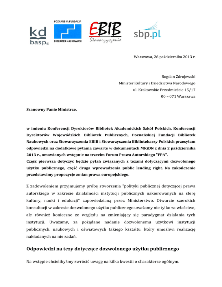 Warszawa, 26 października 2013 r. Bogdan Zdrojewski Minister Kultury i Dziedzictwa Narodowego ul. Krakowskie Przedmieście 15/17 00 – 071 Warszawa Szanowny Panie Ministrze, w imieniu Konferencji Dyrektorów Bibliotek Akademickich Szkół Polskich, Konferencji Dyrektorów Wojewódzkich Bibliotek Publicznych, Poznańskiej Fundacji Bibliotek Naukowych oraz Stowarzyszenia EBIB i Stowarzyszenia Bibliotekarzy Polskich przesyłam odpowiedzi na dodatkowe pytania zawarte w dokumentach MKiDN z dnia 2 października 2013 r., omawianych wstępnie na trzecim Forum Prawa Autorskiego "FPA". Część pierwsza dotyczyć będzie pytań związanych z tezami dotyczącymi dozwolonego użytku publicznego, część druga wprowadzenia public lending right. Na zakończenie przedstawimy propozycje zmian prawa europejskiego. Z zadowoleniem przyjmujemy próbę stworzenia "polityki publicznej dotyczącej prawa autorskiego w zakresie działalności instytucji publicznych nakierowanych na sferę kultury, nauki i edukacji" zapowiedzianą przez Ministerstwo. Otwarcie szerokich konsultacji w zakresie dozwolonego użytku publicznego uważamy nie tylko za właściwe, ale również konieczne ze względu na zmieniający się paradygmat działania tych instytucji. Uważamy, za pożądane nadanie dozwolonemu użytkowi instytucji publicznych, naukowych i oświatowych takiego kształtu, który umożliwi realizację nakładanych na nie zadań. Odpowiedzi na tezy dotyczące dozwolonego użytku publicznego Na wstępie chcielibyśmy zwrócić uwagę na kilka kwestii o charakterze ogólnym. -2- Za słuszne uważamy wprowadzanie takich zmian regulacji prawnych, które rozwiążą narosłe problemy interpretacyjne. Jednakże zmiany te powinny być wprowadzane z dużą precyzją, tak aby nie wpłynęły na ograniczenie dozwolonego użytku publicznego a jedynie doprecyzowywały prawo w obszarach o największej niepewności. Jak wskazywaliśmy w przesłanej w czerwcu analizie, wiele problemów związanych z działalnością bibliotek czy instytucji naukowych wiąże się z niedostosowaniem dozwolonego użytku do rzeczywistości cyfrowej a w szczególności do gromadzonych na coraz większą skalę materiałów w formie elektronicznej. Udostępnianie zasobów elektronicznych, również w sposób zdalny i mobilny, uważamy obecnie za największe wyzwanie dla bibliotek. Dlatego ponownie postulujemy o wprowadzenie takich zmian w prawie autorskim, które umożliwiłyby bibliotekom nie tylko archiwizację, ale i udostępnianie dokumentów elektronicznych (born-digital). Przestrzeń do poszerzenia dozwolonego użytku w tym zakresie, jak również w zakresie innych przedmiotów ochrony, które nie są objęte dozwolonym użytkiem, widzimy w dyrektywie 2006/115/WE w sprawie prawa najmu i użyczenia. Ponownie postulujemy uwzględnienie propozycji prof. Elżbiety Traple zamiany słowa „egzemplarz” na słowo „kopia” w określonych przypadkach. Podtrzymujemy również nasze stanowisko w zakresie wykreślenia art. 35 pr. aut. z ustawy. Odnosząc się do pytań zawartych w dokumencie, uważamy, że: 1. Dozwolony użytek publiczny związany z obiegiem informacji 1. W zakresie dozwolonego użytku publicznego związanego z działalnością ośrodków informacji i dokumentacji (art. 30) Czy Państwa zdaniem istnieje potrzeba zachowania art. 30 Ustawy biorąc pod uwagę, że może on dotyczyć obecnie tylko użytku analogowego? -3- Obieg informacji i komunikacji naukowej zależy od działalności ośrodków informacji i dokumentacji. Tradycyjnie, ośrodki te działają jako jednostki ośrodków naukowych, samodzielnie jako zakłady czy też w strukturach bibliotek np. Ośrodek Informacji Centralnego Instytutu Ochrony Pracy czy Biblioteka i Ośrodek Informacji Naukowo-Technicznej Politechniki Wrocławskiej. Nawet w swojej szczątkowej postaci, wielokrotnie krytykowanej przez doktrynę za zbyt archaiczną,1 art. 30 daje ponad 130 ośrodkom informacji i dokumentacji możliwość realizowania nałożonych na nie zadań z zakresu służby informacyjnej takich jak tworzenie wydawnictw i zestawień bibliograficznych a także przeglądów i analiz dokumentacyjnych. W swej istocie praca dokumentacyjna polega dziś na tworzeniu streszczeń i abstraktów, którym niektórzy przyznają ochronę prawnoautorską (por. klauzula z umowy licencyjnej Czasopisma elektroniczne, książki elektroniczne, ich zawartość wraz z abstraktami chronione są prawem autorskim) lub pobieraniu ich z czasopism i innych opracowań w celu gromadzenia i udostępniania w postaci bibliograficznoabstraktowych baz danych, które służą wymianie informacji o twórczości naukowej w kraju i za granicą. W obecnej rzeczywistości, bazy te muszą być tworzone w formie elektronicznej. Żaden inny przepis w obecnym brzmieniu nie stanowi odpowiedniej podstawy normatywnej dla obiegu informacji naukowej w instytutach badawczych i bibliotekach. Uważamy, że nie ma powodu do usuwania artykułu 30, tylko dlatego, że niektóre komercyjne podmioty zbyt szeroko interpretują pojęcie ośrodek informacji. Być może, warto rozważyć sugerowane podczas FPA przeniesienie uprawnienia ośrodków informacji i dokumentacji do innego przepisu (np. art. 27 lub art. 25). Musi natomiast nastąpić takie jego przeformułowanie, aby umożliwić ośrodkom informacji i dokumentacji, w szczególności naukowej, sporządzanie i rozpowszechnianie, również formie elektronicznych baz danych i poprzez Internet własnych opracowań dokumentacyjnych. 2. Dozwolony użytek publiczny dotyczący działalności instytucji kultury Dla porządku podkreślić należy, że działalność instytucji naukowych i oświatowych, czyli dozwolony użytek edukacyjny powinien znaleźć się w odrębnym punkcie. 1 Por. E. Traple: Komentarz do art. 30 ustawy o prawie autorskim i prawach pokrewnych [w:] J. Barta, R. Markiewicz (red.), Prawo autorskie i prawo pokrewne. Komentarz, WoltersKluwer, 2011, s. 275. -4- a) korzystanie z utworów