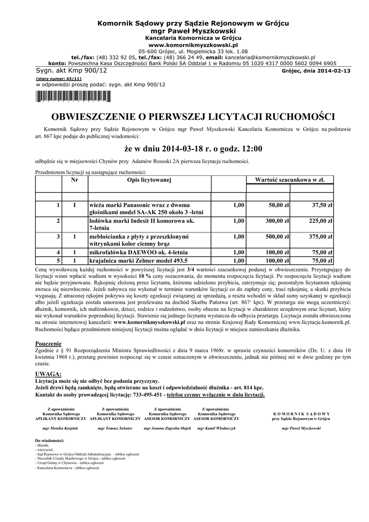 Komornik Sądowy przy Sądzie Rejonowym w Grójcu mgr Paweł Myszkowski Kancelaria Komornicza w Grójcu www.komornikmyszkowski.pl 05-600 Grójec, ul. Mogielnicka 33 lok. 1.08 tel./fax: (48) 332 92 05, tel./fax: (48) 366 24 49, email: [email protected] konto: Powszechna Kasa Oszczędności Bank Polski SA Oddział 1 w Radomiu 05 1020 4317 0000 5602 0094 6905 Sygn. akt Kmp 900/12 Grójec, dnia 2014-02-13 (stary numer: 43/11) w odpowiedzi proszę podać: sygn. akt Kmp 900/12 *5014021300207* OBWIESZCZENIE O PIERWSZEJ LICYTACJI RUCHOMOŚCI Komornik Sądowy przy Sądzie Rejonowym w Grójcu mgr Paweł Myszkowski Kancelaria Komornicza w Grójcu na podstawie art. 867 kpc podaje do publicznej wiadomości: że w dniu 2014-03-18 r. o godz. 12:00 odbędzie się w miejsowości Chynów przy Adamów Rososki 2A pierwsza licytacja ruchomości. Przedmiotem licytacji są następujące ruchomości: Nr 1 I 2 3 1 4 5 1 1 Opis licytowanej Wartość szacunkowa w zł. wieża marki Panasonic wraz z dwoma głośnikami model SA-AK 250 około 3 -letni lodówka marki Indesit II komorowa ok. 7-letnia meblościanka z płyty z przeszklonymi witrynkami kolor ciemny brąz mikrofalówka DAEWOO ok. 4-letnia krajalnica marki Zelmer model 493.5 1,00 50,00 zł 37,50 zł 1,00 300,00 zł 225,00 zł 1,00 500,00 zł 375,00 zł 1,00 1,00 100,00 zł 100,00 zł 75,00 zł 75,00 zł Ceną wywoławczą każdej ruchomości w powyższej licytacji jest 3/4 wartości szacunkowej podanej w obwieszczeniu. Przystępujący do licytacji winni wpłacić wadium w wysokości 10 % ceny oszacowania, do momentu rozpoczęcia licytacji. Po rozpoczęciu licytacji wadium nie będzie przyjmowane. Rękojmię złożoną przez licytanta, któremu udzielono przybicia, zatrzymuje się; pozostałym licytantom rękojmię zwraca się niezwłocznie. Jeżeli nabywca nie wykonał w terminie warunków licytacji co do zapłaty ceny, traci rękojmię, a skutki przybicia wygasają. Z utraconej rękojmi pokrywa się koszty egzekucji związanej ze sprzedażą, a reszta wchodzi w skład sumy uzyskanej w egzekucji albo jeżeli egzekucja została umorzona jest przelewana na dochód Skarbu Państwa (art. 8671 kpc). W przetargu nie mogą uczestniczyć: dłużnik, komornik, ich małżonkowie, dzieci, rodzice i rodzeństwo, osoby obecne na licytacji w charakterze urzędowym oraz licytant, który nie wykonał warunków poprzedniej licytacji. Stawienie się jednego licytanta wystarcza do odbycia przetargu. Licytacja została obwieszczona na stronie internetowej kancelarii: www.komornikmyszkowski.pl oraz na stronie Krajowej Rady Komorniczej www.licytacje.komornik.pl. Ruchomości będące przedmiotem niniejszej licytacji można oglądać w dniu licytacji w miejscu zamieszkania dłużnika. Pouczenie Zgodnie z § 91 Rozporządzenia Ministra Sprawiedliwości z dnia 9 marca 1968r. w sprawie czynności komorników (Dz. U. z dnia 10 kwietnia 1968 r.), przetarg powinien rozpocząć się w czasie oznaczonym w obwieszczeniu, jednak nie później niż w dwie godziny po tym czasie. UWAGA: Licytacja może się nie odbyć bez podania przyczyny. Jeżeli drzwi będą zamknięte, będą otwierane na koszt i odpowiedzialność dłużnika - art. 814 kpc. Kontakt do osoby prowadzącej licytację: 733-495-451 - telefon czynny wyłącznie w dniu licytacji. Z upoważnienia Z upoważnienia Z upoważnienia Z upoważnienia Komornika Sądowego Komornika Sądowego Komornika Sądowego Komornika Sądowego APLIKANT KOMORNICZY APLIKANT KOMORNICZY ASESOR KOMORNICZY ASESOR KOMORNICZY mgr Monika Karpiuk mgr Tomasz Sekuter Do wiadomości: - dłużnik; - wierzyciel; - Sąd Rejonowy w Grójcu Oddział Administracyjny - tablica ogłoszeń - Naczelnik Urzędu Skarbowego w Grójcu - tablica ogłoszeń - Urząd Gminy w Chynowie - tablica ogłoszeń - Kancelaria Komornicza - tablica ogłoszeń mgr Joanna Zagroba-Majek mgr Kamil Włodarczyk KOMORNIK SĄDOWY przy Sądzie Rejonowym w Grójcu mgr Paweł Myszkowski