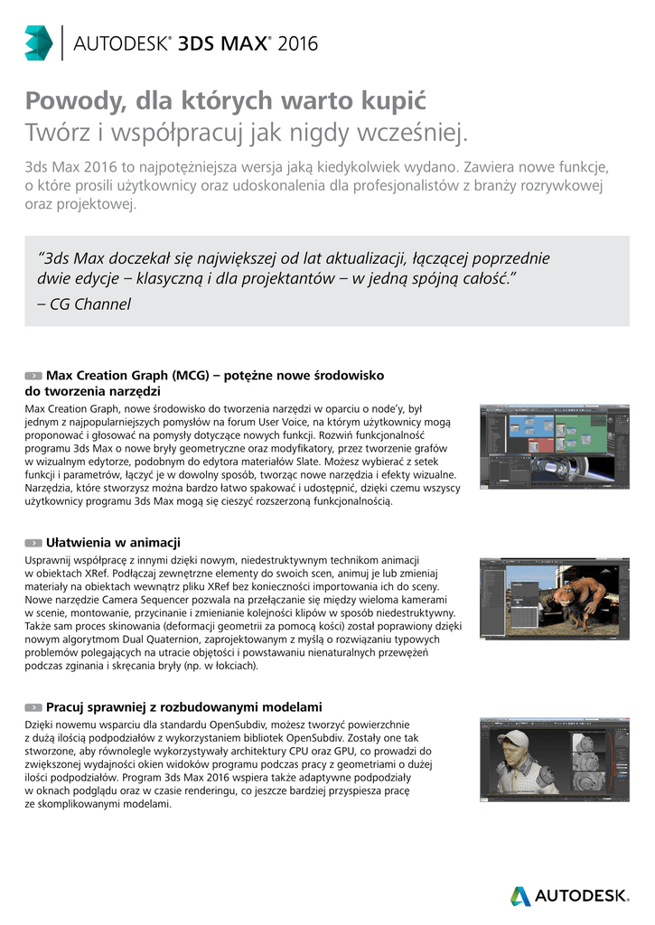 Powody, dla których warto kupić Twórz i współpracuj jak nigdy wcześniej. 3ds Max 2016 to najpotężniejsza wersja jaką kiedykolwiek wydano. Zawiera nowe funkcje, o które prosili użytkownicy oraz udoskonalenia dla profesjonalistów z branży rozrywkowej oraz projektowej. “3ds Max doczekał się największej od lat aktualizacji, łączącej poprzednie dwie edycje – klasyczną i dla projektantów – w jedną spójną całość.” – CG Channel Max Creation Graph (MCG) – potężne nowe środowisko do tworzenia narzędzi Max Creation Graph, nowe środowisko do tworzenia narzędzi w oparciu o node’y, był jednym z najpopularniejszych pomysłów na forum User Voice, na którym użytkownicy mogą proponować i głosować na pomysły dotyczące nowych funkcji. Rozwiń funkcjonalność programu 3ds Max o nowe bryły geometryczne oraz modyfikatory, przez tworzenie grafów w wizualnym edytorze, podobnym do edytora materiałów Slate. Możesz wybierać z setek funkcji i parametrów, łączyć je w dowolny sposób, tworząc nowe narzędzia i efekty wizualne. Narzędzia, które stworzysz można bardzo łatwo spakować i udostępnić, dzięki czemu wszyscy użytkownicy programu 3ds Max mogą się cieszyć rozszerzoną funkcjonalnością. Ułatwienia w animacji Usprawnij współpracę z innymi dzięki nowym, niedestruktywnym technikom animacji w obiektach XRef. Podłączaj zewnętrzne elementy do swoich scen, animuj je lub zmieniaj materiały na obiektach wewnątrz pliku XRef bez konieczności importowania ich do sceny. Nowe narzędzie Camera Sequencer pozwala na przełączanie się między wieloma kamerami w scenie, montowanie, przycinanie i zmienianie kolejności klipów w sposób niedestruktywny. Także sam proces skinowania (deformacji geometrii za pomocą kości) został poprawiony dzięki nowym algorytmom Dual Quaternion, zaprojektowanym z myślą o rozwiązaniu typowych problemów polegających na utracie objętości i powstawaniu nienaturalnych przewężeń podczas zginania i skręcania bryły (np. w łokciach). Pracuj sprawniej z rozbudowanymi modelami Dzięki nowemu wsparciu dla standardu OpenSubdiv, możesz tworzyć powierzchnie z dużą ilością podpodziałów z wykorzystaniem bibliotek OpenSubdiv. Zostały one tak stworzone, aby równolegle wykorzystywały architektury CPU oraz GPU, co prowadzi do zwiększonej wydajności okien widoków programu podczas pracy z geometriami o dużej ilości podpodziałów. Program 3ds Max 2016 wspiera także adaptywne podpodziały w oknach podglądu oraz w czasie renderingu, co jeszcze bardziej przyspiesza pracę ze skomplikowanymi modelami. Powody, dla których warto zaktualizować Łatwość obsługi Nowy system szablonów pozwala na ładowanie ustandaryzowanych konfiguracji początkowych, ustalających parametry renderowania, środowiska, oświetlenia oraz system jednostek, dzięki czemu możesz tworzyć nowe sceny dużo szybciej. Dzięki prostym narzędziom importu/eksportu, możesz szybko dzielić się swoimi szablonami lub wykorzystać te stworzone przez innych użytkowników. Zdefiniowany interfejs użytkownika Design Workspace oferuje łatwy dostęp do narzędzi służących do pozycjonowania obiektów, świateł, renderowania oraz narzędzi teksturujących. Łatwiejsza wymiana danych Z nowym wsparciem dla formatu Alembic, przenoszenie skomplikowanych danych pomiędzy etapami procesu produkcyjnego jest dużo łatwiejsze. Wprowadzono także nowy system buforowania okien podglądu, co wyraźnie podniosło ich wydajność. Shadery czasu rzeczywistego ShaderFX zostały wzbogacone o nowe opcje oraz lepszą współpracę między programami 3ds Max, Autodesk® Maya® oraz Autodesk® Maya LT TM. Udoskonalona współpraca z programem Autodesk® Revit® pozwala na 10 razy szybsze wczytywanie jego modeli. Autodesk Translation Framework (ATF) upraszcza wymianę danych między formatami Autodesk oraz innych firm, takich jak Solidworks. Możesz teraz tworzyć wysokiej jakości animacje projektów mechanicznych bez konieczności konstruowania zależności w programie 3ds Max , dzięki możliwości importowania z programu Autodesk® Inventor® połączeń mechanicznych oraz animacji silników, które podczas importu są zamieniane na tradycyjne klatki kluczowe. Rewolucja w renderingu Dzięki korzystaniu z tej samej technologii co programy Revit oraz Autodesk® AutoCAD®, program 3ds Max 2016 pozwala klientom posiadającym subskrypcję na korzystanie z usługi renderingu w chmurze A360. Usługa ta wykorzystuje chmurę obliczeniową, co pozwala na rendering profesjonalnych obrazów w wysokiej rozdzielczości bez zajmowania własnej stacji roboczej. Nowa fizyczna kamera (Physical Camera), stworzona przez firmę Chaos Group, twórców V-ray, posiada różne funkcje symulujące prawdziwą kamerę, takie jak czas naświetlania, przysłona, głębia ostrości oraz ekspozycja. A dzięki wykorzystaniu najnowszych usprawnień silników renderujących Iray oraz mental Ray, tworzenie fotorealistycznych obrazów stało się jeszcze łatwiejsze. Dowiedz się więcej na stronie autodesk.pl/3dsmax Masz świetny pomysł na nową funkcjonalność? Zgłoś go na forum 3ds Max User Voice Autodesk, the Autodesk logo, and Maya are registered trademarks or trademarks of Autodesk, Inc., and/or its subsidiaries and/or affiliates in the USA and/or other countries. All other brand names, product names, or trademarks belong to their respective holders. Autodesk reserves the right to alter product and services offerings, and specifications and pricing at any time without notice, and is not responsible for typographical or graphical errors that may appear in this document. © 2015 Autodesk, Inc. All rights reserved. Autodesk® 3ds Max® 2016