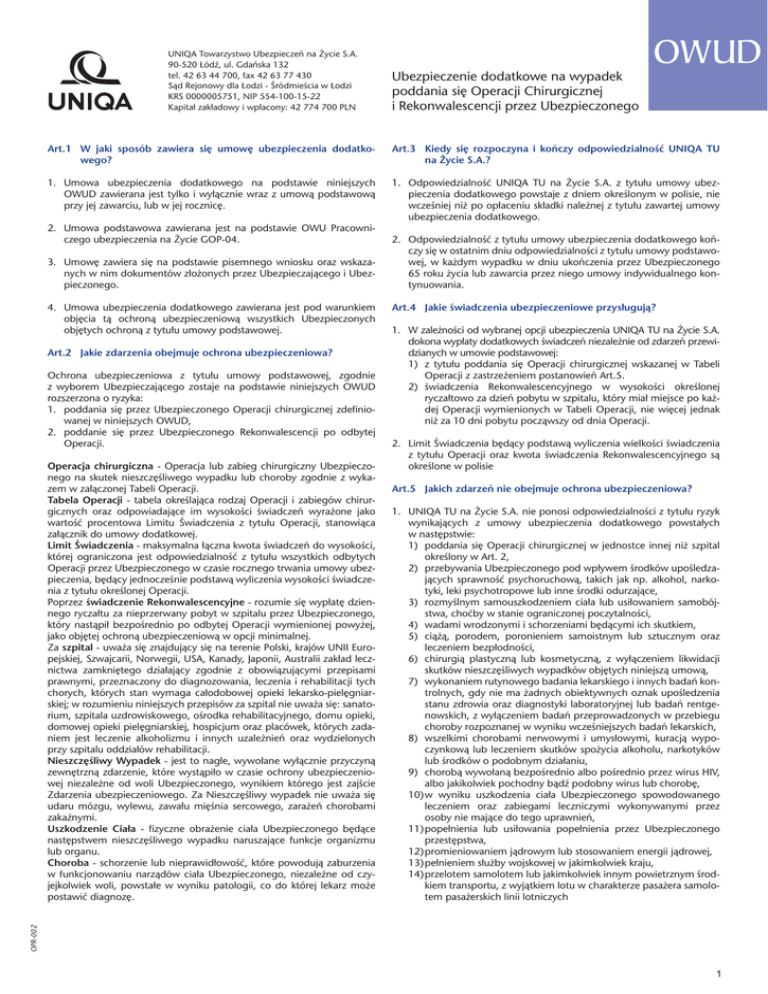 UNIQA Towarzystwo Ubezpieczeñ na ¯ycie S.A. 90-520 £ódŸ, ul. Gdañska 132 tel. 42 63 44 700, fax 42 63 77 430 S¹d Rejonowy dla £odzi - Œródmieœcia w £odzi KRS 0000005751, NIP 554-100-15-22 Kapita³ zak³adowy i wp³acony: 42 774 700 PLN Ubezpieczenie dodatkowe na wypadek poddania się Operacji Chirurgicznej i Rekonwalescencji przez Ubezpieczonego OWUD Art.1 W jaki sposób zawiera się umowę ubezpieczenia dodatkowego? Art.3 Kiedy się rozpoczyna i kończy odpowiedzialność UNIQA TU na Życie S.A.? 1. Umowa ubezpieczenia dodatkowego na podstawie niniejszych OWUD zawierana jest tylko i wyłącznie wraz z umową podstawową przy jej zawarciu, lub w jej rocznicę. 1. Odpowiedzialność UNIQA TU na Życie S.A. z tytułu umowy ubezpieczenia dodatkowego powstaje z dniem określonym w polisie, nie wcześniej niż po opłaceniu składki należnej z tytułu zawartej umowy ubezpieczenia dodatkowego. 2. Umowa podstawowa zawierana jest na podstawie OWU Pracowniczego ubezpieczenia na Życie GOP-04. 3. Umowę zawiera się na podstawie pisemnego wniosku oraz wskazanych w nim dokumentów złożonych przez Ubezpieczającego i Ubezpieczonego. 4. Umowa ubezpieczenia dodatkowego zawierana jest pod warunkiem objęcia tą ochroną ubezpieczeniową wszystkich Ubezpieczonych objętych ochroną z tytułu umowy podstawowej. Art.2 Jakie zdarzenia obejmuje ochrona ubezpieczeniowa? Ochrona ubezpieczeniowa z tytułu umowy podstawowej, zgodnie z wyborem Ubezpieczającego zostaje na podstawie niniejszych OWUD rozszerzona o ryzyka: 1. poddania się przez Ubezpieczonego Operacji chirurgicznej zdefiniowanej w niniejszych OWUD, 2. poddanie się przez Ubezpieczonego Rekonwalescencji po odbytej Operacji. Art.4 Jakie świadczenia ubezpieczeniowe przysługują? 1. W zależności od wybranej opcji ubezpieczenia UNIQA TU na Życie S.A. dokona wypłaty dodatkowych świadczeń niezależnie od zdarzeń przewidzianych w umowie podstawowej: 1) z tytułu poddania się Operacji chirurgicznej wskazanej w Tabeli Operacji z zastrzeżeniem postanowień Art.5. 2) świadczenia Rekonwalescencyjnego w wysokości określonej ryczałtowo za dzień pobytu w szpitalu, który miał miejsce po każdej Operacji wymienionych w Tabeli Operacji, nie więcej jednak niż za 10 dni pobytu począwszy od dnia Operacji. 2. Limit Świadczenia będący podstawą wyliczenia wielkości świadczenia z tytułu Operacji oraz kwota świadczenia Rekonwalescencyjnego są określone w polisie Art.5 Jakich zdarzeń nie obejmuje ochrona ubezpieczeniowa? 1. UNIQA TU na Życie S.A. nie ponosi odpowiedzialności z tytułu ryzyk wynikających z umowy ubezpieczenia dodatkowego powstałych w następstwie: 1) poddania się Operacji chirurgicznej w jednostce innej niż szpital określony w Art. 2, 2) przebywania Ubezpieczonego pod wpływem środków upośledzających sprawność psychoruchową, takich jak np. alkohol, narkotyki, leki psychotropowe lub inne środki odurzające, 3) rozmyślnym samouszkodzeniem ciała lub usiłowaniem samobójstwa, choćby w stanie ograniczonej poczytalności, 4) wadami wrodzonymi i schorzeniami będącymi ich skutkiem, 5) ciążą, porodem, poronieniem samoistnym lub sztucznym oraz leczeniem bezpłodności, 6) chirurgią plastyczną lub kosmetyczną, z wyłączeniem likwidacji skutków nieszczęśliwych wypadków objętych niniejszą umową, 7) wykonaniem rutynowego badania lekarskiego i innych badań kontrolnych, gdy nie ma żadnych obiektywnych oznak upośledzenia stanu zdrowia oraz diagnostyki laboratoryjnej lub badań rentgenowskich, z wyłączeniem badań przeprowadzonych w przebiegu choroby rozpoznanej w wyniku wcześniejszych badań lekarskich, 8) wszelkimi chorobami nerwowymi i umysłowymi, kuracją wypoczynkową lub leczeniem skutków spożycia alkoholu, narkotyków lub środków o podobnym działaniu, 9) chorobą wywołaną bezpośrednio albo pośrednio przez wirus HIV, albo jakikolwiek pochodny bądź podobny wirus lub chorobę, 10)w wyniku uszkodzenia ciała Ubezpieczonego spowodowanego leczeniem oraz zabiegami leczniczymi wykonywanymi przez osoby nie mające do tego uprawnień, 11)popełnienia lub usiłowania popełnienia przez Ubezpieczonego przestępstwa, 12)promieniowaniem jądrowym lub stosowaniem energii jądrowej, 13)pełnieniem służby wojskowej w jakimkolwiek kraju, 14)przelotem samolotem lub jakimkolwiek innym powietrznym środkiem transportu, z wyjątkiem lotu w charakterze pasażera samolotem pasażerskich linii lotniczych OPR-002 Operacja chirurgiczna - Operacja lub zabieg chirurgiczny Ubezpieczonego na skutek nieszczęśliwego wypadku lub choroby zgodnie z wykazem w załączonej Tabeli Operacji. Tabela Operacji - tabela określająca rodzaj Operacji i zabiegów chirurgicznych oraz odpowiadające im wysokości świadczeń wyrażone jako wartość procentowa Limitu Świadczenia z tytułu Operacji, stanowiąca załącznik do umowy dodatkowej. Limit Świadczenia - maksymalna łączna kwota świadczeń do wysokości, której ograniczona jest odpowiedzialność z tytułu wszystkich odbytych Operacji przez Ubezpieczonego w czasie rocznego trwania umowy ubezpieczenia, będący jednocześnie podstawą wyliczenia wysokości świadczenia z tytułu określonej Operacji. Poprzez świadczenie Rekonwalescencyjne - rozumie się wypłatę dziennego ryczałtu za nieprzerwany pobyt w szpitalu przez Ubezpieczonego, który nastąpił bezpośrednio po odbytej Operacji wymienionej powyżej, jako objętej ochroną ubezpieczeniową w opcji minimalnej. Za szpital - uważa się znajdujący się na terenie Polski, krajów UNII Europejskiej, Szwajcarii, Norwegii, USA, Kanady, Japonii, Australii zakład lecznictwa zamkniętego działający zgodnie z obowiązującymi przepisami prawnymi, przeznaczony do diagnozowania, leczenia i rehabilitacji tych chorych, których stan wymaga całodobowej opieki lekarsko-pielęgniarskiej; w rozumieniu niniejszych przepisów za szpital nie uważa się: sanatorium, szpitala uzdrowiskowego, ośrodka rehabilita