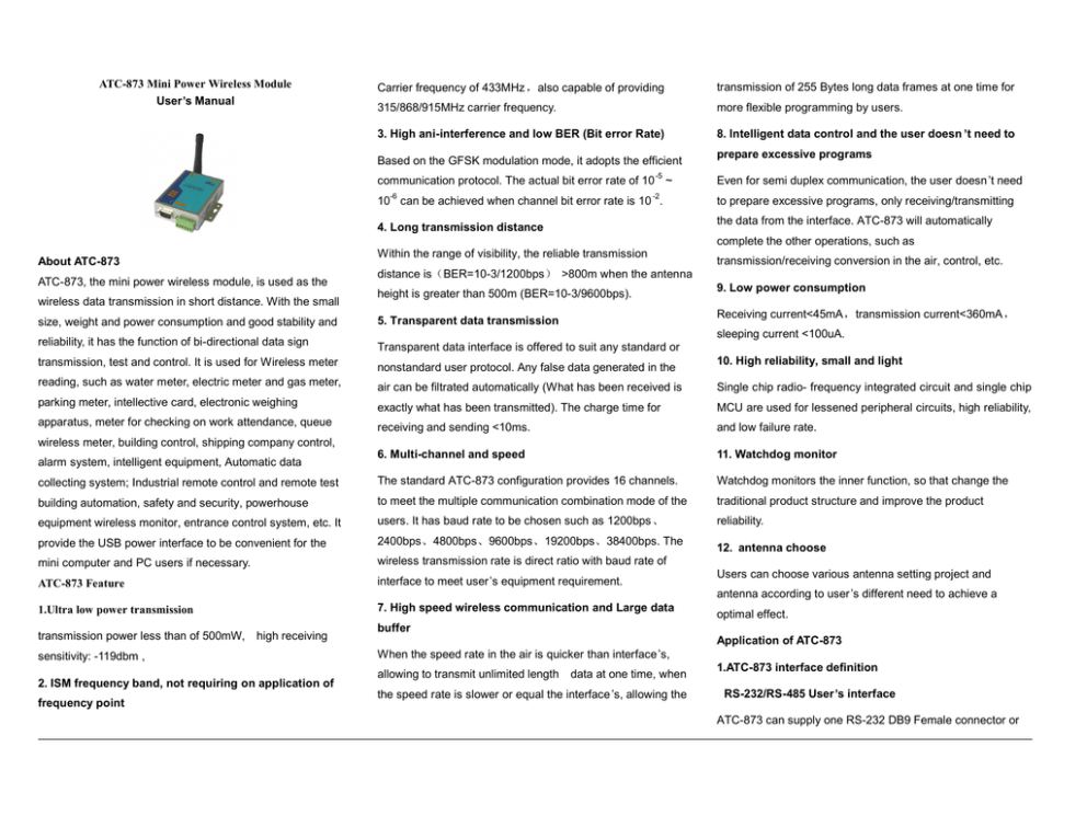 ATC-873 Mini Power Wireless Module User’s Manual Carrier frequency of 433MHz ,also capable of providing transmission of 255 Bytes long data frames at one time for 315/868/915MHz carrier frequency. more flexible programming by users. 3. High ani-interference and low BER (Bit error Rate) 8. Intelligent data control and the user doesn ’t need to Based on the GFSK modulation mode, it adopts the efficient -5 communication protocol. The actual bit error rate of 10 ~ -6 -2 10 can be achieved when channel bit error rate is 10 . prepare excessive programs Even for semi duplex communication, the user doesn’t need to prepare excessive programs, only receiving/transmitting the data from the interface. ATC-873 will automatically 4. Long transmission distance complete the other operations, such as Within the range of visibility, the reliable transmission About ATC-873 ATC-873, the mini power wireless module, is used as the wireless data transmission in short distance. With the small transmission/receiving conversion in the air, control, etc. distance is(BER=10-3/1200bps) >800m when the antenna height is greater than 500m (BER=10-3/9600bps). 9. Low power consumption Receiving current<45mA,transmission current<360mA, size, weight and power consumption and good stability and 5. Transparent data transmission reliability, it has the function of bi-directional data sign Transparent data interface is offered to suit any standard or transmission, test and control. It is used for Wireless meter nonstandard user protocol. Any false data generated in the reading, such as water meter, electric meter and gas meter, air can be filtrated automatically (What has been received is Single chip radio- frequency integrated circuit and single chip parking meter, intellective card, electronic weighing exactly what has been transmitted). The charge time for MCU are used for lessened peripheral circuits, high reliability, apparatus, meter for checking on work attendance, queue receiving and sending <10ms. and low failure rate. 6. Multi-channel and speed 11. Watchdog monitor collecting system; Industrial remote control and remote test The standard ATC-873 configuration provides 16 channels. Watchdog monitors the inner function, so that change the building automation, safety and security, powerhouse to meet the multiple communication combination mode of the traditional product structure and improve the product equipment wireless monitor, entrance control system, etc. It users. It has baud rate to be chosen such as 1200bps、 reliability. provide the USB power interface to be convenient for the 2400bps、4800bps、9600bps、19200bps、38400bps. The mini computer and PC users if necessary. wireless transmission rate is direct ratio with baud rate of ATC-873 Feature interface to meet user’s equipment requirement. 1.Ultra low power transmission 7. High speed wireless communication and Large data sleeping current <100uA. 10. High reliability, small and light wireless meter, building control, shipping company control, alarm system, intelligent equipment, Automatic data transmission power less than of 500mW, Users can choose various antenna setting project and antenna according to user’s different need to achieve a high receiving sensitivity: -119dbm , 2. ISM frequency band, not requiring on application of frequency point 12. antenna choose optimal effect. buffer Application of ATC-873 When the speed rate in the air is quicker than interface’s, allowing to transmit unlimited length data at one time, when the speed rate is slower or equal the interface ’s, allowing the 1.ATC-873 interface definition RS-232/RS-485 User’s interface ATC-873 can supply one RS-232 DB9 Female connector or RS-485 connector and its definitions as well as connection method for terminals are shown in Table 1. When RF baud rate is not faster than COM baud rate ,One municipal electric supply. frame Can transmit 255 bytes most. You can set the rate 2. Sleeping function according your need. RS-232/485 Pinout at DB9-F ATC-873 had sleeping and no-sleeping version. DB9 Pin RS-232 RS-485 Description current of ATC-873 in the sleeping state is 1Ua. Users must 2 RXD 485- I/O tell which version will be chosen before place the order in 3 TXD 485+ I/O advance. For sleeping version, users can open and close High level to sleep, the sleeping function by themselves. ATC-873 with the Low level awake sleeping function has two awakening way, one is hardware Ground awakening way, another is interface awakening way( air 4 SLE SLE 5 GND GND awakening will be reserved) Hardware awakening is RS-232/485 Pinout at six terminal Pin achieved by the Pin 5 input to the high level and input low RS-232 RS-485 Description 1 TXD 485+ I/O 2 RXD 485- I/O (From left) 3 SLE SLE 4 NC NC 5 VIN VIN 6 GND GND High level to sleep, Low level awake send designate protocol data by ATC-873 interface to open ATC-873 uses DC power supply with voltage of +9-12V. It can also share power supply with other equipment, however, 2. Their RF rates is same. 3. RF Module Com baud rate and verify is agree with its equipment or PC that it connects with. parameters default value: Channel: 1 Interface speed rate:9600BPS Interface verify:none close state before leaving factory, so users must set by Speed rate in air:9600BPS ATC-873 software to set the awakening mode to hardware awakening or interface awakening. Users can also tell us to Channel and frequency list If users use ATC-873 with the sleeping function, but hope ATC-873 software to set for no-sleeping state or make 1. Power supply 1. Their channels(i.e. frequency)is same. or awake. ATC-873 with the function of sleeping is default in not to apply the sleeping function, the users can set by ATC-873 Power supply and sleep mode Two ATC-873 communication must have condition as follow: level to awake. Interface awakening is achieved by users set in advance. Ground The general Power supply is 5V DC. The Channel Frequency Channel Frequency 1 430.2000MHZ 9 458