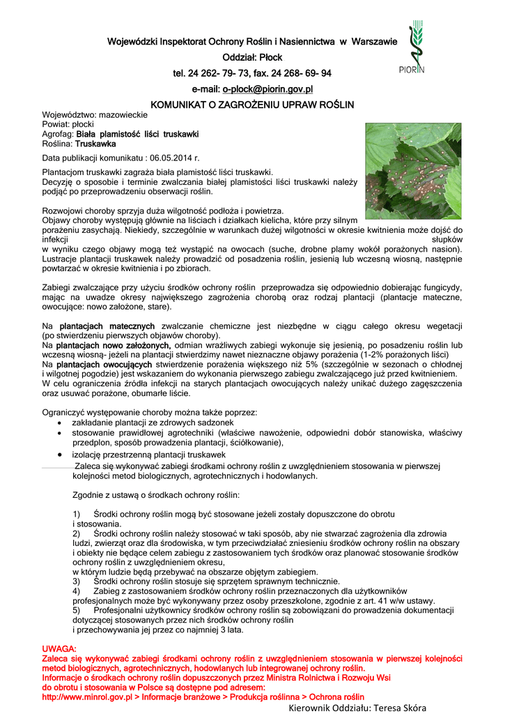 Wojewódzki Inspektorat Ochrony Roślin i Nasiennictwa w Warszawie Oddział: Płock tel. 24 262- 79- 73, fax. 24 268- 69- 94 e-mail: [email protected] KOMUNIKAT O ZAGROŻENIU UPRAW ROŚLIN Województwo: mazowieckie Powiat: płocki Agrofag: Biała plamistość liści truskawki Roślina: Truskawka Data publikacji komunikatu : 06.05.2014 r. Plantacjom truskawki zagraża biała plamistość liści truskawki. Decyzję o sposobie i terminie zwalczania białej plamistości liści truskawki należy podjąć po przeprowadzeniu obserwacji roślin. Rozwojowi choroby sprzyja duża wilgotność podłoża i powietrza. Objawy choroby występują głównie na liściach i działkach kielicha, które przy silnym porażeniu zasychają. Niekiedy, szczególnie w warunkach dużej wilgotności w okresie kwitnienia może dojść do infekcji słupków w wyniku czego objawy mogą też wystąpić na owocach (suche, drobne plamy wokół porażonych nasion). Lustracje plantacji truskawek należy prowadzić od posadzenia roślin, jesienią lub wczesną wiosną, następnie powtarzać w okresie kwitnienia i po zbiorach. Zabiegi zwalczające przy użyciu środków ochrony roślin przeprowadza się odpowiednio dobierając fungicydy, mając na uwadze okresy największego zagrożenia chorobą oraz rodzaj plantacji (plantacje mateczne, owocujące: nowo założone, stare). Na plantacjach matecznych zwalczanie chemiczne jest niezbędne w ciągu całego okresu wegetacji (po stwierdzeniu pierwszych objawów choroby). Na plantacjach nowo założonych, odmian wrażliwych zabiegi wykonuje się jesienią, po posadzeniu roślin lub wczesną wiosną- jeżeli na plantacji stwierdzimy nawet nieznaczne objawy porażenia (1-2% porażonych liści) Na plantacjach owocujących stwierdzenie porażenia większego niż 5% (szczególnie w sezonach o chłodnej i wilgotnej pogodzie) jest wskazaniem do wykonania pierwszego zabiegu zwalczającego już przed kwitnieniem. W celu ograniczenia źródła infekcji na starych plantacjach owocujących należy unikać dużego zagęszczenia oraz usuwać porażone, obumarłe liście. Ograniczyć występowanie choroby można także poprzez: zakładanie plantacji ze zdrowych sadzonek stosowanie prawidłowej agrotechniki (właściwe nawożenie, odpowiedni dobór stanowiska, właściwy przedplon, sposób prowadzenia plantacji, ściółkowanie), izolację przestrzenną plantacji truskawek Zaleca się wykonywać zabiegi środkami ochrony roślin z uwzględnieniem stosowania w pierwszej kolejności metod biologicznych, agrotechnicznych i hodowlanych. Zgodnie z ustawą o środkach ochrony roślin: 1) Środki ochrony roślin mogą być stosowane jeżeli zostały dopuszczone do obrotu i stosowania. 2) Środki ochrony roślin należy stosować w taki sposób, aby nie stwarzać zagrożenia dla zdrowia ludzi, zwierząt oraz dla środowiska, w tym przeciwdziałać zniesieniu środków ochrony roślin na obszary i obiekty nie będące celem zabiegu z zastosowaniem tych środków oraz planować stosowanie środków ochrony roślin z uwzględnieniem okresu, w którym ludzie będą przebywać na obszarze objętym zabiegiem. 3) Środki ochrony roślin stosuje się sprzętem sprawnym technicznie. 4) Zabieg z zastosowaniem środków ochrony roślin przeznaczonych dla użytkowników profesjonalnych może być wykonywany przez osoby przeszkolone, zgodnie z art. 41 w/w ustawy. 5) Profesjonalni użytkownicy środków ochrony roślin są zobowiązani do prowadzenia dokumentacji dotyczącej stosowanych przez nich środków ochrony roślin i przechowywania jej przez co najmniej 3 lata. UWAGA: Zaleca się wykonywać zabiegi środkami ochrony roślin z uwzględnieniem stosowania w pierwszej kolejności metod biologicznych, agrotechnicznych, hodowlanych lub integrowanej ochrony roślin. Informacje o środkach ochrony roślin dopuszczonych przez Ministra Rolnictwa i Rozwoju Wsi do obrotu i stosowania w Polsce są dostępne pod adresem: http://www.minrol.gov.pl > Informacje branżowe > Produkcja roślinna > Ochrona roślin Kierownik Oddziału: Teresa Skóra