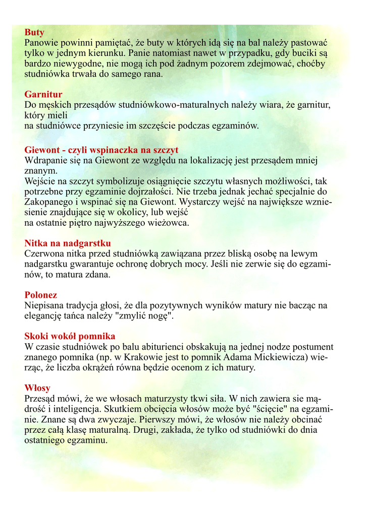 Buty Panowie powinni pamiętać, że buty w których idą się na bal należy pastować tylko w jednym kierunku. Panie natomiast nawet w przypadku, gdy buciki są bardzo niewygodne, nie mogą ich pod żadnym pozorem zdejmować, choćby studniówka trwała do samego rana. Garnitur Do męskich przesądów studniówkowo-maturalnych należy wiara, że garnitur, który mieli na studniówce przyniesie im szczęście podczas egzaminów. Giewont - czyli wspinaczka na szczyt Wdrapanie się na Giewont ze względu na lokalizację jest przesądem mniej znanym. Wejście na szczyt symbolizuje osiągnięcie szczytu własnych możliwości, tak potrzebne przy egzaminie dojrzałości. Nie trzeba jednak jechać specjalnie do Zakopanego i wspinać się na Giewont. Wystarczy wejść na największe wzniesienie znajdujące się w okolicy, lub wejść na ostatnie piętro najwyższego wieżowca. Nitka na nadgarstku Czerwona nitka przed studniówką zawiązana przez bliską osobę na lewym nadgarstku gwarantuje ochronę dobrych mocy. Jeśli nie zerwie się do egzaminów, to matura zdana. Polonez Niepisana tradycja głosi, że dla pozytywnych wyników matury nie bacząc na elegancję tańca należy "zmylić nogę". Skoki wokół pomnika W czasie studniówek po balu abiturienci obskakują na jednej nodze postument znanego pomnika (np. w Krakowie jest to pomnik Adama Mickiewicza) wierząc, że liczba okrążeń równa będzie ocenom z ich matury. Włosy Przesąd mówi, że we włosach maturzysty tkwi siła. W nich zawiera sie mądrość i inteligencja. Skutkiem obcięcia włosów może być "ścięcie" na egzaminie. Znane są dwa zwyczaje. Pierwszy mówi, że włosów nie należy obcinać przez całą klasę maturalną. Drugi, zakłada, że tylko od studniówki do dnia ostatniego egzaminu.