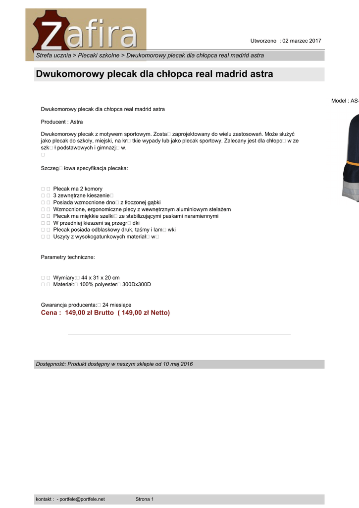 Utworzono : 02 marzec 2017 Strefa ucznia > Plecaki szkolne > Dwukomorowy plecak dla chłopca real madrid astra Dwukomorowy plecak dla chłopca real madrid astra Model : ASDwukomorowy plecak dla chłopca real madrid astra Producent : Astra Dwukomorowy plecak z motywem sportowym. Zosta�zaprojektowany do wielu zastosowań. Może służyć jako plecak do szkoły, miejski, na kr�tkie wypady lub jako plecak sportowy. Zalecany jest dla chłopc�w ze szk�ł podstawowych i gimnazj�w. � Szczeg�łowa specyfikacja plecaka: � Plecak ma 2 komory � 3 zewnętrzne kieszenie� � Posiada wzmocnione dno�z tłoczonej gąbki � Wzmocnione, ergonomiczne plecy z wewnętrznym aluminiowym stelażem � Plecak ma miękkie szelki�ze stabilizującymi paskami naramiennymi � W przedniej kieszeni są przegr�dki � Plecak posiada odblaskowy druk, taśmy i lam�wki � Uszyty z wysokogatunkowych materiał�w� Parametry techniczne: � Wymiary:�44 x 31 x 20 cm � Materiał:�100% polyester�300Dx300D Gwarancja producenta:�24 miesiące Cena : 149,00 zł Brutto ( 149,00 zł Netto) Dostępność: Produkt dostępny w naszym sklepie od 10 maj 2016 kontakt : - [email protected] Strona 1