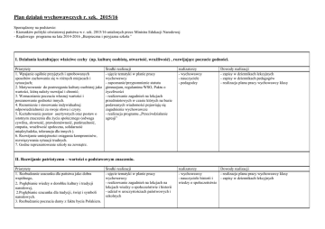 Plan działań wychowawczych r. szk. 2015/16 Sporządzony na podstawie: - Kierunków polityki oświatowej państwa w r. szk. 2015/16 ustalonych przez Ministra Edukacji Narodowej - Rządowego programu na lata 2014-2016 „Bezpieczna i przyjazna szkoła” I. Działania kształtujące właściwe cechy (np. kulturę osobistą, otwartość, wrażliwość) , rozwijające poczucie godności. Priorytety 1. Wpajanie ogólnie przyjętych i aprobowanych sposobów zachowania się w różnych miejscach i sytuacjach; 2. Motywowanie do postrzegania kultury osobistej jako wartości, którą należy rozwijać i chronić; 3. Wzmacnianie poczucia własnej wartości i poszanowanie godności innych. 4. Rozumienie i stosowanie indywidualnej odpowiedzialności za swoje słowa i czyny. 5. Kształtowanie postaw asertywnych oraz postaw o istotnym znaczeniu dla życia społecznego (odwaga cywilna, słowność, prawdomówność, punktualność, empatia, wrażliwość społeczna, solidarność międzyludzka, tolerancja dla innych ). 6. Rozwijanie umiejętności osiągania kompromisów, rozwiązywania sytuacji trudnych. 7. Godne reprezentowanie szkoły na zewnątrz. Środki realizacji - ujęcie tematyki w planie pracy wychowawcy - zapoznanie/przypomnienie statutu gimnazjum, regulaminu WSO, Paktu o życzliwości - realizowanie zagadnień na lekcjach przedmiotowych w czasie których na bazie podawanych wiadomości pojawiają się zagadnienia wychowawcze - realizacja programu „Przeciwdziałanie agresji” realizatorzy - wychowawcy - nauczyciele - pedagodzy Dowody realizacji - zapisy w dziennikach lekcyjnych - zapisy w dziennikach pedagogów - realizacja planu pracy wychowawcy klasy II. Rozwijanie patriotyzmu – wartości o podstawowym znaczeniu. Priorytety 1. Rozbudzanie szacunku dla państwa jako dobra wspólnego, 2. Pogłębianie wiedzy o dorobku kultury i tradycji narodowej, 2.Pogłębianie szacunku dla tradycji, świąt i symboli narodowych. 3. Rozbudzanie poczucia dumy z faktu bycia Polakiem. Środki realizacji - ujęcie tematyki w planie pracy wychowawcy - realizowanie zagadnień na lekcjach na lekcjach wiedzy o społeczeństwie i historii - udział w uroczystościach państwowych i szkolnych realizatorzy Dowody realizacji - wychowawcy - realizacja planu pracy wychowawcy klasy - nauczyciele historii i - zapisy w dziennikach lekcyjnych wiedzy o społeczeństwie III. Kształtowanie właściwych postaw - prospołecznych, prorodzinnych i prozdrowotnych. Profilaktyka uzależnień Priorytety 1. Otwartość szkoły na środowisko lokalne, na kulturę, sztukę, sport, wiedzę. 2. Rozwijanie kompetencji czytelniczych oraz upowszechnianie czytelnictwa wśród dzieci i młodzieży 3. Profilaktyka uzależnień – alkohol, nikotyna, narkotyki i in. środki psychoaktywne. 4. Kształcenie umiejętności radzenia sobie ze stresem i problemami – higiena zdrowia psychicznego. 5. Przeciwdziałanie zagrożeniom społecznym. 6. Promowanie wartości rodziny. 7.Promowanie zdrowego stylu życia, zdrowego odżywiania. 8. Kształtowanie właściwych nawyków higienicznych. Środki realizacji - udział rodziców i przedstawicieli środowiska lokalnego w imprezach i uroczystościach na terenie szkoły; - udział uczniów w imprezach kulturalnych i sportowych, organizowanych przez UM, SZS, MCK itp. - propagowanie czytelnictwa; - realizacja programu profilaktycznego - ujęcie tematyki w planie pracy wychowawcy - realizacja programu wychowawczego - przestrzeganie zasad BHP i regulaminów pracowni przedmiotowych realizatorzy - wychowawcy - nauczyciele - pedagodzy Dowody realizacji - realizacja planu pracy wychowawcy klasy - raport z realizacji programu wychowawczego i profilaktycznego szkoły Środki realizacji - ujęcie tematyki w planie pracy wychowawcy - ocenianie uczniów zgodnie z zasadami WSO - realizacja pomocy psychologiczno pedagogicznej - udział w konkursach i olimpiadach dających młodzieży możliwość przedstawienia swoich osiągnięć, wiedzy i umiejętności - realizacja doradztwa zawodowego - prezentacja projektów realizatorzy - wychowawcy - nauczyciele - pedagodzy - doradca zawodowy - zespoły PPP - opiekunowie grup projektowych Dowody realizacji - realizacja planu pracy wychowawcy klasy - dokumentacja szkoły (obszar – Pomoc Psychologiczno – Pedagogiczna) - raport z realizacji projektów - zapisy w dziennikach lekcyjnych z zakresu doradztwa zawodowego IV. Tworzenie klimatu sprzyjającego uczeniu się. Priorytety 1 Motywowanie do nauki. 2. Zachęcanie do pomocy koleżeńskiej w nauce. 3.Wyposażenie uczniów w efektywne metody i techniki uczenia się. 4. Wspomaganie uczniów o specjalnych potrzebach edukacyjnych. 5.Wspieranie uczniów zdolnych, zachęcanie ich do rozwijania zainteresowań na zajęciach kół przedmiotowych i udziału w konkursach i olimpiadach. 6. Uczenie pracy w grupach podczas pracy nad projektami uczniowskimi. 7. Pomoc w wyborze dalszej edukacji. V. Kształtowanie tolerancji i empatii Priorytety 1. Kształtowanie postaw akceptowanych społecznie, uwrażliwianie na potrzeby i prawa własne oraz innych 2..Poszanowanie dla tradycji i kultur innych narodów. 3. Kształtowanie tolerancji dla ludzi innych ras i wyznań. 4. Pomoc koleżeńska i pomoc osobom potrzebującym. Środki realizacji - docenianie właściwych postaw - ujęcie tematyki w planie pracy wychowawcy - udział uczniów w akcjach charytatywnych - działalność organizacji: Caritas, wolontariat realizatorzy - wychowawcy - opiekunowie akcji charytatywnych i organizacji Dowody realizacji - realizacja planu pracy wychowawcy klasy; - sprawozdanie z przeprowadzonych akcji - sprawozdania z działalności organizacji Środki realizacji - ujęcie tematyki w planie pracy wychowawcy - udział w konkursach ekologicznych: recycling, segregacja odpadów - udział w akcji „sprzątanie świata” - zbiórka surowców wtórnych realizatorzy -wychowawcy -nauczyciele odpowiedzialni za udział uczniów w konkursach, za akcję „sprzątanie świata”
