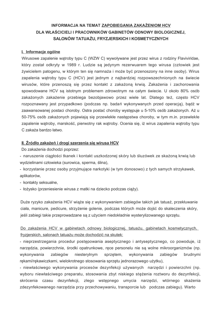 INFORMACJA NA TEMAT ZAPOBIEGANIA ZAKAŻENIOM HCV DLA WŁAŚCICIELI l PRACOWNIKÓW GABINETÓW ODNOWY BIOLOGICZNEJ, SALONÓW TATUAŻU, FRYZJERSKICH l KOSMETYCZNYCH I. Informacje ogólne Wirusowe zapalenie wątroby typu C (WZW C) wywoływane jest przez wirus z rodziny Flaviviridae, który został odkryty w 1989 r. Ludzie są jedynym rezerwuarem tego wirusa (człowiek jest żywicielem patogenu, w którym ten się namnaża i może być przenoszony na inne osoby). Wirus zapalenia wątroby typu C (HCV) jest jednym z najbardziej rozpowszechnionych na świecie wirusów, które przenoszą się przez kontakt z zakażoną krwią. Zakażenia i zachorowania spowodowane HCV są istotnym problemem zdrowotnym na całym świecie. U około 80% osób zakażonych zakażenie przebiega bezobjawowo przez wiele lat. Dlatego też, często HCV rozpoznawany jest przypadkowo (podczas np. badań wykonywanych przed operacją), bądź w zaawansowanej postaci choroby. Ostra postać choroby występuje u 5-10% osób zakażonych. Aż u 50-75% osób zakażonych pojawiają się przewlekłe następstwa choroby, w tym m.in. przewlekłe zapalenie wątroby, marskość, pierwotny rak wątroby. Ocenia się, iż wirus zapalenia wątroby typu C zakaża bardzo łatwo. II. Źródło zakażeń i drogi szerzenia się wirusa HCV Do zakażenia dochodzi poprzez: - naruszenie ciągłości tkanek i kontakt uszkodzonej skóry lub śluzówek ze skażoną krwią lub wydzielinami człowieka (surowica, sperma, ślina), - korzystanie przez osoby przyjmujące narkotyki (w tym donosowo) z tych samych strzykawek, aplikatorów, - kontakty seksualne, - łożysko (przeniesienie wirusa z matki na dziecko podczas ciąży). Duże ryzyko zakażenia HCV wiąże się z wykonywaniem zabiegów takich jak tatuaż, przekłuwanie ciała, manicure, pedicure, strzyżenie golenie, podczas których może dojść do skaleczenia skóry, jeśli zabiegi takie przeprowadzane są z użyciem niedokładnie wysterylizowanego sprzętu. Do zakażenia HCV w gabinetach odnowy biologicznej, tatua żu, gabinetach kosmetycznych, fryzjerskich, salonach tatuażu może dochodzić na skutek: - nieprzestrzegania procedur postępowania aseptycznego i antyseptycznego, co powoduje, iż narzędzia, powierzchnie, środki opatrunkowe, ręce personelu nie są wolne mikroorganizmów (np. wykonywania zabiegów niesterylnym sprzętem, wykonywania zabiegów brudnymi rękami/rękawiczkami, wielokrotnego stosowania sprzętu jednorazowego użytku), - niewłaściwego wykonywania procesów dezynfekcji używanych narzędzi i powierzchni (np. wyboru niewłaściwego preparatu, stosowania zbyt niskiego stężenia roztworu do dezynfekcji, skrócenia czasu dezynfekcji, złego wstępnego umycia narzędzi, wtórnego skażenia zdezynfekowanego narzędzia przy przechowywaniu, transporcie lub podczas zabiegu). Warto pamiętać, że HCV wykazuje dużą wrażliwość na środki i metody dezynfekcyjne, pod warunkiem, że proces dezynfekcji jest odpowiednio przeprowadzony. - niewłaściwego wykonywania procesów sterylizacji (np. rezygnacji ze sterylizacji narzędzi ostrych po zabiegu przebiegającym z naruszeniem ciągłości skóry, używania niesprawnej aparatury, rezygnacja z czynności koniecznych do wykonania przed procesem sterylizacji jak wstępne umycie i dezynfekcja narzędzi, sterylizowanie jednocześnie zbyt dużej liczby narzędzi). III. Zapobieganie zakażeniom HCV w gabinetach odnowy biologicznej, salonach tatuaży, fryzjerskich, kosmetycznych itp.: Bezpieczeństwa zabiegów przebiegających z naruszeniem ciągłości tkanek można zapewnić poprzez m.in.: - przestrzeganie zasad aseptycznego postępowania personelu (np. dokładne mycie i dezynfekowanie dłoni, dezynfekowanie i sterylizacja narzędzi używanych w zabiegach przebiegających z naruszeniem ciągłości tkanek), - utrzymanie czystości pomieszczeń (np, dezynfekcja i mycie powierzchni, odpowiednio zorganizowana praca w gabinecie poprzez wyznaczenie tzw. strefy brudnej i czystej), - używanie sprzętu jednorazowego użytku, używanie sprzętu wielokrotnego użytku prawidłowo wysterylizowanego do zabiegów przebiegających z naruszeniem ciągłości tkanek lub w sytuacji, gdy istnieje ryzyko skaleczenia np. podczas golenia, wycinania skórek itp. Wdrożenie i stosowanie procedur zapewniających ochronę przed zakażeniami oraz chorobami zakaźnymi przez osoby inne niż udzielające świadczeń zdrowotnych, w trakcie wykonywania których dochodzi do naruszenia ciągłości tkanek ludzkich jest obowiązkiem wynikającym z art.16 ustawy z dnia 5 grudnia 2008 r. o zapobieganiu oraz zwalczaniu zakażeń i chorób zakaźnych u ludzi (Dz. U. Nr. 234, póz. 1570 z późn. zm.). Procedury te powinny regulować: - sposób postępowania przy wykonywaniu czynności, w trakcie których dochodzi do naruszenia ciągłości tkanek ludzkich, - zasady stosowania sprzętu poddawanego sterylizacji, - sposoby przeprowadzania dezynfekcji skóry i błon śluzowych, - zasady dekontaminacji, czyli procesu niszczenia biologicznych czynnik ów chorobotwórczych przez mycie, dezynfekcję i sterylizację pomieszczeń i urządzeń. PRZECIĘCIE DRÓG SZERZENIA ZAKAŻENIA HCV JEST JEDNYM Z PODSTAWOWYCH DZIAŁAŃ MOGĄCYCH SKUTKOWAĆ ZMNIEJSZENIEM LICZBY NOWOPOJAWIAJĄCYCH SIĘ ZACHOROWAŃ !!!!!!! Jeśli mają Państwo pytania lub wątpliwości należy skontaktować się z Powiatową Stacją Sanitarno–Epidemiologiczną w Bełchatowie.