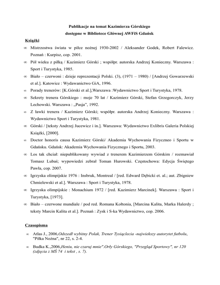 Publikacje na temat Kazimierza Górskiego dostępne w Bibliotece Głównej AWFiS Gdańsk Książki • Mistrzostwa świata w piłce nożnej 1930-2002 / Aleksander Godek, Robert Falewicz. Poznań : Kurpisz, cop. 2001. • Pół wieku z piłką / Kazimierz Górski ; współpr. autorska Andrzej Konieczny. Warszawa : Sport i Turystyka, 1985. • Biało – czerwoni : dzieje reprezentacji Polski. (3), (1971 – 1980) / [Andrzej Gowarzewski et al.]. Katowice : Wydawanictwo GiA, 1996. • Porady trenerów: [K.Górski et al.],Warszawa :Wydawnictwo Sport i Turystyka, 1978. • Sekrety trenera Górskiego : moje 70 lat / Kazimierz Górski, Stefan Grzegorczyk, Jerzy Lechowski. Warszawa : „Pasja”, 1992. Z ławki trenera / Kazimierz Górski; współpr. autorska Andrzej Konieczny. Warszawa : • Wydawnictwo Sport i Turystyka, 1981. • Górski / [teksty Andrzej Jucewicz i in.]. Warszawa: Wydawnictwo Exlibris Galeria Polskiej Książki, [2000]. Doctor honoris causa Kazimierz Górski/ Akademia Wychowania Fizyczneo i Sportu w • Gdańsku. Gdańsk: Akademia Wychowania Fizycznego i Sportu, 2003. • Los tak chciał: niepublikowany wywiad z trenerem Kazimierzem Górskim / rozmawiał Tomasz Lubaś; wypowiedzi zebrał Toman Hurowski. Częstochowa: Edycja Świętego Pawła, cop. 2007. • Igrzyska olimpijskie 1976 : Insbruk, Montreal / [red. Edward Dębicki et. al.; aut. Zbigniew Chmielewski et al.]. Warszawa : Sport i Turystyka, 1978. • Igrzyska olimpijskie : Monachium 1972 / [red. Kazimierz Marcinek]. Warszawa : Sport i Turystyka, [1973]. • Biało – czerwone mundiale / pod red. Romana Kołtonia, [Marcina Kalita, Marka Halerdy ; teksty Marcin Kalita et al.]. Poznań : Zysk i S-ka Wydawnictwo, cop. 2006. Czasopisma • Atlas J., 2006,Odszedł wybitny Polak, Trener Tysiąclecia -najwiekszy autorytet futbolu, "Piłka Nożna", nr 22, s. 2-4. • Budka K.,2006,Heniu, nie czaruj mnie".Orły Górskiego, "Przegląd Sportowy", nr 120 (zdjęcia z MŚ 74 i tekst , s. 7). • Dębicki E.(red.), 1978, Igrzyska Olimpijskie 1976 : Insbruk, Montreal, Sport i Turystyka, Warszawa, s. 224-234. • Grzegorczyk J.,2006,Tylko Bozia daje takie skarby, "Przegląd Sportowy", nr 120, s. 4-5. • Kołodziejczyk M.,2006, Wielkie mecze : Anglia, Argentyna, Włochy, Brazylia, Holandia te potegi musiały uznać wyższośc trenera tysiąclecia; Piłkarski świat u naszych stóp, nr 120, s 8-9. • Kotłoń R.,2006,Słynne wypowiedzi Kazimierza Górskiego; komentarz, "Przegląd Sportowy", nr 120,s.2. • Kotłoń R., Tuzimek T., 2006,Znałem ich wszystkich .Ostatni wywiad z Kazimierzem Górskim, "Przegląd Sportowy", nr 120,(zdjęcia i tekst,s. 2-3). • Mroziński Z.,2006,Ważne daty z życia pana Kazimierza", "Piłka Nożna" nr 22, s.6-7 • Mroziński Z., 2006, Wywiad z Janem Tomaszewskim, "Piłka Nożna" nr 22, s.5.