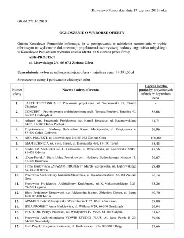 Kowalewo Pomorskie, dnia 17 czerwca 2013 roku GKiM.271.10.2013 OGŁOSZENIE O WYBORZE OFERTY Gmina Kowalewo Pomorskie informuje, że w postępowaniu o udzielenie zamówienia w trybie ofertowym na wykonanie dokumentacji projektowo-kosztorysowej budowy targowiska miejskiego w Kowalewie Pomorskim wybrana została oferta nr 5 złożona przez firmę: ABK-PROJEKT ul. Lisowskiego 2/4, 65-072 Zielona Góra Uzasadnienie wyboru: najkorzystniejsza oferta - najniższa cena: 14.391,00 zł Streszczenie oceny i porównanie złożonych ofert Łączna liczba punktów przyznanych ofercie w kryterium cena Numer oferty Nazwa i adres oferenta 1. „ARCHITECTONICA II” Pracownia projektowa, ul. Warszawska 27, 89-620 Chojnice - 2. CONCEPT – Projektowanie architektoniczne arch. Tomasz Porębny, Turznice 40, 86-302 Grudziądz 4 58,08 3. AthenA Art. Pracownia Projektowa inż. Kamil Roszczyc, ul. Kazanowskiego 24/20, 17-100 Bielsk Podlaski 41,71 4. Projektowanie i Nadzory Budowlane Kamil Maciejewski, ul. Księżycowa 4, 87-400 Golub-Dobrzyń 76,96 5. ABK-PROJEKT, ul. Lisowskiego 2/4, 65-072 Zielona Góra 100,00 6. GEOTECHNICA Sp. z o.o. Toruń, ul. Kościuszki 49d, 87-100 Toruń 35,45 7. Studio 4M Architekci s.c. L. Łubowska, Z. Wesołowska, ul. Kaczewska 22B/7, 81-476 Gdynia 47,56 8. „Dom-Projekt” Biuro Usług Projektowych i Nadzoru Budowlanego, Mszano 13, 87-300 Brodnica 79,07 9. Firma Budowlana „MAZAM-PROJEKT” Marek Zdrojewski, ul. Dąbrowskiego 6a, 14-200 Iława 29,40 10. Pracownia Architektury Kuźmiak&Kuźmiak, ul. Kasztanowa8a/4, 65-381 Zielona Góra 76,14 11. Pracownia Projektowa Architektury Krajobrazu, ul. K. Makuszyńskiego 7/21, 59-220 Legnica 63,26 12. Biuro Projektów Drogowych s.c. Aleksandra Jaczun, Zbigniew Dorau, ul. Bema 16/8, 87-100 Toruń 60,70 13. APM-BIN Piotr Mikołajewski, Wierzchucinek 27, 86-014 Sicienko 39,00 14. IDEA PROJEKT Anna Markiewicz, ul. Wiślana 9/29, 86-300 Grudziądz 99,94 15. PP STUDIO Patryk Pniewski, ul. Władysława IV 59/26, 81-384 Gdynia 31,62 16. Pracownia Architektoniczna VOWIE STUDIO PLUS, Al. Jana Pawła II 20, 64-500 Szamotuły 39,56 17. Euro Projekt Zbigniew Kuśmierz, ul. Królewiecka 195a, 82-300 Elbląg 39,66 Oferta nr 1 nie została oceniona ze względu na brak wpłaty wadium. Otrzymują: 1. 2. 3. 4. 5. 6. 7. 8. 9. 10. 11. 12. 13. 14. 15. 16. 17. „ARCHITECTONICA II” pracownia projektowa, ul. Warszawska 27, 89-620 Chojnice CONCEPT–Projektowanie architektoniczne arch. Tomasz Porębny, Turznice 40, 86-302 Grudziądz 4 AthenA Art. Pracownia Projektowa, ul. Kazanowskiego 24/20, 17-100 Bielsk Podlaski Projektowanie i Nadzory Budowlane Kamil Maciejewski, ul. Księżycowa 4, 87-400 Golub-Dobrzyń ABK-PROJEKT, ul. Lisowskiego 2/4, 65-072 Zielona Góra GEOTECHNICA Sp. z o.o. Toruń, ul. Kościuszki 49d, 87-100 Toruń Studio 4M Architekci s.c. L. Łubowska, Z. Wesołowska, ul. Kaczewska 22B/7, 81-476 Gdynia „Dom-Projekt” Biuro Usług Projektowych i Nadzoru Budowlanego, Mszano 13, 87-300 Brodnica Firma Budowlana „MAZAM-PROJEKT” Marek Zdrojewski, ul. Dąbrowskiego 6a, 14-200 Iława Pracownia Architektury Kuźmiak&Kuźmiak, ul. Kasztanowa8a/4, 65-381 Zielona Góra Pracownia Projektowa Architektury Krajobrazu, ul. K. Makuszyńskiego 7/21, 59-220 Legnica Biuro Projektów Drogowych s.c. Aleksandra Jaczun, Zbigniew Dorau, ul. Bema 16/8, 87-100 Toruń APM-BIN Piotr Mikołajewski, Wierzchucinek 27, 86-014 Sicienko IDEA PROJEKT Anna Markiewicz, ul. Wiślana 9/29, 86-300 Grudziądz PP STUDIO Patryk Pniewski, ul. Władysława IV 59/26, 81-384 Gdynia Pracownia Architektoniczna VOWIE STUDIO PLUS, Al. Jana Pawła II 20, 64-500 Szamotuły Euro Projekt Zbigniew Kuśmierz, ul. Królewiecka 195a, 82-300 Elbląg K. Krzywdzińska z up. Burmistrza /-/ mgr inż. Ilona Rybicka Doradca-Pełnomocnik Burmistrza