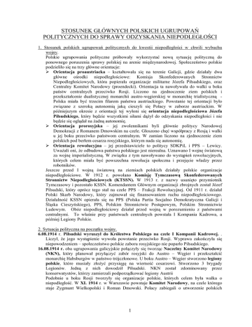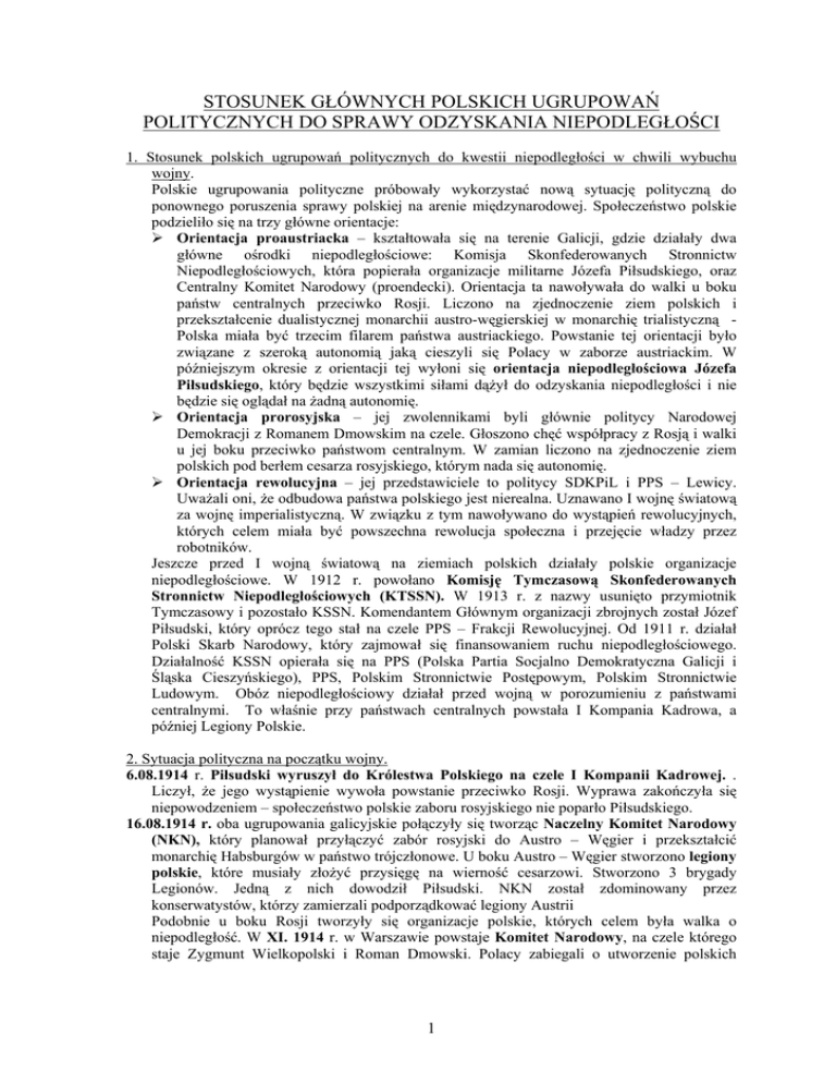 STOSUNEK GŁÓWNYCH POLSKICH UGRUPOWAŃ POLITYCZNYCH DO SPRAWY ODZYSKANIA NIEPODLEGŁOŚCI 1. Stosunek polskich ugrupowań politycznych do kwestii niepodległości w chwili wybuchu wojny. Polskie ugrupowania polityczne próbowały wykorzystać nową sytuację polityczną do ponownego poruszenia sprawy polskiej na arenie międzynarodowej. Społeczeństwo polskie podzieliło się na trzy główne orientacje: Orientacja proaustriacka – kształtowała się na terenie Galicji, gdzie działały dwa główne ośrodki niepodległościowe: Komisja Skonfederowanych Stronnictw Niepodległościowych, która popierała organizacje militarne Józefa Piłsudskiego, oraz Centralny Komitet Narodowy (proendecki). Orientacja ta nawoływała do walki u boku państw centralnych przeciwko Rosji. Liczono na zjednoczenie ziem polskich i przekształcenie dualistycznej monarchii austro-węgierskiej w monarchię trialistyczną Polska miała być trzecim filarem państwa austriackiego. Powstanie tej orientacji było związane z szeroką autonomią jaką cieszyli się Polacy w zaborze austriackim. W późniejszym okresie z orientacji tej wyłoni się orientacja niepodległościowa Józefa Piłsudskiego, który będzie wszystkimi siłami dążył do odzyskania niepodległości i nie będzie się oglądał na żadną autonomię. Orientacja prorosyjska – jej zwolennikami byli głównie politycy Narodowej Demokracji z Romanem Dmowskim na czele. Głoszono chęć współpracy z Rosją i walki u jej boku przeciwko państwom centralnym. W zamian liczono na zjednoczenie ziem polskich pod berłem cesarza rosyjskiego, którym nada się autonomię. Orientacja rewolucyjna – jej przedstawiciele to politycy SDKPiL i PPS – Lewicy. Uważali oni, że odbudowa państwa polskiego jest nierealna. Uznawano I wojnę światową za wojnę imperialistyczną. W związku z tym nawoływano do wystąpień rewolucyjnych, których celem miała być powszechna rewolucja społeczna i przejęcie władzy przez robotników. Jeszcze przed I wojną światową na ziemiach polskich działały polskie organizacje niepodległościowe. W 1912 r. powołano Komisję Tymczasową Skonfederowanych Stronnictw Niepodległościowych (KTSSN). W 1913 r. z nazwy usunięto przymiotnik Tymczasowy i pozostało KSSN. Komendantem Głównym organizacji zbrojnych został Józef Piłsudski, który oprócz tego stał na czele PPS – Frakcji Rewolucyjnej. Od 1911 r. działał Polski Skarb Narodowy, który zajmował się finansowaniem ruchu niepodległościowego. Działalność KSSN opierała się na PPS (Polska Partia Socjalno Demokratyczna Galicji i Śląska Cieszyńskiego), PPS, Polskim Stronnictwie Postępowym, Polskim Stronnictwie Ludowym. Obóz niepodległościowy działał przed wojną w porozumieniu z państwami centralnymi. To właśnie przy państwach centralnych powstała I Kompania Kadrowa, a później Legiony Polskie. 2. Sytuacja polityczna na początku wojny. 6.08.1914 r. Piłsudski wyruszył do Królestwa Polskiego na czele I Kompanii Kadrowej. . Liczył, że jego wystąpienie wywoła powstanie przeciwko Rosji. Wyprawa zakończyła się niepowodzeniem – społeczeństwo polskie zaboru rosyjskiego nie poparło Piłsudskiego. 16.08.1914 r. oba ugrupowania galicyjskie połączyły się tworząc Naczelny Komitet Narodowy (NKN), który planował przyłączyć zabór rosyjski do Austro – Węgier i przekształcić monarchię Habsburgów w państwo trójczłonowe. U boku Austro – Węgier stworzono legiony polskie, które musiały złożyć przysięgę na wierność cesarzowi. Stworzono 3 brygady Legionów. Jedną z nich dowodził Piłsudski. NKN został zdominowany przez konserwatystów, którzy zamierzali podporządkować legiony Austrii Podobnie u boku Rosji tworzyły się organizacje polskie, których celem była walka o niepodległość. W XI. 1914 r. w Warszawie powstaje Komitet Narodowy, na czele którego staje Zygmunt Wielkopolski i Roman Dmowski. Polacy zabiegali o utworzenie polskich 1 oddziałów u boku armii rosyjskiej. Utworzono jedynie Legion Puławski, który istniał do października 1915 roku. 3. Sytuacja polityczna po zajęciu Królestwa Polskiego przez państwa centralne. W 1915 roku wojska państw centralnych wkroczyły do Królestwa Polskiego. Polacy zaczęli liczyć na autonomię, tym bardziej że wojska okupacyjne zezwalały na działalność polskich organizacji, stowarzyszeń i instytucji. Zezwolono na otwarcie Uniwersytetu warszawskiego i Politechniki Warszawskiej. Zezwalano na obchodzenie polskich świat narodowych (np. rocznicy Konstytucji 3 Maja). Część polskich organizacji opowiedziała się za współpracą z okupantem (państwami centralnymi). Były to: Naczelny Komitet Narodowy, Polska Partia Socjalistyczna, Liga Państwowości Polskiej i Polskie Stronnictwo Ludowe – „Wyzwolenie”. Skutkiem tego była działalność Departamentu Wojskowego NKN na czele z Władysławem Sikorskim, który działał na rzecz zwiększenia liczebności Legionów, zgodnie z interesem państw centralnych. Józef Piłsudski przestał wierzyć w odzyskanie niepodległości dzięki państwom zaborczym, które mimo zajęcia Królestwa Polskiego nie składały żadnych konkretnych obietnic i nie wcielały uprzednich w życie Józef Piłsudski obawiał się, że Legiony staną się narzędziem w ręku państw centralnych. Zaczął dbać o rozwój konspiracyjnej Polskiej Organizacji Woskowej (POW). Jej członkowie po zajęciu Królestwa nie wstąpili do legionów tylko nadal rozwijali swoją organizację. Polacy przestali wstępować do Legionów, które liczyły kilkanaście tysięcy ludzi. W lipcu 1916 r. Piłsudski podał się do dymisji wycofując się formalnie z legionów. 12.09.1916 – Dowództwo austriackie przyjęło dymisję Józefa Piłsudskiego, dowódcy I Brygady Legionów Polskich 4. Sytuacja po Akcie 5 listopada 1916 r. Sytuacja polityczna uległa zmianie na jesieni 1916 r. gdy okazało się, że nie uda się szybko zakończyć działa