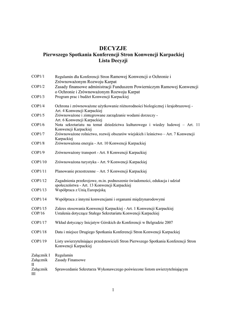 DECYZJE Pierwszego Spotkania Konferencji Stron Konwencji Karpackiej Lista Decyzji COP1/1 COP1/2 Regulamin dla Konferencji Stron Ramowej Konwencji o Ochronie i ZrównowaŜonym Rozwoju Karpat Zasady finansowe administracji Funduszem Powierniczym Ramowej Konwencji o Ochronie i ZrównowaŜonym Rozwoju Karpat COP1/3 Program prac i budŜet Konwencji Karpackiej COP1/4 COP1/8 Ochrona i zrównowaŜone uŜytkowanie róŜnorodności biologicznej i krajobrazowej Art. 4 Konwencji Karpackiej ZrównowaŜone i zintegrowane zarządzanie wodami dorzeczy Art. 6 Konwencji Karpackiej Nota sekretariatu na temat dziedzictwa kulturowego i wiedzy ludowej – Art. 11 Konwencji Karpackiej ZrównowaŜone rolnictwo, rozwój obszarów wiejskich i leśnictwo – Art. 7 Konwencji Karpackiej ZrównowaŜona energia - Art. 10 Konwencji Karpackiej COP1/9 ZrównowaŜony transport - Art. 8 Konwencji Karpackiej COP1/10 ZrównowaŜona turystyka - Art. 9 Konwencji Karpackiej COP1/11 Planowanie przestrzenne – Art. 5 Konwencji Karpackiej COP1/12 COP1/13 Zagadnienia przekrojowe, m.in. podnoszenie świadomości, edukacja i udział społeczeństwa - Art. 13 Konwencji Karpackiej Współpraca z Unią Europejską COP1/14 Współpraca z innymi konwencjami i organami międzynarodowymi COP1/15 COP/16 Zakres stosowania Konwencji Karpackiej - Art. 1 Konwencji Karpackiej Ustalenia dotyczące Stałego Sekretariatu Konwencji Karpackiej COP1/17 Wkład dotyczący Inicjatyw Górskich do Konferencji w Belgradzie 2007 COP1/18 Data i miejsce Drugiego Spotkania Konferencji Stron Konwencji Karpackiej COP1/19 Listy uwierzytelniające przedstawicieli Stron Pierwszego Spotkania Konferencji Stron Konwencji Karpackiej Załącznik I Załącznik II Załącznik III Regulamin Zasady Finansowe COP1/5 COP1/6 COP1/7 Sprawozdanie Sekretarza Wykonawczego poświecone listom uwierzytelniającym 1 Decyzja COP1/1 4 punkt porządku obrad Regulamin Konferencji Stron Konferencja Stron postanawia przyjąć regulamin spotkań Konferencji Stron Konwencji Karpackiej zgodnie z treścią Załącznika I. Decyzja COP1/2 5 punkt porządku obrad Zasady finansowe Konwencji Karpackiej Konferencja Stron postanawia przyjąć Zasady Finansowe administracji Funduszem Powierniczym Ramowej Konwencji o Ochronie i ZrównowaŜonym Rozwoju Karpat, zgodnie z treścią Załącznika II, z zaznaczeniem, Ŝe budŜet w Załączniku do Zasad Finansowych moŜe zostać złoŜony wyłącznie po dokonaniu ustaleń dotyczących kształtu i lokalizacji Stałego Sekretariatu, a skala wkładów finansowych jest ustalana w kontekście decyzji COP1/3 o programie pracy i budŜecie Konwencji Karpackiej. Decyzja COP1/3 6 punkt porządku obrad Program prac i budŜet Konwencji Karpackiej 1. wita z uznaniem i przyjmuje program prac Konwencji Karpackiej zawarty w Załączniku I UNEP/CC/COP1/4; 2. wita z uznaniem i popiera Projekt Karpacki INTERREG IIIB CADSES UE jako dobre tło dla opracowania programu prac oraz jako istotne narzędzie wspomagające wdraŜanie Konwencji Karpackiej, zgodnie z treścią Załącznika II UNEP/CC/COP1/4; 3. ponadto wita z uznaniem dodatkowe działania związane z Konwencją Karpacką przedstawione w Załączniku III UNEP/CC/COP1/4; 4. postanawia utworzyć Komitet WdroŜeniowy Konwencji Karpackiej zgodnie z art. 14 (e) Konwencji Karpackiej, jako organ pomocniczy, i zwraca się do tymczasowego Sekretariatu o przygotowanie powiązanego zakresu wymagań i obowiązków do zatwierdzenia przez Biuro; 5. zwraca się do tymczasowego Sekretariatu o przygotowanie pierwszego spotkania, a ponadto w szczególności o obsługę i wspieranie prac Komitetu WdroŜeniowego Konwencji Karpackiej, poniewaŜ odnosi się do nadzoru nad tworzeniem i zwoływaniem Grup Roboczych, ich zakresów wymagań i obowiązków oraz działań; 6. zwraca się do tymczasowego Sekretariatu o zapewnienie ciągłej wymiany i wzajemnej łączności pomiędzy pracami i działaniami w ramach Komitetu WdroŜeniowego Konwencji Karpackiej a pracami i działaniami zawartymi w Projekcie Karpackim INTERREG IIIB CADSES Unii Europejskiej; 7. podkreśla znaczenie bieŜącego interaktywnego procesu na rzecz przygotowania raportu Perspektywa Środowiska Karpackiego (Carpathian Environment Outlook, KEO), który przyniesie holistyczną i zintegrowaną ocenę obecnego stanu i przyszłych trendów środowiska Karpat. Będąc dokumentem przekrojowym, obejmującym kluczowe zagadnienia ochrony 2 środowiska i powiązane zagadnienia społeczno-gospodarcze regionu, KEO będzie stanowił wsparcie naukowe i zawierał wskazówki dla wdraŜania Konwencji Karpackiej; 8. postanawia, Ŝe państwa karpackie wniosą wkład finansowy na pokrycie zasadniczych kosztów programu prac Konwencji Karpackiej w całkowitej wysokości 139.000,00 € rocznie. 9. potwierdza dobrowolne wkłady finansowe wnoszone przez Strony-Sygnatariuszy Konwencji Karpackiej od 2004 r., a takŜe zachęca Strony, które takowych wkładów nie wniosły, do wpłacenia dobrowolnej składki za 2006 r. 10. zaleca poniŜszą proponowaną skalę dla podziału całkowitego wkładu finansowego pomiędzy państwami karpackimi: Państwo Rok 2007 21.500,00 21.500,00 21.500,00 21.500,00 10.000,00 21.500,00 21.500,00 139.000,00 Czechy Węgry Polska Rumunia Serbia Słowacja Ukraina SUMA € Rok 2008 21.500,00 21.500,00 21.500,00 21.500,00 10.000,00 21.500,00 21.500,00 139.000,00 11, zwraca się do tymczasowego Sekretariatu o opracowanie i przekazanie Stronom Konwencji Karpackiej rocznych raportów finansowych, a takŜe opracowanie i przedłoŜenie całościowego raportu finansowego do COP2. Decyzja COP1/4 6 punkt porządku obrad Program prac i budŜet Konwencji Karpackiej Punkt 6 (a) porządku obrad po adnotacji Ochrona i zrównowaŜone uŜytkowanie róŜnorodności biologicznej i krajobrazowej Art. 4 Konwencji Karpackiej Konferencja Stron 1, postanawia udzielić poparcia dla utworzenia Grupy Roboczej ds. ochrony i zrównowaŜonego uŜytkowania róŜnorodności biologicznej i krajobrazowej w ramach Komit