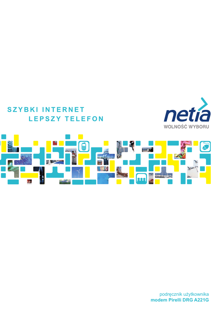 SZYBKI INTERNET S Z Y BLKEI PI S NZ TY E RTNEEL TE F O N LEPSZY TELEFON podręcznik użytkownika modem Pirelli DRG A221G Spis treści Wymagania techniczne 3 Zawartość pakietu 4 Instalacja modemu 5 1. Uruchomienie pakietu usług Szybki Internet i Lepszy Telefon 6 2. Uruchomienie usługi Szybki Internet 9 Podłączenie komputera do modemu przez sieć Wi-Fi 12 Pytania i odpowiedzi 16 Warunki gwarancji pakietu instalacyjnego 28 Kontakt z nami 31 2 Szanowni Państwo, dziękujemy za okazane nam zaufanie i wybór oferty Netii. Jesteśmy przekonani, że korzystanie z naszych usług przyniesie Państwu wiele satysfakcji. Nieustannie wprowadzamy nowe usługi telekomunikacyjne, podwyższamy standardy obsługi, wszystko to przy zachowaniu najwyższej jakości usług. Niniejszy podręcznik ułatwi Państwu prawidłową instalację modemu Pirelli DRG A221G. Do przeprowadzenia instalacji modemu i korzystania z usług Netii niezbędne są: 3 aktywna usługa Szybki Internet lub pakiet usług Szybki Internet i Lepszy Telefon 3 komputer PC lub MAC z kartą sieciową Ethernet lub kartą Wi-Fi, zgodną ze standardem 802.11b/g 3 włączona opcja automatycznego pobierania adresu IP przez komputer (jest to ustawienie standardowe systemu operacyjnego np. Microsoft Windows XP/Vista) 3 przeglądarka internetowa (np. Internet Explorer 5.5 lub nowszy) 3 aparat telefoniczny z wybieraniem tonowym. Instalację modemu należy przeprowadzić w terminie wskazanym telefonicznie przez Netię. O terminie podłączenia modemu informujemy swoich Abonentów z kilkudniowym wyprzedzeniem. Jeżeli korzystali Państwo z usług innego operatora stacjonarnego, prosimy zainstalować modem Netii dopiero po wyłączeniu dotychczas posiadanych usług. Oznaką wyłączenia usług będzie brak możliwości wykonania połączenia telefonicznego lub brak możliwości połączenia z internetem. Uwaga: podłączenie modemu przed wyłączeniem usług poprzedniego operatora będzie skutkować brakiem dostępu zarówno do usług Netii, jak i zakłóceniami w dotychczas wykorzystywanych usługach. 3 W skład pakietu instalacyjnego wchodzą: modem Pirelli DRG A221G zasilacz 230V płyta CD z dokumentacją techniczną kabel Ethernet kabel telefoniczny (szary) podręcznik użytkownika rozdzielacz sygnału mikrofiltr 4 Instalacja modemu Pirelli DRG A221G Podręcznik opisuje czynności, które należy wykonać w celu przeprowadzenia prawidłowej instalacji modemu. Wystarczy podłączyć modem zgodnie z poniższą instrukcją i po kilku minutach można już korzystać z naszych usług. Przed rozpoczęciem instalacji prosimy o zapoznanie się z poniższymi zaleceniami: 3 Modem Pirelli DRG A221G należy podłączyć do gniazdka telefonicznego, na którym aktywne są usługi Netii. 3 Jeżeli do gniazdka telefonicznego podłączony jest aparat lub modem, to przed rozpoczęciem instalacji prosimy o odłączenie tego urządzenia. 3 Sposób instalacji jest uzależniony od zakresu zawartej umowy: – gdy umowa dotyczy pakietu Szybki Internet i Lepszy Telefon: • bezpośrednio do gniazdka telefonicznego należy podłączyć modem • telefon (lub fax) należy podłączyć do gniazdka Phone w modemie. W przypadku, gdy do linii telefonicznej podłączony jest drugi aparat telefoniczny (lub fax), konieczne będzie przepięcie tego urządzenia do modemu. W tym celu proponujemy wykorzystanie rozdzielacza sygnału telefonicznego. Podłączenie rozdzielacza do gniazda Phone w modemie, umożliwi podzielenie sygnału telefonicznego na dwa urządzenia, które będą dostępne pod tym samym numerem. Jeżeli do korzystania z usługi Lepszy Telefon zamierzają Państwo wykorzystać aparaty stacjonarne, podłączone do instalacji telefonicznej w innych pomieszczeniach, wymagane będzie przepięcie całej instalacji do gniazdka Phone w modemie. Zmiany w instalacji można wykonać samodzielnie lub skorzystać z pomocy technicznej wyspecjalizowanych firm instalacyjnych. Szczegółowe informacje o sposobie podłączenia kilku aparatów telefonicznych do linii Netii, znajdą Państwo na końcu podręcznika w rozdziale „Pytania i odpowiedzi”. Pragniemy zwrócić uwagę, że gdy telefon pozostanie podłączony bezpośrednio do linii, na której są aktywne usługi telefoniczne innego operatora, to połączenia wykonane z tego aparatu będą nadal rozliczane przez tego operatora. – gdy umowa dotyczy usługi Szybki Internet: • do gniazdka telefonicznego podłączamy najpierw rozdzielacz sygnału a następnie modem • telefon (lub fax) należy podłączyć poprzez mikrofiltr do rozdzielacza sygnału • inne aparaty należy podłączyć do linii telefonicznej poprzez mikrofiltry – dotyczy pozostałych gniazdek w instalacji telefonicznej. 3 Uruchomienie usługi z wykorzystaniem modemu Pirelli DRG A221G nie wymaga jakiejkolwiek konfiguracji ze strony użytkownika. Po podłączeniu modemu do sieci urządzenie zostanie automatycznie skonfigurowane i po kilku minutach będzie gotowe do użycia. 3 Do uruchomienia usługi nie jest konieczne korzystanie z komputera. Komputer można podłączyć po zakończeniu instalacji. 3 Zalecamy, aby modem był stale włączony – dzięki temu Państwa telefon będzie zawsze osiągalny. W zależności od zakresu umowy prosimy o przeprowadzenie instalacji według jednego z poniższych punktów: 1. Uruchomienie pakietu usług Szybki Internet i Lepszy Telefon lub 2. Uruchomienie usługi Szybki Internet. 5 1. Uruchomienie pakietu usług Szybki Internet i Lepszy Telefon Poniżej przedstawiono sposób uruchomienia usługi Szybki Internet i Lepszy Telefon wraz z opisem podłączenia komputera stacjonarnego lub laptopa do modemu poprzez połączenie przewodowe (kabel Ethernet). Podłączenie komputera do modemu poprzez sieć bezprzewodową Wi-Fi jest opisane w dalszej części podręcznika. Krok 1. Podłączenie modemu Prosimy podłączyć modem, aparat telefoniczny oraz komputer zgodnie z poniższym schematem: gniazdko telefoniczne gniazdo Ethernet 