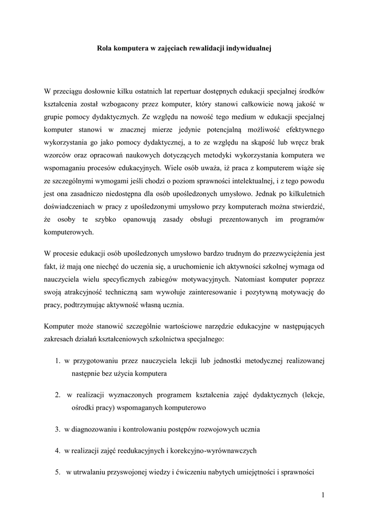 1 Rola komputera w zajęciach rewalidacji indywidualnej W