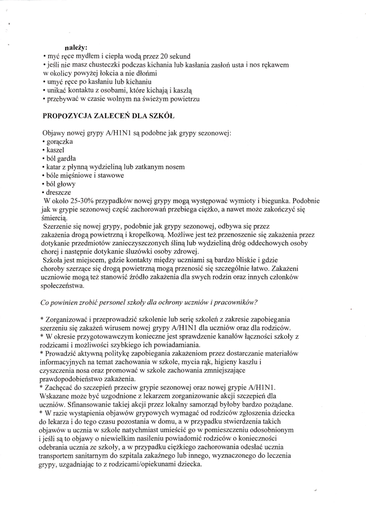 naleĘz . myć ręce mydłem i ciepła wodąprzez2O sekund . jeślinie masz chusteczki podczas kichania lub kasłania zasłoń usta i nos rękawem w okolicy powyżej łokcia a nie dłońmi . umyc ręce po kasłaniu lub kichaniu . unikać kontaktu z osobami, które kichająi kaszlą . przebywać w czasie wolnym na świeżympowietrzu PROPOZY CJ A ZALECEŃ DLA SZKOŁ Objawy nowej grypy A/H1N1 sąpodobne jak grypy sezonowej: . gorączka . kaszel . ból gardła . katar zpłynnąwydzielinąlub zatkanym nosem . bóle mięśniowei stawowe . ból głowy . dtęszcze W około 25-30% ptzypadkow nowej grypy mogą występować wymioty i bieguŃa, Podobnie jak w grypie sezonowej częśczachorowańprzebiega cięzko, a nawet możę zakończyć się śmiercią. Szerzenię się nowej grypy, podobnie jak grypy sezonowej, odbywa sięprzez zakażenia drogą powi etrznąi kropelkową. Mozliwe jest tez przenoszenie się zakażenia ptzez dotykanie przedmiotów zanieczyszczonych ślinąlubwydzielinądróg oddechowych osoby chorej i następnie dotykanie śluzówki osoby zdrowej. Szkoła jest miejscem, gdzie kontakty między uczniami sąbardzo bliskie i gdzie choroby szerzące się dro gą powietrzną mogą przenosić się szczególnie łatwo. Zakażeni uczniowie mogąteż stanowić źródło zakażenia dla swych rodzin oraz innych członków społeczeństwa. Co powinien zrobić personel szkoĘ dla ochrony uczniów i pracowników? * Zorganizowaó i przeprowadzić szkolenie lub serię szkoleń z zaJ<ręsie zapobiegania szerzęniu sięzakażeń wirusem nowej grypy łHlN1 dla uczniów onz dla rodziców. * W okresie przygotowawczym konieczne jest sprawdzęniekanałów łącznościszkoły z rodzicami i mozliwości szybkiego ich powiadamiania. * Prowadzić aktywną po l itykę zapobie gan ia zakażentom pr zęz do starczanie materi ałów informacyjnych na temat zachowania w szkole, mycia rąk, higieny kaszlu i czy szczenia no s a or az pr o m o wać w szko l e zacho wani a zmniej szaj ąc e prawdopodobi eństwo zakażenia. * Zachęcac do szczepień przeciw grypie sezonowej oraz nowej grypie A/HIN1. Wskazane może być uzgodnionę z lekarzem zorganizowartie akcji szczepień dla uczniów. Sfinansowanie takiej akcjiprzez lokalny samorząd byłoby bardzo poządane. * W razie wystąpienia objawów grypowych wymagać od rodziców zgłoszeniadziecka do lękarza i do tego czasu pozostania w domu, aw przypadku stwierdzeniatakich objawów u ucznia w szkole natychmiast umieścićgo w pomieszczęniu odosobnionym i jeślisąto objawy o niewielkim nasileniu powiadomić rodziców o konięczności odebrania uczniaze szkoły, aw przypadku cięzkiego zachorowania odesłać :ucznia transpońem sanitamym do szpitala zakuźnego lub innego, wyznaczonego do |eczenta grypy, uzgadniając to z rodzicamilopiekunami dziecka.