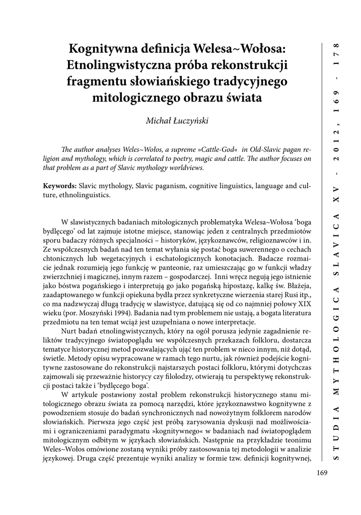 1 6 9 - 1 7 8 Kognitywna definicja Welesa~Wołosa: Etnolingwistyczna próba rekonstrukcji fragmentu słowiańskiego tradycyjnego mitologicznego obrazu świata 2 0 1 2 , Michał Łuczyński - The author analyses Weles~Wołos, a supreme »Cattle-God« in Old-Slavic pagan religion and mythology, which is correlated to poetry, magic and cattle. The author focuses on that problem as a part of Slavic mythology worldviews. S L A V I C A X V Keywords: Slavic mythology, Slavic paganism, cognitive linguistics, language and culture, ethnolinguistics. S T U D I A M Y T H O L O G I C A W slawistycznych badaniach mitologicznych problematyka Welesa~Wołosa ‘boga bydlęcego’ od lat zajmuje istotne miejsce, stanowiąc jeden z centralnych przedmiotów sporu badaczy różnych specjalności – historyków, językoznawców, religioznawców i in. Ze współczesnych badań nad ten temat wyłania się postać boga suwerennego o cechach chtonicznych lub wegetacyjnych i eschatologicznych konotacjach. Badacze rozmaicie jednak rozumieją jego funkcję w panteonie, raz umieszczając go w funkcji władzy zwierzchniej i magicznej, innym razem – gospodarczej. Inni wręcz negują jego istnienie jako bóstwa pogańskiego i interpretują go jako pogańską hipostazę, kalkę św. Błażeja, zaadaptowanego w funkcji opiekuna bydła przez synkretyczne wierzenia starej Rusi itp., co ma nadzwyczaj długą tradycję w slawistyce, datującą się od co najmniej połowy XIX wieku (por. Moszyński 1994). Badania nad tym problemem nie ustają, a bogata literatura przedmiotu na ten temat wciąż jest uzupełniana o nowe interpretacje. Nurt badań etnolingwistycznych, który na ogół porusza jedynie zagadnienie reliktów tradycyjnego światopoglądu we współczesnych przekazach folkloru, dostarcza tematyce historycznej metod pozwalających ująć ten problem w nieco innym, niż dotąd, świetle. Metody opisu wypracowane w ramach tego nurtu, jak również podejście kognitywne zastosowane do rekonstrukcji najstarszych postaci folkloru, którymi dotychczas zajmowali się przeważnie historycy czy filolodzy, otwierają tu perspektywę rekonstrukcji postaci także i ‘bydlęcego boga’. W artykule postawiony został problem rekonstrukcji historycznego stanu mitologicznego obrazu świata za pomocą narzędzi, które językoznawstwo kognitywne z powodzeniem stosuje do badań synchronicznych nad nowożytnym folklorem narodów słowiańskich. Pierwsza jego część jest próbą zarysowania dyskusji nad możliwościami i ograniczeniami paradygmatu »kognitywnego« w badaniach nad światopoglądem mitologicznym odbitym w językach słowiańskich. Następnie na przykładzie teonimu Weles~Wołos omówione zostaną wyniki próby zastosowania tej metodologii w analizie językowej. Druga część prezentuje wyniki analizy w formie tzw. definicji kognitywnej, 169 Kognitywna definicja Welesa~Wołosa składającej się z a) eksplikacji z zastosowaniem podziału fasetowego; b) dokumentacji hasła, obejmującej wszystkie znane teksty, w których teonim się pojawia. Celem artykułu jest rekonstrukcja językowo-kulturowego obrazu Welesa~Wołosa jako jednego z bóstw panteonu wschodnich Słowian na podstawie tekstów literackich, historycznych i źródeł leksykograficznych datujących się od wczesnego średniowiecza po czasy nowożytne. Przeprowadzona kwerenda źródeł pozwoliła włączyć do korpusu tekstów, na podstawie których dokonano opisu konotacji teonimu, oprócz znanych i wielokrotnie w historiografii przywoływanych, również nieznane i dotychczas nie wykorzystywane zapisy historyczne i folklorystyczne. Oprócz więc źródeł znanych i powielekroć cytowanych, znalazły się tu m.in. »Latopis Rostowski« i ludowe podania etiologiczne z terenu Rosji (dotychczas nie badane pod tym kątem). Rozszerzenie materiału pozwoliło – jak się wydaje – na pełniejszą rekonstrukcję i jej szersze oparcie w dokumentacji źródłowej. Wyekscerpowane fragmenty zostały następnie poddane analizie semantycznej, której zapisem jest część hasłowa. Teoretycznie i metodologicznie, praca nawiązuje do założeń lingwistyki kognitywnej, wyłożonych w szeregu prac badaczy zw. z kręgiem etnolingwistyki lubelskiej – przede wszystkim Jerzego Bartmińskiego. Metoda definicji kognitywnej, jaką zastosowano w pracy, została opracowana na potrzeby wydawanego od 1995 r. »Słownika Stereotypów i Symboli Ludowych« (w skrócie SSSL)1. O przydatności tej formuły do etnolingwistycznego opisu demonów czy innych postaci mitologicznych świadczą liczne dotychczas opublikowane opracowania na przykładzie polskich materiałów etnograficznych lub historycznych (zmora, strzyga, płanetnik, Szatan i in.). Okazała się ona przydatna i z powodzeniem zastosowana w etnolingwistycznym opisie pojęć sfery demonologia. Przedstawione przeze mnie wyniki badań są próbą wstępnego zastosowania tej metody do rekonstrukcji fragmentu historycznego stanu obrazu świata – w tym konkretnym przypadku postaci bóstwa nominowanego za pomocą teonimu Weles~Wołos. Definicja kognitywna teonimu Weles~Wołos 1. Definicja kognitywna w opisie postaci mitologicznych Próby rekonstrukcji semantyki postaci mitologicznych znanych ze źródeł historycznych podejmowane wielokrotnie były przez historyków, fi lologów i badaczy innych dyscyplin. Jednak zastosowanie metody opisu konotacji jednostek leksykalnych zw. definicją kognitywną do stanu historycznego i rozszerzenie jej poza granicę jednego języka, jednego stylu i jednego przedziału chronologicznego wydaje się nowe i nie było dotąd szerzej stosowane. Definicja kognitywna nie jest jedyną metodą opisu etnolingwistycznego pola semantycznego ‘mitologia i wierzenia’, jaką dotychczas zaproponowano. Na użytek wydawanego w Moskwie słownika »Slavjanskije drevnosti« stosuje się schemat opisu postaci mitologicznych (Схема; por. Bartmiński 2007: 50–51, 85), który przewiduje od kilku do kilkunas