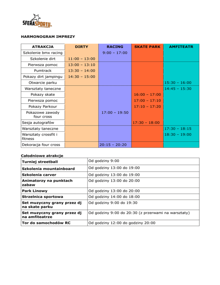 HARMONOGRAM IMPREZY ATRAKCJA DIRTY RACING Szkolenie bmx racing SKATE PARK AMFITEATR 9:00 – 17:00 Szkolenie dirt 11:00 – 13:00 Pierwsza pomoc 13:00 – 13:10 Pumtrack 13:30 – 14:00 Pokazy dirt jampingu 14:30 – 15:00 Otwarcie parku 15:30 – 16:00 Warsztaty taneczne 14:45 – 15:30 Pokazy skate 16:00 – 17:00 Pierwsza pomoc 17:00 – 17:10 Pokazy Parkour 17:10 – 17:20 Pokazowe zawody four cross 17:00 – 19:50 Sesja autografów 17:30 – 18:00 Warsztaty taneczne 17:30 – 18:15 Warsztaty crossfit i fitness 18:30 – 19:00 Dekoracja four cross 20:15 – 20:20 Całodniowe atrakcje Turniej streetball Od godziny 9:00 Szkolenia mountainboard Od godziny 13:00 do 19:00 Szkolenia carver Od godziny 13:00 do 19:00 Animatorzy na punktach zabaw Od godziny 13:00 do 20:00 Park Linowy Od godziny 13:00 do 20:00 Strzelnica sportowa Od godziny 14:00 do 18:00 Set muzyczny grany przez dj na skate parku Od godziny 9:00 do 19:30 Set muzyczny grany przez dj na amfiteatrze Od godziny 9:00 do 20:30 (z przerwami na warsztaty) Tor do samochodów RC Od godziny 12:00 do godziny 20:00
