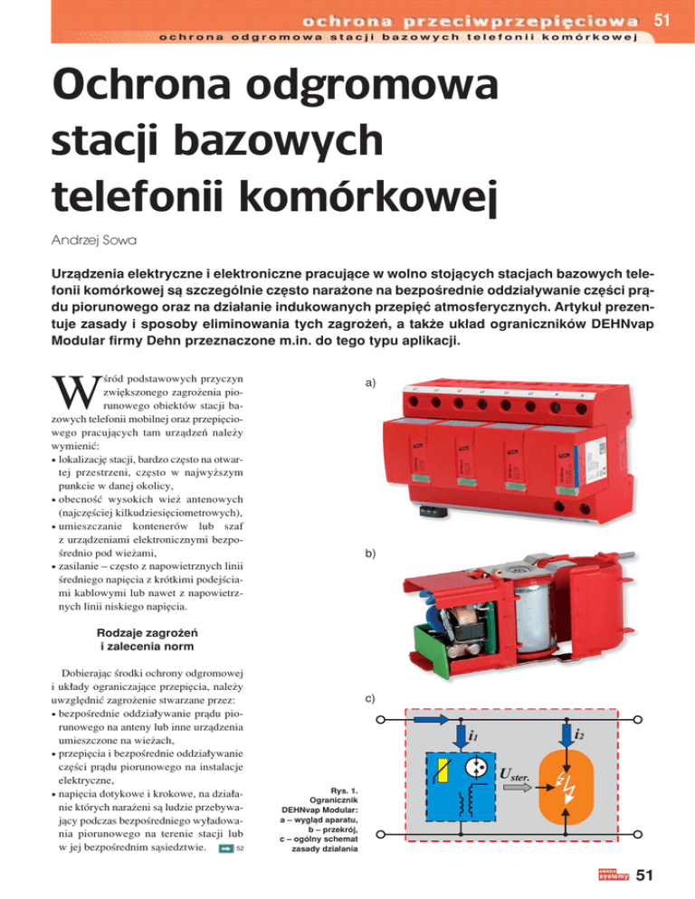 51 ochrona odgromowa stacji bazowych telefonii komÛrkowej Ochrona odgromowa stacji bazowych telefonii komórkowej Andrzej Sowa Urzπdzenia elektryczne i elektroniczne pracujπce w wolno stojπcych stacjach bazowych telefonii komÛrkowej sπ szczegÛlnie czÍsto naraøone na bezpoúrednie oddzia≥ywanie czÍúci prπdu piorunowego oraz na dzia≥anie indukowanych przepiÍÊ atmosferycznych. Artyku≥ prezentuje zasady i sposoby eliminowania tych zagroøeÒ, a takøe uk≥ad ogranicznikÛw DEHNvap Modular firmy Dehn przeznaczone m.in. do tego typu aplikacji. úrÛd podstawowych przyczyn zwiÍkszonego zagroøenia piorunowego obiektÛw stacji bazowych telefonii mobilnej oraz przepiÍciowego pracujπcych tam urzπdzeÒ naleøy wymieniÊ: ï lokalizacjÍ stacji, bardzo czÍsto na otwartej przestrzeni, czÍsto w najwyøszym punkcie w danej okolicy, ï obecnoúÊ wysokich wieø antenowych (najczÍúciej kilkudziesiÍciometrowych), ï umieszczanie kontenerÛw lub szaf z urzπdzeniami elektronicznymi bezpoúrednio pod wieøami, ï zasilanie ñ czÍsto z napowietrznych linii úredniego napiÍcia z krÛtkimi podejúciami kablowymi lub nawet z napowietrznych linii niskiego napiÍcia. W a) b) Rodzaje zagroøeÒ i zalecenia norm Dobierajπc úrodki ochrony odgromowej i uk≥ady ograniczajπce przepiÍcia, naleøy uwzglÍdniÊ zagroøenie stwarzane przez: ï bezpoúrednie oddzia≥ywanie prπdu piorunowego na anteny lub inne urzπdzenia umieszczone na wieøach, ï przepiÍcia i bezpoúrednie oddzia≥ywanie czÍúci prπdu piorunowego na instalacje elektryczne, ï napiÍcia dotykowe i krokowe, na dzia≥anie ktÛrych naraøeni sπ ludzie przebywajπcy podczas bezpoúredniego wy≥adowania piorunowego na terenie stacji lub 52 w jej bezpoúrednim sπsiedztwie. c) Rys. 1. Ogranicznik DEHNvap Modular: a ñ wyglπd aparatu, b ñ przekrÛj, c ñ ogÛlny schemat zasady dzia≥ania 51 52 ochrona odgromowa stacji bazowych telefonii komÛrkowej Rys. 2. Klasyczny uk≥ad po≥πczeÒ ogranicznika DEHNvap. 51 Projektujπc systemy ochrony, naleøy uwzglÍdniÊ wymagania norm ochrony odgromowej obiektÛw budowlanych [1, 2, 3, 4], ochrony przepiÍciowej w instalacji elektrycznej [9, 10] oraz zalecenia zawarte w normach kompatybilnoúci elektromagnetycznej urzπdzeÒ instalowanych w stacjach bazowych [11, 12, 13]. Ograniczanie przepiÍÊ w instalacji elektrycznej Dobierajπc urzπdzenia do ograniczania przepiÍÊ SPD (Surge Protective Device) w instalacji elektrycznej w stacji bazowej, naleøy uwzglÍdniÊ: ï zagroøenie piorunowe wynikajπce z przyjÍtego poziomu ochrony, ï wymagania wynikajπce z niewielkie rozmiarÛw szafy lub kontenera z urzπdzeniami elektronicznymi, ï trudnoúci z dok≥adnym okreúleniem odpornoúci udarowej kaødego z urzπdzeÒ, ï celowoúÊ zachowania marginesu koordynacyjnego pomiÍdzy poziomem wytrzy- ma≥oúci udarowej urzπdzeÒ a napiÍciowym poziomem ochrony ogranicznikÛw, ï zalecenia zawarte w normach ochrony odgromowej i przepiÍciowej. Z analizy powyøszych wymagaÒ wynika, øe uk≥ady ogranicznikÛw przepiÍÊ powinny: ï ograniczaÊ przepiÍcia do poziomu poniøej 1500 V pomiÍdzy przewodami fazowymi a przewodem ochronnym oraz pomiÍdzy przewodem neutralnym a przewodem ochronnym, ï zapewniaÊ ochronÍ przed dzia≥aniem prπdu piorunowego o wartoúci szczytowej dochodzπcej do 100 kA, ï charakteryzowaÊ siÍ napiÍciem trwa≥ej pracy na poziomie oko≥o 1,1 napiÍcia fazowego, ï byÊ proste w montaøu i zajmowaÊ stosunkowo niewiele miejsca w rozdzielnicy, ï gasiÊ prπdy nastÍpcze lub nie dopuszczaÊ do ich powstawania w instalacji elektrycznej, ï podczas dzia≥ania nie wp≥ywaÊ na pracÍ innych aparatÛw elektrycznych, np. nie powodowaÊ zadzia≥ania bezpiecznikÛw, Rys. 3. Przyk≥ad szeregowego po≥πczenia modu≥u ochronnego DEHNvap 52 nawet o stosunkowo niewielkich wartoúciach, ï posiadaÊ wskaünik sygnalizujπcy uszkodzenie ogranicznikÛw. Uk≥ad SPD powinien byÊ dobrany do stosowanego systemu sieci i umieszczony w takim miejscu, w ktÛrym istnieje moøliwoúÊ jego kontroli. Ograniczanie przepiÍÊ do moøliwie najniøszych poziomÛw wymaga rÛwnieø stosowania moøliwie najkrÛtszych przewodÛw do po≥πczeÒ SPD. Wyeliminowanie wad rÛønego typu ogranicznikÛw, przy zachowaniu wymaganych w≥aúciwoúci ochronnych, osiπgniÍto wprowadzajπc nowe typy SPD typu 1 o niskich napiÍciowych poziomach ochrony. Jednym z takich rozwiπzaÒ sπ produkowane przez firmÍ Dehn SPD typu 1 DEHNvap Modular (rys. 1.) o napiÍciowym poziomie ochrony poniøej 1500 V. DEHNvap Modular Urzπdzenia ograniczajπce przepiÍcia DEHNvap posiadajπ po dwa zaciski do po≥πczenia z kaødym z przewodÛw fazowych oraz z przewodem ochronnym PE i lokalnπ szynπ wyrÛwnawczπ. Wprowadzenie takiego rozwiπzania umoøliwia prosty montaø ogranicznikÛw w uk≥adzie rÛwnoleg≥ym i szeregowym ñ tzw. uk≥adzie V. Po≥πczenie ÑrÛwnoleg≥eî jest zalecane, jeúli istnieje moøliwoúÊ zastosowania do po≥πczenia ogranicznika krÛtkich przewodÛw oraz wystÍpujπ duøe wartoúci znamionowych zabezpieczeÒ nadprπdowych zamontowanych przed ogranicznikiem. W uk≥adzie rÛwnoleg≥ym ograniczniki DEHNvap nie wymagajπ dobezpieczeÒ, jeúli wartoúci bezpiecznikÛw nie przekraczajπ 315A gL/gG. Montaø w uk≥adzie szeregowym umoøliwia wyeliminowanie spadku napiÍÊ na przewodach, ale zakres jego zastosowaÒ ogranicza siÍ do instalacji, w ktÛrych znamionowe wartoúci prπdÛw bezpiecznikÛw nie przekraczajπ wartoúci 125 A. Zastosowanie sterowanych obudowanych iskiernikÛw umoøliwi≥o stworzenie SPD, ktÛre posiadajπ, w porÛwnaniu z klasycznymi rozwiπzaniami ochrony przepiÍciowej, nastÍpujπce zalety: ï zapewniajπ ochronÍ instalacji i urzπdzeÒ przed bezpoúrednim dzia≥aniem prπdÛw piorunowych i wszelkiego rodzaju przepiÍciami; ï pomimo zastosowania warystorÛw nie wprowadzajπ prπdÛw up≥ywu w instalacji elektrycznej; sierpieÒ 2010 53 ochrona odgr