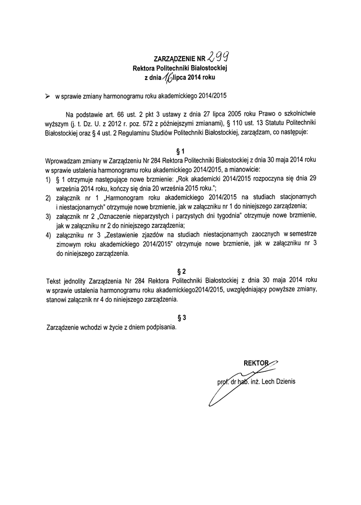 Załącznik nr 1 do Zarządzenia Nr 299/2014 Rektora PB Harmonogram roku akademickiego 2014/2015 na studiach stacjonarnych i niestacjonarnych Semestr zimowy roku akademickiego 2014/2015 29.09.2014 – 31.10.2014 zajęcia dydaktyczne 01.11.2014 – 02.11.2014 przerwa świąteczna 03.11.2014 – 09.11.2014 zajęcia dydaktyczne 10.11.2014 – 11.11.2014 przerwa świąteczna 12.11.2014 – 23.12.2014 zajęcia dydaktyczne 24.12.2014 – 11.01.2015 przerwa świąteczna 12.01.2015 – 30.01.2015 zajęcia dydaktyczne 31.01.2015 – 11.02.2015 sesja egzaminacyjna 12.02.2015 – 18.02.2015 sesja egzaminacyjna poprawkowa 19.02.2015 – 22.02.2015 egzaminy komisyjne i rejestracja na semestr letni Semestr letni roku akademickiego 2014/2015 23.02.2015 – 02.04.2015 zajęcia dydaktyczne 03.04.2015 – 07.04.2015 przerwa świąteczna 08.04.2015 – 10.04.2015 zajęcia dydaktyczne 08.04.2015 (środa) zajęcia wg rozkładu na piątek 11.04.2015 – 14.04.2015 przerwa świąteczna 15.04.2015 – 30.04.2015 zajęcia dydaktyczne 01.05.2015 – 03.05.2015 przerwa świąteczna 04.05.2015 – 22.05.2015 zajęcia dydaktyczne 23.05.2015 – 24.05.2015 przerwa świąteczna 25.05.2015 – 03.06.2015 zajęcia dydaktyczne 04.06.2015 przerwa świąteczna zajęcia dydaktyczne 17.06.2015 (środa) zajęcia wg rozkładu na piątek sesja egzaminacyjna sesja egzaminacyjna poprawkowa, egzaminy komisyjne i rejestracja na rok akademicki 2015/2016 rozpoczęcie roku akademickiego 2015/2016 05.06.2015 – 17.06.2015 18.06.2015 – 24.06.2015 14.09.2015 – 20.09.2015 21.09.2015 Praktyki studenckie odbywają w terminach ustalonych przez poszczególne wydziały W okresie 08.05-29.05.2015 jeden dzień (piątek), na wniosek Samorządu Studentów PB, zostanie ogłoszony dniem wolnym od zajęć dydaktycznych w związku ze świętem studenckim „Juwenalia 2015” Załącznik nr 2 do Zarządzenia Nr 299/2014 Rektora PB Oznaczenie nieparzystych i parzystych dni tygodnia TYDZIEŃ NIEPARZYSTY I TYDZIEŃ PARZYSTY II SEMESTR ZIMOWY MIESIĄC Wrzesień/Październik Listopad Grudzień Styczeń Poniedziałek 29 6 13 20 27 3 10 17 24 1 8 15 22 29 5 12 19 26 Wtorek 30 7 14 21 28 4 11 18 25 2 9 16 23 30 6 13 20 27 Środa 1 8 15 22 29 5 12 19 26 3 10 17 24 31 7 14 21 28 Czwartek 2 9 16 23 30 6 13 20 27 4 11 18 25 1 8 15 22 29 Piątek 3 10 17 24 31 7 14 21 28 5 12 19 26 2 9 16 23 30 TYGODNIE I II I II I II I II I II I II I x II I I/II* * W tygodniu 26.01.2015 - 30.01.2015 odbywają się wszystkie zajęcia dydaktyczne zarówno w tygodniu parzystym jak i nieparzystym, przy czym zajęcia te trwają 1 godzinę. SEMESTR LETNI MIESIĄC Poniedziałek Wtorek Środa Czwartek Piątek TYGODNIE Luty/Marzec 23 24 25 26 27 I 2 3 4 5 6 II 9 10 11 12 13 I 16 17 18 19 20 II Kwiecień 7 1 8 2 9 3 10 4 11 I II 14 15 16 17 18 21 28 22 29 23 30 24 25 I/II** I II Maj 20 21 22 23 24 I II 27 28 29 30 1 4 5 6 7 8 I 11 12 13 14 15 II Czerwiec 18 19 20 21 22 I 25 1 26 2 27 3 28 4 29 5 I/II*** II I 8 9 10 11 12 II 15 16 17* 18 19 I/II** Wrzesień 22 29 23 30 24 25 26 x x 1 2 3 4 x 7 8 9 10 11 14 15 16 17 18 21 22 23 24 25 28 29 30 x x I II 08.04.2015 - zajęcia wg rozkładu na piątek (parzysty), 8 - 29.05.2015 - na wniosek SSPB, jeden piątek zostaje ogłoszony dniem wolnym od zajęć dydaktycznych ze względu na Dni Kultury Studenckiej - Juwenalia 2015, 17.06.2015 - zajęcia wg rozkładu na piątek (parzysty lub nieparzysty - zależne od terminu Juwenaliów 2015) ** W tygodniach: 01-02.04.2015 oraz 15-16.06.2015 - odbywają się wszystkie zajęcia dydaktyczne zarówno w tygodniu parzystym jak i nieparzystym, przy czym zajęcia te trwają 1 godzinę. *** 05.06.2015 - odbywają się wszystkie zajęcia dydaktyczne zarówno w tygodniu parzystym jak i nieparzystym, przy czym zajęcia te trwają 1 godzinę Legenda: - zajęcia dydaktyczne Załącznik nr 3 do Zarządzenia Nr 299/2014 Rektora PB Zestawienie zjazdów na studiach niestacjonarnych - zaocznych w semestrze zimowym roku akademickiego 2014/2015 WYDZIAŁ L.p. Zjazdy BUDOWNICTWA I INŻYNIERII ŚRODOWISKA ELEKTRYCZNY INFORMATYKI 1. 03.10. - 05.10.2014 x x* x 2. 10.10. - 12.10.2014 x x 3. 17.10. - 19.10.2014 x 4. 24.10. - 26.10.2014 x 5. 07.11. - 09.11.2014 x 6. 14.11 - 16.11.2014 7. 21.11. - 23.11.2014 x 8. 28.11. - 30.11.2014 x 9. 05.12. - 07.12.2014 10. 12.12. - 14.12.2014 x 11. 19.12. - 21.12.2014 x x 12. 16.01. - 18.01.2015 x x 13. 23.01. - 25.01.2015 x x x x MECHANICZNY ZARZADZANIA ZWL W HAJNÓWCE x** x x x x x x x x x x x x x** x x x x x x* - brak zjazdu w systemie 9 zjazdowym X** - zjazd wyłącznie dla I roku specjalności rachunkowość i zarządzanie finansami ACCA x x x x x x x x x* x x x x x x x x x x x x x Załącznik nr 4 do Zarządzenia Nr 299/2014 Rektora PB ZARZĄDZENIE NR Rektora Politechniki Białostockiej z dnia 30 maja 2014 roku (tekst jednolity z dnia 16 lipca 2014 roku) w sprawie ustalenia harmonogramu roku akademickiego 2014/2015 Na podstawie art. 66 ust. 2 pkt 3 ustawy z dnia 27 lipca 2005 roku Prawo o szkolnictwie wyższym (Dz. U. z 2005r. Nr 164 poz. 1365 z późniejszymi zmianami), § 110 ust. 12 Statutu Politechniki Białostockiej oraz § 4 ust. 2 Regulaminu studiów Politechniki Białostockiej, zarządzam, co następuje: §1 Rok akademicki 2014/2015 rozpoczyna się 29 września 2014 roku, kończy się 20 września 2015 roku. §2 Harmonogram roku akademickiego 2014/2015 na studiach stacjonarnych i niestacjonarnych określa załącznik nr 1 do niniejszego zarządzenia. §3 Oznaczenia tygodni parzystych i nieparzystych w roku akademickim 2014/2015 określa załącznik nr 2 do niniejszego zarządzenia. §4 Terminy zjazdów na studiach niestacjonarnych zaocznych w semestrze zimowym roku akademickiego 2014/2015 określa załącznik nr 3 do niniejszego zarządzenia. §5 Terminy zjazdów na studiach niestacjonarnych zaocznych w semestrze letnim roku akademickiego 2014/2015 określa załącznik nr 4 do niniejszego zarządzenia. §6 Nadzór nad realizacją niniejszego zarządzenia sprawuje prorektor ds. stu