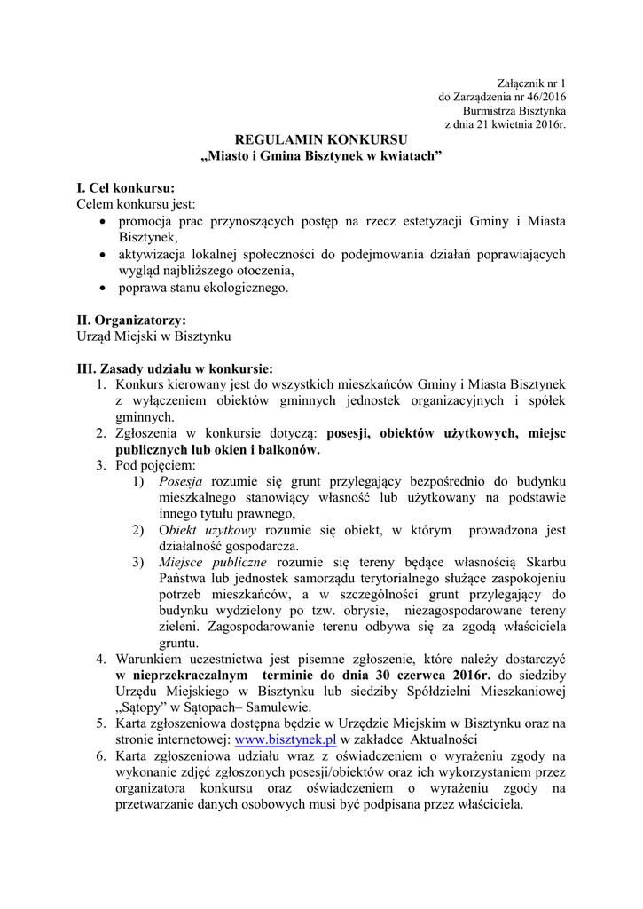 Załącznik nr 1 do Zarządzenia nr 46/2016 Burmistrza Bisztynka z dnia 21 kwietnia 2016r. REGULAMIN KONKURSU „Miasto i Gmina Bisztynek w kwiatach” I. Cel konkursu: Celem konkursu jest: promocja prac przynoszących postęp na rzecz estetyzacji Gminy i Miasta Bisztynek, aktywizacja lokalnej społeczności do podejmowania działań poprawiających wygląd najbliższego otoczenia, poprawa stanu ekologicznego. II. Organizatorzy: Urząd Miejski w Bisztynku III. Zasady udziału w konkursie: 1. Konkurs kierowany jest do wszystkich mieszkańców Gminy i Miasta Bisztynek z wyłączeniem obiektów gminnych jednostek organizacyjnych i spółek gminnych. 2. Zgłoszenia w konkursie dotyczą: posesji, obiektów użytkowych, miejsc publicznych lub okien i balkonów. 3. Pod pojęciem: 1) Posesja rozumie się grunt przylegający bezpośrednio do budynku mieszkalnego stanowiący własność lub użytkowany na podstawie innego tytułu prawnego, 2) Obiekt użytkowy rozumie się obiekt, w którym prowadzona jest działalność gospodarcza. 3) Miejsce publiczne rozumie się tereny będące własnością Skarbu Państwa lub jednostek samorządu terytorialnego służące zaspokojeniu potrzeb mieszkańców, a w szczególności grunt przylegający do budynku wydzielony po tzw. obrysie, niezagospodarowane tereny zieleni. Zagospodarowanie terenu odbywa się za zgodą właściciela gruntu. 4. Warunkiem uczestnictwa jest pisemne zgłoszenie, które należy dostarczyć w nieprzekraczalnym terminie do dnia 30 czerwca 2016r. do siedziby Urzędu Miejskiego w Bisztynku lub siedziby Spółdzielni Mieszkaniowej „Sątopy” w Sątopach– Samulewie. 5. Karta zgłoszeniowa dostępna będzie w Urzędzie Miejskim w Bisztynku oraz na stronie internetowej: www.bisztynek.pl w zakładce Aktualności 6. Karta zgłoszeniowa udziału wraz z oświadczeniem o wyrażeniu zgody na wykonanie zdjęć zgłoszonych posesji/obiektów oraz ich wykorzystaniem przez organizatora konkursu oraz oświadczeniem o wyrażeniu zgody na przetwarzanie danych osobowych musi być podpisana przez właściciela. 7. W konkursie mogą brać udział osoby, które przez ostatnie dwa lata w nim nie uczestniczyły. 8. Osoba biorąca udział w konkursie może zgłosić obiekt tylko w jednej kategorii. 9. Prace wykonane przez firmy specjalistyczne, nie będą oceniane. IV. Zasady konkursu: 1. Zasady i kryteria oceny mają na celu promowanie prac przynoszących postęp w estetyce najbliższego otoczenia i poprawę stanu ekologicznego Gminy i Miasta Bisztynek. 2. Podczas trwania konkursu komisja konkursowa przeprowadzi lustrację w terminie do 22 lipca 2016r, w trakcie której wykona zdjęcia zgłoszonych posesji/obiektów i dokona oceny na karcie będącej załącznikiem do niniejszego regulaminu. 3. Organizator będzie uprawniony do wielokrotnego korzystania z wykonanych przez Komisję zdjęć na wydawanych przez Urząd Miejski materiałach i na stronie internetowej. 4. Podsumowaniem konkursu będzie wystawa plenerowa, na której umieszczone zostaną zdjęcia wykonane przez Komisję. V. Komisja konkursowa: 1. Komisja konkursowa powołana przez Burmistrza Bisztynka liczy 3 osoby. 2. Zadaniem Komisji jest ocena zgłoszonych posesji/obiektów oraz przyznanie punktacji. 3. Przewodniczący Komisji ma prawo rozstrzygania głosowań, w których zachodzi równowaga głosów. VI. Nagrody: 1. W oparciu o ustalenia i propozycje Komisji Burmistrz Bisztynka przyzna nagrody i wyróżnienia. 2. Burmistrz może przyznać nagrodę specjalną. 3. Nagrody i wyróżnienia zostaną wręczone podczas Dożynek Gminnych.