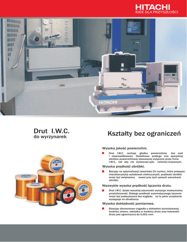 IDEE DLA PRZYSZŁOŚCI Drut I.W.C. do wyrzynarek Kształty bez ograniczeń Wysoka jakość powierzchni. Drut I.W.C. cechuje gładka powierzchnia bez wad i nieprawidłowoúci. Dodatkowo podlega ona specjalnej obróbce powierzchiowej stosowanej wyłącznie przez firmę I.W.C., tak aby nie wytwarzać pyłu (wiórów) brązowych. Wysoka prędkość obróbki. Bazując na optymalizacji zawartości Zn (cynku), która polepsza charakterystykę wyładowań elektrycznych, prędkość obróbki może być zwiększona nawet przy tych samych warunkach obróbki. Niezwykle wysoka prędkość łączenia drutu. Drut I.W.C. dzięki wysokiej sztywności wykazuje maksymalną prostoliniowość. Dlatego prędkość automatycznego łączenia może być podwyższona bez względu na to jakie urządzenie występuje na obrabiarce. Wysoka dokładność pomiarowa. Stosując diamentowe ciągadła o dokładnie kontrolowanej średnicy otworu, odchyłka w średnicy drutu oraz kołowości drutu jest ograniczona do 0,001 mm. Dane techniczne : IDEE DLA PRZYSZŁOŚCI DRUT I.W.C. Typ Średnica drutu Tolerancja średnicy drutu Wytrzymałość na rozciąganie mm mm N/mm 2 0.15 0,20 0,25 0,30 +0 - 0,001 0,15 0,20 0,25 +0 - 0,001 I.W.C. hw I.W.C. sw I.W.C. Zn hw I.W.C. Zn sw 900/800 500 900 500 Sposób pakowania i wymiary szpul Średnica otworu osiowego Średnica kołnierza Średnica cylindra nawojowego D mm d mm L/W a mm mm h mm K-125 125 24 125 / 99 13 16 3,5 4 K-160 160 34 160 / 128 16 22 7,0 2 K-200 200 34 200 / 160 20 22 16,0 1 Symbol szpuli Szerokość zew./wew. Grubość kołnierza Masa drutu na szpuli Liczba szpul w paczce szt. Cennik. Powlekany Średnica drutu Drut O 0,15 O 0,20 O 0,25 O 0,30 Brąz Zn Cena netto VAT euro/ kg % I.W.C. sw do uzgodnienia I.W.C. hw 22 I.W.C. Zn sw do uzgodnienia I.W.C. Zn hw Dystrybutor :