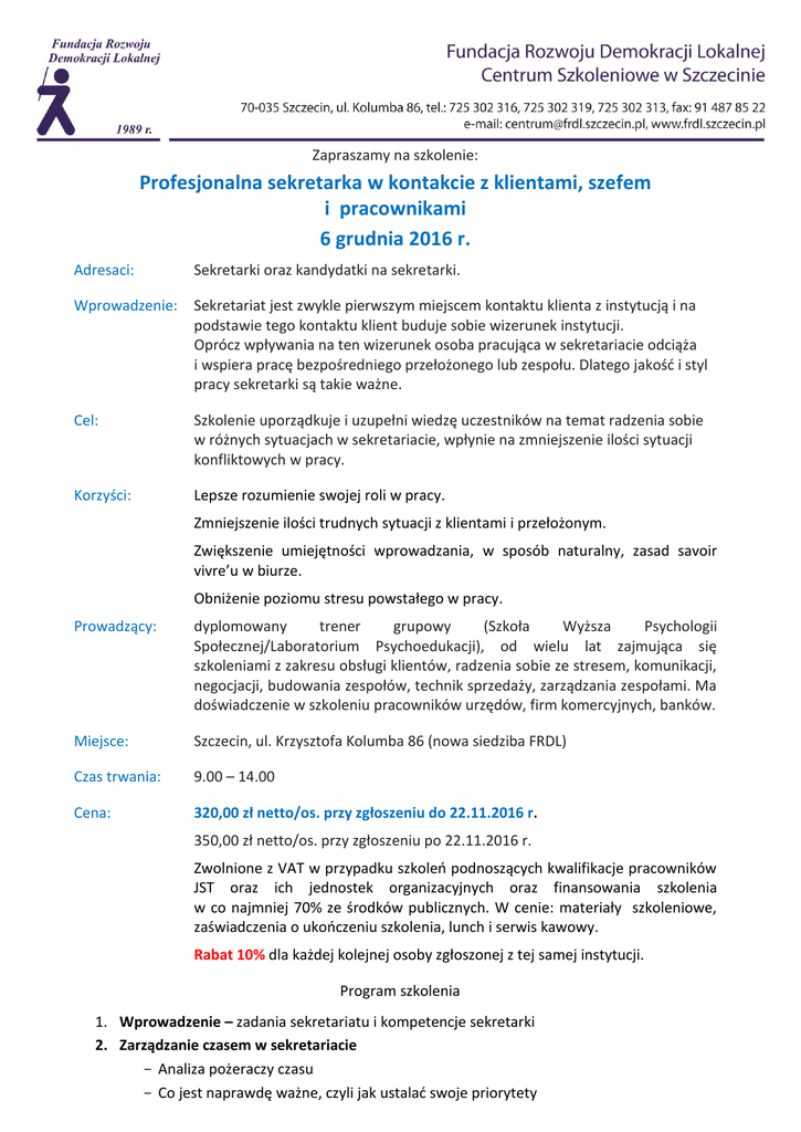 Zapraszamy na szkolenie: Profesjonalna sekretarka w kontakcie z klientami, szefem i pracownikami 6 grudnia 2016 r. Adresaci: Sekretarki oraz kandydatki na sekretarki. Wprowadzenie: Sekretariat jest zwykle pierwszym miejscem kontaktu klienta z instytucją i na podstawie tego kontaktu klient buduje sobie wizerunek instytucji. Oprócz wpływania na ten wizerunek osoba pracująca w sekretariacie odciąża i wspiera pracę bezpośredniego przełożonego lub zespołu. Dlatego jakość i styl pracy sekretarki są takie ważne. Cel: Szkolenie uporządkuje i uzupełni wiedzę uczestników na temat radzenia sobie w różnych sytuacjach w sekretariacie, wpłynie na zmniejszenie ilości sytuacji konfliktowych w pracy. Korzyści: Lepsze rozumienie swojej roli w pracy. Zmniejszenie ilości trudnych sytuacji z klientami i przełożonym. Zwiększenie umiejętności wprowadzania, w sposób naturalny, zasad savoir vivre’u w biurze. Obniżenie poziomu stresu powstałego w pracy. Prowadzący: dyplomowany trener grupowy (Szkoła Wyższa Psychologii Społecznej/Laboratorium Psychoedukacji), od wielu lat zajmująca się szkoleniami z zakresu obsługi klientów, radzenia sobie ze stresem, komunikacji, negocjacji, budowania zespołów, technik sprzedaży, zarządzania zespołami. Ma doświadczenie w szkoleniu pracowników urzędów, firm komercyjnych, banków. Miejsce: Szczecin, ul. Krzysztofa Kolumba 86 (nowa siedziba FRDL) Czas trwania: 9.00 – 14.00 Cena: 320,00 zł netto/os. przy zgłoszeniu do 22.11.2016 r. 350,00 zł netto/os. przy zgłoszeniu po 22.11.2016 r. Zwolnione z VAT w przypadku szkoleń podnoszących kwalifikacje pracowników JST oraz ich jednostek organizacyjnych oraz finansowania szkolenia w co najmniej 70% ze środków publicznych. W cenie: materiały szkoleniowe, zaświadczenia o ukończeniu szkolenia, lunch i serwis kawowy. Rabat 10% dla każdej kolejnej osoby zgłoszonej z tej samej instytucji. Program szkolenia 1. Wprowadzenie – zadania sekretariatu i kompetencje sekretarki 2. Zarządzanie czasem w sekretariacie - Analiza pożeraczy czasu - Co jest naprawdę ważne, czyli jak ustalać swoje priorytety 3. Klient w sekretariacie - Savoir-vivre w biurze - Szef i jego goście 4. Techniki asertywne przydatne w pracy sekretarki - Przyjmowanie pochwał i krytyki - Odmawianie klientom i współpracownikom - Krytykowanie innych - Asertywne stawianie granic - Obrona przed psychomanipulacją 5. Szef i sekretarka - Co sekretarka powinna wiedzieć o szefie? - Jak się do siebie zwracać? - Jak osłaniać szefa przed nieproszonymi gośćmi? - Jak odmawiać prośbom szefa - Pod nieobecność szefa 6. Radzenie sobie ze stresem spowodowanym przez pracę - Proste i skuteczne sposoby na stres w pracy - Jak nie przenosić stresu z pracy do domu