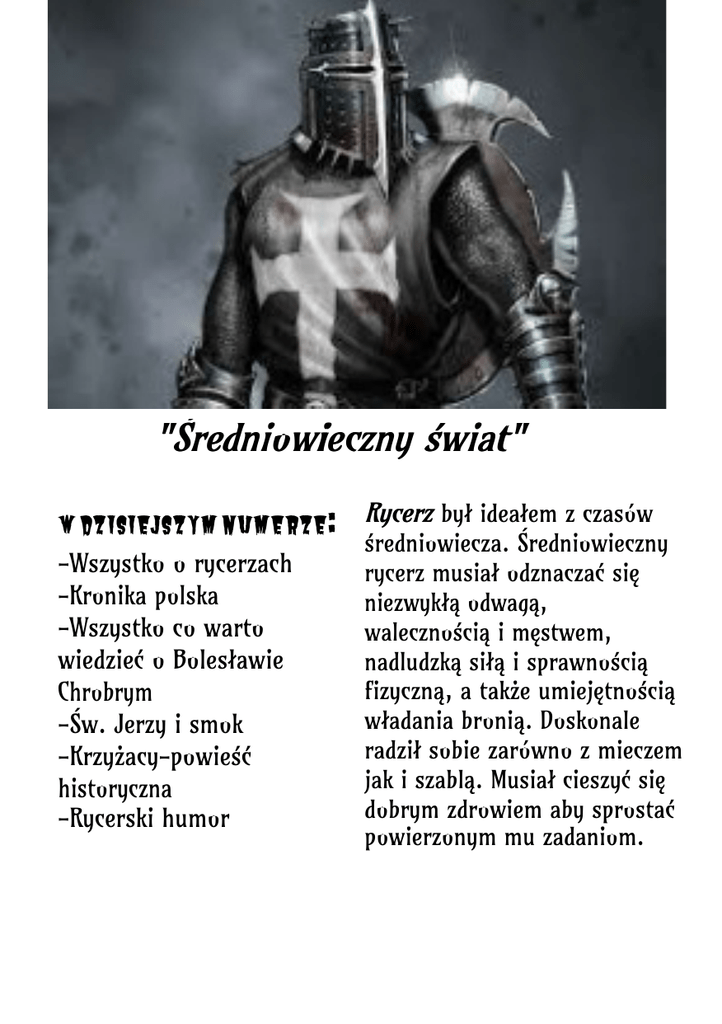 "Średniowieczny świat" W dzisiejszym numerze: -Wszystko o rycerzach -Kronika polska -Wszystko co warto wiedzieć o Bolesławie Chrobrym -Św. Jerzy i smok -Krzyżacy-powieść historyczna -Rycerski humor Rycerz był ideałem z czasów średniowiecza. Średniowieczny rycerz musiał odznaczać się niezwykłą odwagą, walecznością i męstwem, nadludzką siłą i sprawnością fizyczną, a także umiejętnością władania bronią. Doskonale radził sobie zarówno z mieczem jak i szablą. Musiał cieszyć się dobrym zdrowiem aby sprostać powierzonym mu zadaniom. Kronika polska- – pierwsza polska kronika, nieukończona. Spisana po łacinie, prawdopodobnie w latach 1113–1116, przez anonimowego autora zwanego Gallem Anonimem. Najstarszy rękopis pochodzi z XIV w. i znajduje się w zbiorach Bilblioteki Narodowej Gall Anonim-anonimowy autor Kroniki polskiej. Uważany za pierwszego polskiego kronikarza, chociaż był cudzoziemskiego pochodzenia. Zbroja rycerza była mocna oraz wytrzymała.W ręku rycerz trzymał miecz oraz tarczę.Głowę rycerza zdobił hełm. Obowiązki rycerza: Kiedy wybuchała wojna, rycerz musiał stawić się z cala swoja załoga i czeladzią w pełnym rynsztunku bojowym i być gotowym przelać krew . Reguła stanu rycerskiego brzmi: - słuchać codziennie mszy z pobożnym rozpamiętywaniem męki Pańskiej; - odważnie walczyć w obronie wiary katolickiej, - św. Kościół wraz z jego sługami uwalniać od napastników, - wdowy i sieroty wspierać w potrzebie; -unikać wojen niesprawiedliwych, -stoczyć pojedynek w obronie każdego niewinnego; - brać udział w turniejach rycerskich i żyć nienagannie wobec Boga i ludzi. PYTanie Jakie inne ideały istaniły w średniowieczu ? Ideał: -władcy -świętego -ascety -rycerza Miał trzech synów: Bezprypa, Mieszka (II), Otto, oraz trzy córki, w tym Renegildę, żonę Hermana margrabiego Miśni oraz nieznaną z imienia żonę Świętopełka, wielkiego księcia kijowskiego. W 1000 r. wziął udział w Zjeździe Gnieźnieńskim gdzie cesarz Otton III nakłada mu na głowę cesarski diadem. Wówczas uważano ten gest za wyraźny symbol namaszczenia Bolesława na króla Polski. Chrobry koronuje się na króla Polski 18 kwietnia 1025 r. wykorzystując korzystną sytuację polityczną w Cesarstwie i śmierć Bolesław Chrobry żył w latach ok. 967-1025,był księciem Polski od 992 r, a królem od 1025 r. Wywodził się z dynastii Piastów, był synem Mieszka I i Dobrawycórki Bolesława I Okrutnego ks. czeskiego. Czterokrotnie żonaty m.in z: nieznaną z imienia córką Rydgarda margrabiego Miśni, nieznaną z imienia księżniczką węgierską, z Emnildą, córką Dobromira, ks. słowiańskiego, z Odą, córką Ekkeharda, margrabiego Miśni. Po śmierci ojca, opanował władzę w kraju wypędzając macochę Odę i przyrodnich braci: Mieszka, Świętopełka i Lamberta. nieprzychylnych mu papieża Benedykta VIII i cesarza Henryka II. Bolesław Chrobry zmarł niedługo po swojej koronacji w 1025 r. CIEKAWOSTKA Chrobry miał przydomek sławny :) Św. Jerzy i smok - legenda Według legendy przy źródle, z którego korzystali mieszkańcy pewnego miasta,uwił swoje gniazdo smok.By móc zaczerpnąć wody mieszakńcy codziennie musieli składać smokowi posiłek (owcę) lub jeśli jej nie mieli wydawali dziewczynę wybraną poprzez losowanie. Pewnego razu wylosowana zostałą córka króla ,księżniczka Sabra.Wowczas na drodze smoka stanął św. Jerzy .Obronił księżniczkę oraz pokonał złą bestie .Mieszakńcy z wdzięczności porzucili pogaństwo i przyjeli religię chrześcijańską. Ciekawostka Św.Jerzy jest patronem wędrowców,podróżnych,artystów, żołnierzy oraz wielu państw. A: Witam pana bardzo serdecznie. H: Dzień dobry pani. A: Jak to się stało, że został pan pisarzem? H: Moi rodzice pragnęli abym został lekarzem, jednak zrezygnowałem z medycyny i podjąłem studia prawnicze. W wieku dwudziestu lat przeniosłem się na wydział Filologiczno-Historyczny. Zdobyłem tam gruntową znajomość literatury i języka staropolskiego. To właśnie wtedy napisałem swoją pierwszą powieść -"Ofiara". W tym czasie pracowałem również nad powieścią "Na Marne". A: Z zamiłowania jest pan podróżnikiem. Jakie kraje pan zwiedził i jakie utwory powstały dzięki tym podróżom? H: Wraz ze znajomymi i Heleną Modrzejewską w 1878r.wybrałem się w podróz do USA. Zatrzymaliśmy się w Kalifornii. Tam właśnie powstały takie utwory jak: "Komedia z pomyłek", "Za chlebem", "Latarnik", "Sachem" i inne. Dwa lata później wróciłem do Europyi zatrzymałem się w Londynie. Następnie przebywałem w Paryżu. Właśnie tam poznałem nowy prąd w literaturze nautralizm. Byłem również w Hiszpani, Afryce, Szwajcarii i Wenecji tam poznałem Marię bliżej. Henryk Sienkiewcz A: Bardzo ciekawe. Gdzie po raz pierwszy spotkałeś Marię Szetkiewiczównę? Jak rozwinął się wasz związek? H:Po raz pierwszy spotkałem Marię W Szczawnicy. W 1881 r. odbył się nasz ślub. Maria wkrótce urodziła Henryka Józefa i Jadwige Marie. Jednak nasze małżeństwo nie trwało długo, gdyż Maria umarła w 1885r. na gruźlice. A: Przykro mi. Mam jeszcze jedno pytanie. Powieści takie jak "Potop", "Trylogia", "Ogniem imieczem", . Zyskały szerokie uznanie. Jak się pan z tym czuje? H: Jestem tym zaszczycony A:Dziękuje panu za wywiad. Jest pan pałen podziwu człowiekiem. Do widzenia. H: To ja dziękuje. Było mi bardzo miło. Bitwa pod Grunwaldem "Krzyżacy"- Krzyżacy to powieść, której akcja toczy się na przełomie XIV i XV wieku, a opowiada o stosunkach polsko-krzyżackich przed bitwą pod Grunwaldem. Jej opis kończy ten utwór, który podobnie jak Trylogia może być potraktowany jako napisany ku pokrzepieniu serc. Opowiada o czasach wielkiego zagrożenia Polski krzyżacką potęgą, ale, odmiennie niż Trylogia, bez przerwy podkreśla poczucie mocy polskiego narodu. PYTanie Co to jest powieść historyczna ? To powi