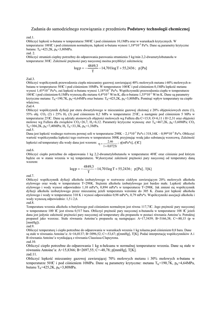 Zadania do samodzielnego rozwiązania z przedmiotu Podstawy technologii chemicznej zad.1. Obliczyć lepkość n-butanu w temperaturze 500°C i pod ciśnieniem 10,1MPa oraz w warunkach krytycznych. W temperaturze 100°C i pod ciśnieniem normalnym, lepkość n-butanu wynosi 1,18*10-5 Pa*s. Dane są parametry krytyczne butanu: TK=425,2K, pK=3,80MPa. zad. 2. Obliczyć strumień cieplny potrzebny do odparowania parowania strumienia 5 kg/min 2,2-dwumetylobutanolu w temperaturze 30°C. ZaleŜność pręŜności pary nasyconej moŜna przybliŜyć zaleŜnością: log p = − 4849,3 − 14,701log T + 55,2436 ; p [Pa] T Zad.3. Obliczyć współczynnik przewodzenia ciepła mieszaniny gazowej zawierającej 40% molowych metanu i 60% molowych nbutanu w temperaturze 50°C i pod ciśnieniem 10MPa. W temperaturze 100°C i pod ciśnieniem 0,1MPa lepkość metanu wynosi 1,45*10-5 Pa*s, zaś lepkość n-butanu wynosi 1,18*10-5 Pa*s. Współczynniki przewodzenia ciepła w temperaturze 100°C i pod ciśnieniem 0,1MPa wynoszą dla metanu 4,4*10-2 W/m K, dla n-butanu 1,35*10-2 W/m K. Dane są parametry krytyczne metanu: TK=190,7K, pK=4,64MPa oraz butanu: TK=425,2K, pK=3,80MPa. Pominąć wpływ temperatury na ciepło właściwe. Zad.4. Obliczyć współczynnik dyfuzji par eteru dwuetylowego w mieszaninie gazowej złoŜonej z 20% objętościowych eteru (1), 55% obj. CO2 (2) i 25% H2 (3) pod ciśnieniem 0,2 MPa w temperaturze 25°C, a następnie pod ciśnieniem 5 MPa w temperaturze 25°C. Dane są udziały atomowych objętości molowych wg Fullera dla C=15,9, O=6,11 i H=2,31 oraz objętości molowe wg Fullera dla związków CO2=26,7, H2=6,12. Parametry krytyczne wynoszą: eter TK=467,2K, pK=3,60MPa; CO2 TK=304,2K, pK=7,40MPa; H2 TK=33,3K, pK=1,3MPa. zad.5. Dana jest lepkość wodnego roztworu pewnej soli w temperaturze 298K – 2,1*10-3 Pa*s i 318,16K – 0,99*10-3 Pa*s. Obliczyć wartość współczynnika lepkości tego roztworu w temperaturze 308K przyjmując wodę jako substancję wzorcową. ZaleŜność 2,46 ; η[mPa*s], t[°C] lepkości od temperatury dla wody dana jest wzorem: η = 1 + 0,0725t zad.6. Obliczyć ciepło potrzebne do odparowania 1 kg 2,2-dwumetylobutanolu w temperaturze 40°C oraz ciśnienie pod którym będzie on w stanie wrzenia w tej temperaturze. Wykorzystać zaleŜność pręŜności pary nasyconej od temperatury daną wzorem: log p = − 4849,3 − 14,701log T + 55,2436 ; p [Pa] , T[K] T zad.7. Obliczyć współczynnik dyfuzji alkoholu izobutylowego w roztworze ciekłym zawierającym 20% molowych alkoholu etylowego oraz wodę w temperaturze T=298K. StęŜenie alkoholu izobutylowego jest bardzo małe. Lepkość alkoholu etylowego i wody wynosi odpowiednio 1,10 mPa*s, 0,894 mPa*s w temperaturze T=298K. Jak zmieni się współczynnik dyfuzji alkoholu izobutylowego przez mieszaninę jeŜeli temperatura wzrośnie do 305 K. Znana jest lepkość alkoholu etylowego i wody w temperaturze 310 K i wynosi odpowiednio 0,98 mPa*s, 0,79 mPa*s. Współczynniki asocjacji alkoholu i wody wynoszą odpowiednio: 1,5 i 2,6. zad.8. Temperatura wrzenia alkoholu n-butylowego pod ciśnieniem normalnym jest równa 117,7°C. Jego pręŜność pary nasyconej w temperaturze 100 °C jest równa 0,517 bara. Obliczyć pręŜność pary nasyconej n-butanolu w temperaturze 108 °C jeŜeli dana jest jedynie zaleŜność pręŜności pary nasyconej od temperatury dla propanolu w postaci równania Antoine’a. Potraktuj propanol jako wzorzec. Stałe równania Antoine’a propanolu są następujące: A=17,5439; B=3166,38; C=-80,15 (p w [mmHg]). zad.9. Obliczyć temperaturę i ciepło potrzebne do odparowania w warunkach wrzenia 1 kg toluenu pod ciśnieniem 0,8 bara. Dane są stałe w równaniu Antoine’a: A=16,0137; B=3096,52; C=-53,67; p[mmHg], T[K]. Podać interpretację współczynników A i B równania Antoine’a wynikającą z równania Clausiusa-Clapeyrona. zad.10. Obliczyć ciepło potrzebne do odparowania 1 kg n-heksanu w normalnej temperaturze wrzenia. Dane są stałe w równaniu Antoine’a: A=15,8366; B=2697,55; C=-48,78; p[mmHg], T[K]. zad.11. Obliczyć lepkość mieszaniny gazowej zawierającej 70% molowych metanu i 30% molowych n-butanu w temperaturze 50°C i pod ciśnieniem 10MPa. Dane są parametry krytyczne: metanu TK=190,7K, pK=4,64MPa, butanu TK=425,2K, pK=3,80MPa. zad.12. Obliczyć pręŜność kwasu azotowego w temperaturze 40°C znając wartości pręŜności tego związku w temperaturze 10°C – 22mmHg i 60°C – 320mmHg. Jako substancję wzorcową przyjąć wodę dla której znane są pręŜności w temperaturze 10°C – 9,2mmHg, 60°C – 149,4mmHg oraz 40°C – 55,3mmHg. zad.13. Obliczyć współczynnik przewodzenia ciepła mieszaniny gazowej zawierającej 70 % molowych metanu i 30 % molowych butanu w temperaturze 80°C i pod ciśnieniem 15 MPa. Dane są lepkości składników w warunkach 38°C i pod ciśnieniem 0,1 MPa i wynoszą odpowiednio 1,15*10-5 Pa*s i 0,78*10-5 Pa*s. Dane są parametry krytyczne: metanu TK=190,7K, pK=4,64MPa, butanu TK=425,2K, pK=3,80MPa. Parametry zaleŜności Cp(T) odczytaj z tablic. zad. 14 Na podstawie pręŜności pary wodnej w temperaturze 98°C – 94280 Pa i 102°C – 108790 Pa obliczyć średnie ciepło parowania wody w tym zakresie temperatury. Omówić przyjęte uproszczenia modelu. zad. 15 W instalacji produkującej biel tytanową w ilości 4000 kg na dobę zawiesina musi być oczyszczona z nadmiaru NaCl, tak, aby suchy produkt zawierał nie więcej niŜ 100 ppm NaCl. Sól usuwa się przez przemywanie zawiesiny czystą wodą. Surowa zawiesina zawiera 40 % wag. TiO2, 20 % NaCl oraz wodę. Przemyty pigment po oddzieleniu przez sedymentację zawiera 50 % wag. TiO2. Odprowadzana woda po dekantacji nie moŜe zawierać więcej niŜ 0,5 % wag. NaCl. Zbudować model matematyczny węzła oczyszczania pigmentu. Czy w oparciu o podane dane moŜliwe jest obliczenie natęŜeń przepływu i składu wszystkich strumieni? zad.16. Obliczyć lepkość n-pentanu w temperaturze