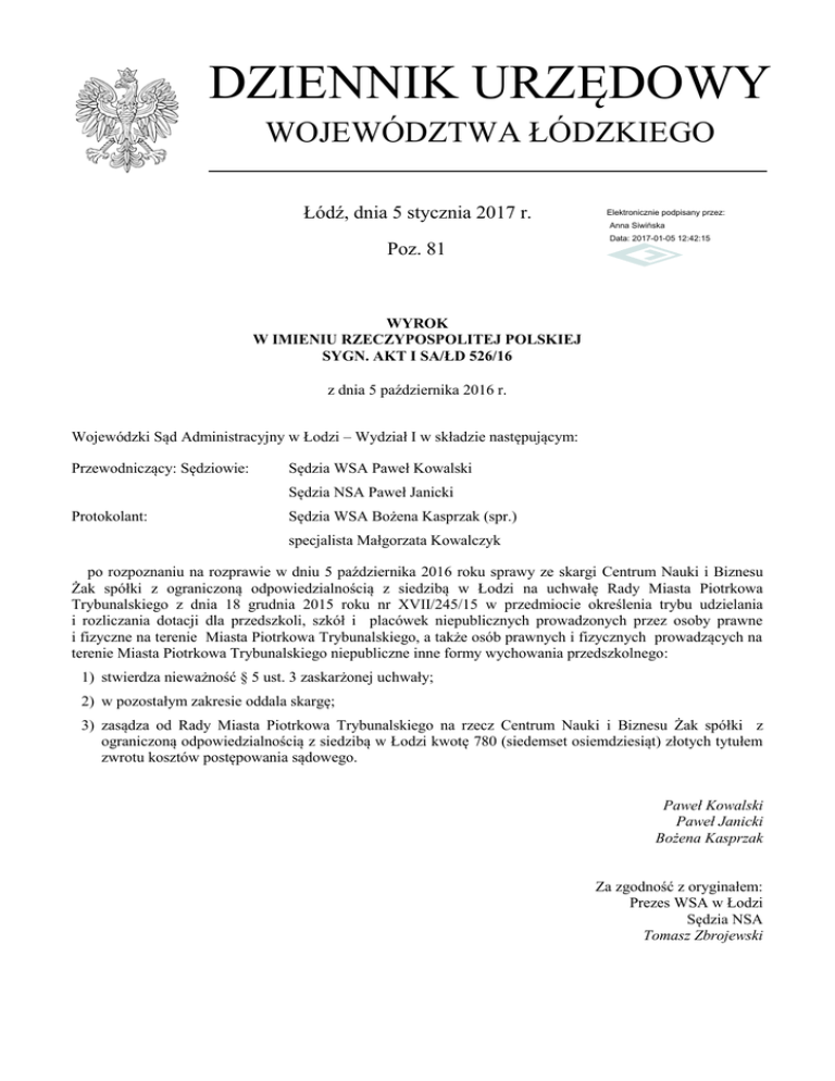 DZIENNIK URZĘDOWY WOJEWÓDZTWA ŁÓDZKIEGO Łódź, dnia 5 stycznia 2017 r. Elektronicznie podpisany przez: Anna Siwińska Poz. 81 Data: 2017-01-05 12:42:15 WYROK W IMIENIU RZECZYPOSPOLITEJ POLSKIEJ SYGN. AKT I SA/ŁD 526/16 z dnia 5 października 2016 r. Wojewódzki Sąd Administracyjny w Łodzi – Wydział I w składzie następującym: Przewodniczący: Sędziowie: Sędzia WSA Paweł Kowalski Sędzia NSA Paweł Janicki Protokolant: Sędzia WSA Bożena Kasprzak (spr.) specjalista Małgorzata Kowalczyk po rozpoznaniu na rozprawie w dniu 5 października 2016 roku sprawy ze skargi Centrum Nauki i Biznesu Żak spółki z ograniczoną odpowiedzialnością z siedzibą w Łodzi na uchwałę Rady Miasta Piotrkowa Trybunalskiego z dnia 18 grudnia 2015 roku nr XVII/245/15 w przedmiocie określenia trybu udzielania i rozliczania dotacji dla przedszkoli, szkół i placówek niepublicznych prowadzonych przez osoby prawne i fizyczne na terenie Miasta Piotrkowa Trybunalskiego, a także osób prawnych i fizycznych prowadzących na terenie Miasta Piotrkowa Trybunalskiego niepubliczne inne formy wychowania przedszkolnego: 1) stwierdza nieważność § 5 ust. 3 zaskarżonej uchwały; 2) w pozostałym zakresie oddala skargę; 3) zasądza od Rady Miasta Piotrkowa Trybunalskiego na rzecz Centrum Nauki i Biznesu Żak spółki z ograniczoną odpowiedzialnością z siedzibą w Łodzi kwotę 780 (siedemset osiemdziesiąt) złotych tytułem zwrotu kosztów postępowania sądowego. Paweł Kowalski Paweł Janicki Bożena Kasprzak Za zgodność z oryginałem: Prezes WSA w Łodzi Sędzia NSA Tomasz Zbrojewski