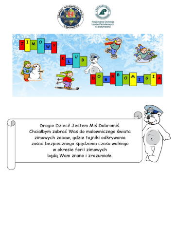 Drogie Dzieci! Jestem Miś Dobromiś. Chciałbym zabrać Was do malowniczego świata zimowych zabaw, gdzie tajniki odkrywania zasad bezpiecznego spędzania czasu wolnego w okresie ferii zimowych będą Wam znane i zrozumiałe. Z rozsypanek ułóż zdania mówiące o konieczności zachowania ostrożności podczas zimowych zabaw. z górek Nie zjeżdżaj porośniętych drzewami _________________________________________________________________________ w pobliżu Nie ślizgaj jezdni się __________________________________________________________________________ zamarznięte i stawy wchodź na jeziora nie ____________________________________________________________ sanek samochodów nie doczepiaj do ____________________________________________________________ kolegom kołnierz za śniegu nie wrzucaj ____________________________________________________________ dachami pod długie Nie przechodź z których zwisają lodowe sople ____________________________________________________________ śnieżkami samochody w nie rzucaj jadące ____________________________________________________________________________ na sankach w pobliżu jezdni nie zjeżdżaj zbiorników wodnych ____________________________________________________________________________ i Wśród rozsypanych liter w każdym poziomie odszukaj wyrazy kojarzące Ci się z feriami zimowymi, a następnie wpisz je poniżej. Q T L O D O W I S K O P G T S A N K I D P X M C V U I O L J H V T B A Ł W A N E Ś N I E Ż K A R W Q B I A C X V T K U L I G Y R C B U O Q E Y G T N A R T Y X S O P L E T L O D O W E U Z I M O W I S K O T Q A 1. ………………………………………………… 2. ………………………………………………… 3. ……………………………………………….. 4. ……………………………………………….. 5. ……………………………………………….. 6. ……………………………………………….. 7. ……………………………………………….. 8. ……………………………………………….. Rozwiąż krzyżówkę i odczytaj hasło. 1. 2. 3. 4. 5. 6. 7. 8. 9. 10. 11. 12. 13. 14. 15. Dla widoczności zawsze noś przy plecaku/ubraniu… One nie służą do rzucania w pojazdy. Jakie miejsca wybierasz do zimowych zabaw. Numer alarmowy 997 to numer do… Korzystając z Internetu nie rozmawiasz z… Spędzając ferie zimowe na wsi nie drażnisz… Zjeżdżając sankami z górki wybierasz miejsca, aby nie zjeżdżać wprost na… W niej pływają ryby, ale nie służy do jazdy na łyżwach. Biegowe albo zjazdowe. Nie wolno ich zalepiać w śnieg, gdyż rzucając śnieżkami można wyrządzić krzywdę swoim kolegom. Inaczej wypoczynek zimowy. Numer alarmowy 999 to numer do… Numer alarmowy 998 to numer do… Miejsce bezpieczne do jazdy na łyżwach. Nie przechodzisz pod dachami, z których zwisają… 1 2 3 4 5 6 7 8 9 10 11 12 11 13 14 15 W wolne miejsca wpisz wyrazy z ramki i odczytaj jak właściwie zachowywać się w czasie zimowego wypoczynku. nie zjeżdżaj, nie ślizgaj się, nie drażnij, nie rozmawiaj, nie doczepiaj, nie rzucaj .................. sanek do samochodów .................. na jeziorach i rzekach .................. w pobliżu jezdni .................. .................. z obcymi śnieżkami w kolegów/koleżanki i samochody .................. zwierząt Rozwiąż plątaninę sylabową. Zapisz hasło. Mu stwie czeń szę za pie bez wsze snym pa wła mię o tać _____________________________________________________________________________________ DYPLOM dla ……………………………………………...... za udział w akcji profilaktycznej pn. „ZIMOWY KLUB DOBROMISIA”