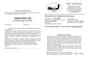 PPUH AUTO-HAK S.J. Produkcja Zaczepów Kulowych Henryk & Zbigniew Nejman 76-200 SŁUPSK ul. Słoneczna 16K tel/fax (059) 8-414-414; 8-414-413 E-mail: [email protected] www. autohak.com.pl KARTA GWARANCYJNA Producent udziela gwarancji niniejszą kartą gwarancyjną na okres 24 miesięcy licząc od dnia zakupu zaczepu kulowego do samochodu: Zaczep kulowy bez wyposaŜenia elektrycznego MERCEDES ML produkowanego od 1998r. Data produkcji .............................. Data zakupu............................................. D23 Klasa: A50-X Nr kat. Przeznaczony do zamontowania w samochodzie: Producent: MERCEDES Model: ML produkowanego od 1998r. do 2005r. Dane techniczne: Wartość siły D : 15,94 kN maksymalna masa przyczepy: 3500 kg maksymalny nacisk na kulę: 100 kg Numer homologacji zgodnie z dyrektywą 94/20/WE: e20*94/20*0601*00 Zakres gwarancji obejmuje wyłącznie wady jakościowe wynikające z winy producenta. Gwarancja nie obejmuje natomiast uszkodzeń zawinionych przez nabywcę, wynikających z niewłaściwego montaŜu, uŜytkowania lub konserwacji, uszkodzeń mechanicznych, normalnego zuŜycia podczas eksploatacji itp. Gwarancja udzielona na zakupiony towar nie wyłącza, nie ogranicza ani nie zawiesza uprawnień kupującego wynikających z niezgodności towaru z umową. Reklamacje naleŜy zgłaszać w punkcie sprzedaŜy, składając jednocześnie kartę gwarancyjną. Usunięcie "wady" następuje po stwierdzeniu przez punkt sprzedaŜy wspólnie z producentem słuszności złoŜonej reklamacji. Reklamacja powinna być załatwiona w ciągu 14 dni od dnia uznania reklamacji. Karta gwarancyjna jest niewaŜna jeŜeli nie jest wypełniona i podpisana. Data zgłoszenia reklamacji: ................................................................... INFORMACJA WSTĘPNA Zaczep kulowy jest skonstruowany zgodnie z zasadami bezpieczeństwa ruchu drogowego. Zaczep kulowy jest elementem wpływającym na bezpieczeństwo jazdy i moŜe zostać zainstalowany wyłącznie przez personel wyspecjalizowany. Niedopuszczalne jest dokonywanie jakichkolwiek zmian w konstrukcji zaczepu. Powoduje to wygaśniecie dopuszczenia do stosowania. W przypadku obecności masy izolacyjnej lub osłony podwozia w miejscu przylegania zaczepu, naleŜy ją usunąć. Nieosłonięte miejsca karoserii oraz wywiercone otwory naleŜy pomalować farbą antykorozyjną. Informacjami wiąŜącymi odnośnie wartości obciąŜeń są dane podawane przez producenta samochodu, względnie wartości maksymalnej masy przyczepy oraz maksymalnego nacisku na kulę, przy czym wartości parametrów zaczepu kulowego nie mogą być przekroczone. Wzór do obliczania wartości siły D: Maks. masa przyczepy [kg] x Maks. masa samochodu [kg] Maks. masa przyczepy [kg] + Maks. masa samochodu [kg] X 9,81 = 1000 D [kN] INSTRUKCJA MontaŜu i eksploatacji zaczepu kulowego B Oznaczenie zacisku wg ISO PN 1 L 2 + 3 31 4 R 5 58R 6 54 7 58L Łączenie przewodów Kierunkowskazy lewe Tylne światła przeciwmgłowe Masa Kierunkowskazy prawe Światła pozycyjne prawe Światła hamowania Światła pozycyjne lewe M12x110 B Tulejka L=90mm Tulejka L=58mm C M12x130 M14x1.5x45 Kolejność czynności przy montaŜu 1. Zdemontować zderzak. 2. W fabrycznej belce znajdują się 4 otwory M14x1.5, do których naleŜy przykręcić płytę dystansową (poz. D) śrubami M14x1.5x45 a następnie do płyty część kulistą (poz. A) śrubami M12x35 z wyposaŜenia. 3. W celu wzmocnienia tylnej belki (fabrycznej) naleŜy elementy zaczepu (poz. B) przyłoŜyć do wewnętrznych stron ramy i skręcić uŜywając tulejek dystansowych oraz płaskowników dystansowych (poz. C) jak pokazano na rys. Przy przykręcaniu śrub M12x130 pamiętać o płycie pod gniazdo z lewej strony! 4. Dokręcić wszystkie śruby z momentem jak pokazano w tabeli. 5. Podłączyć przewody gniazdka 7 – bieg. do instalacji elektrycznej zgodnie z instrukcją fabryczną samochodu (zaleca się wykonanie w ASO). 6. Uzupełnić ewentualne ubytki powłoki malarskiej zaczepu powstałe w trakcie montaŜu D M12x35 Belka fabryczna M12x130 M12x110 A Zaczep kulowy przeznaczony jest do zamontowania w samochodzie: MERCEDES ML, produkowanym od 1998r. do 2005r., numer katalogowy D23 i słuŜy do ciągnięcia przyczep o masie całkowitej 3500 kg i nacisku na kulę max 100 kg. INFORMACJA WSTĘPNA Zaczep kulowy jest skonstruowany zgodnie z zasadami bezpieczeństwa ruchu drogowego a jego niezawodność została potwierdzona licznymi testami. JednakŜe niezawodność zaczepów kulowych jest zaleŜna równieŜ od prawidłowego montaŜu oraz prawidłowej eksploatacji. Z tego powodu prosimy Państwa o staranne przeczytanie niniejszej instrukcji montaŜu oraz przestrzeganie właściwych wskazówek. Zaczep naleŜy zamontować w miejscach do tego celu przeznaczonych przez producenta samochodu. Zalecany moment skręcający dla śrub i nakrętek 8,8: M6 - 11 Nm M8 - 25 Nm M10 - 50 Nm M12 - 87 Nm M14 - 138 Nm M16 - 210 Nm UWAGA Po zamontowaniu zaczepu kulowego naleŜy uzyskać wpis w dowodzie rejestracyjnym pojazdu na „stacji kontroli pojazdów” właściwej dla miejsca zamieszkania. Samochód powinien być wyposaŜony w : -kierunkowskazy boczne -lusterka boczne o rozstawie co najmniej szerokości przyczepy Sprawdzać śruby mocujące zaczepu kulowego po około 1 000 km przebiegu eksploatacji. Kula zaczepu musi być utrzymana w czystości i konserwowana smarem stałym.