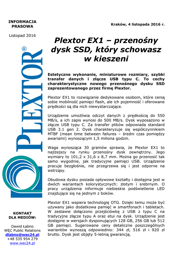 INFORMACJA PRASOWA Listopad 2016 Kraków, 4 listopada 2016 r. Plextor EX1 – przenośny dysk SSD, który schowasz w kieszeni Estetyczne wykonanie, miniaturowe rozmiary, szybki transfer danych i złącze USB typu C. To cechy charakterystyczne nowego przenośnego dysku SSD zaprezentowanego przez firmę Plextor. Plextor EX1 to rozwiązanie dedykowane osobom, które cenią sobie mobilność pamięci flash, ale ich pojemność i oferowane prędkości są dla nich niewystarczające. Urządzenie umożliwia odczyt danych z prędkością do 550 MB/s, a ich zapis wynosi do 500 MB/s. Dysk wyposażono w złącze USB typu C. Za transfer plików odpowiada standard USB 3.1 gen 2. Dysk charakteryzuje się współczynnikiem MTBF (mean time between failures – średni czas pomiędzy awariami) wynoszącym 1,5 miliona godzin. Waga wynosząca 30 gramów sprawia, że Plextor EX1 to najlżejszy na rynku przenośny dysk zewnętrzny. Jego wymiary to 101,2 x 31,6 x 8,7 mm. Można go przenosić tak samo wygodnie, jak tradycyjne pamięci USB. Urządzenie pracuje bezgłośnie, nie przegrzewa się i jest odporne na wstrząsy. Obudowa dysku posiada opływowe kształty i dostępna jest w dwóch wariantach kolorystycznych: złotym i srebrnym. O pracy urządzenia informuje niebieskie podświetlenie LED znajdujące się na jednym z boków. KONTAKT DLA MEDIÓW: Dawid Łabno WĘC Public Relations [email protected] +48 535 954 279 www.wec24.pl Plextor EX1 wspiera technologię OTG. Dzięki temu może być używany jako dodatkowa pamięć w smartfonach i tabletach. W zestawie dołączono przejściówkę z USB z typu C na tradycyjne złącze typu A oraz etui na dysk. Urządzenie jest dostępne w wersjach dysponujących 128 GB, 256 GB lub 512 GB pamięci. Sugerowane ceny detaliczne poszczególnych wariantów wynoszą odpowiednio: 344 zł, 516 zł i 920 zł brutto. Dysk jest objęty 5-letnią gwarancją. INFORMACJA PRASOWA Listopad 2016 Tagi: Plextor, EX1, SSD, dysk ssd, dysk zewnętrzny, dysk przenośny, USB, USB type C, USB 3.1, pamięć flash, pendrive, przenośny SSD, mały dysk SSD, USB typu C, złącze USB C O marce Plextor Plextor to wiodący producent wielokrotnie nagradzanych napędów optycznych i urządzeń pamięci masowej. Właścicielem marki jest japońska firma Shinano Kenshi. Od wprowadzenia na rynek pierwszego napędu CD-ROM, w roku 1989, Plextor wytrwale dąży do utrzymania wysokiej jakości i maksymalnej wydajności oferowanych produktów. Więcej informacji: www.goplextor.com/pl KONTAKT DLA MEDIÓW: Dawid Łabno WĘC Public Relations [email protected] +48 535 954 279 www.wec24.pl