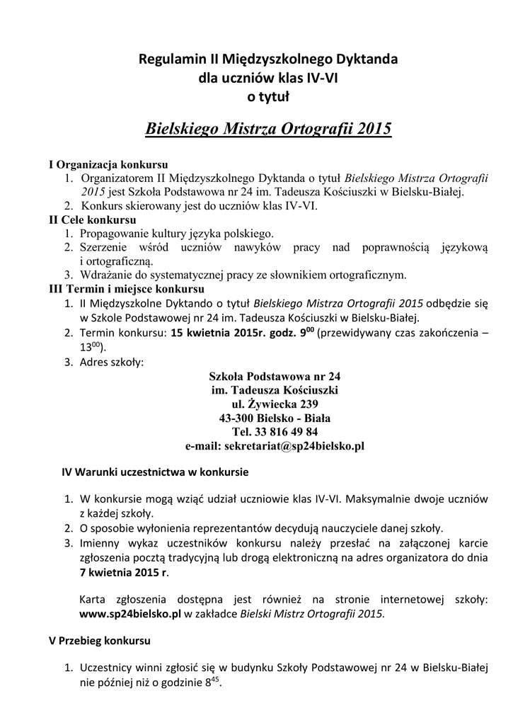 Regulamin II Międzyszkolnego Dyktanda dla uczniów klas IV-VI o tytuł Bielskiego Mistrza Ortografii 2015 I Organizacja konkursu 1. Organizatorem II Międzyszkolnego Dyktanda o tytuł Bielskiego Mistrza Ortografii 2015 jest Szkoła Podstawowa nr 24 im. Tadeusza Kościuszki w Bielsku-Białej. 2. Konkurs skierowany jest do uczniów klas IV-VI. II Cele konkursu 1. Propagowanie kultury języka polskiego. 2. Szerzenie wśród uczniów nawyków pracy nad poprawnością językową i ortograficzną. 3. Wdrażanie do systematycznej pracy ze słownikiem ortograficznym. III Termin i miejsce konkursu 1. II Międzyszkolne Dyktando o tytuł Bielskiego Mistrza Ortografii 2015 odbędzie się w Szkole Podstawowej nr 24 im. Tadeusza Kościuszki w Bielsku-Białej. 2. Termin konkursu: 15 kwietnia 2015r. godz. 900 (przewidywany czas zakończenia – 1300). 3. Adres szkoły: Szkoła Podstawowa nr 24 im. Tadeusza Kościuszki ul. Żywiecka 239 43-300 Bielsko - Biała Tel. 33 816 49 84 e-mail: [email protected] IV Warunki uczestnictwa w konkursie 1. W konkursie mogą wziąć udział uczniowie klas IV-VI. Maksymalnie dwoje uczniów z każdej szkoły. 2. O sposobie wyłonienia reprezentantów decydują nauczyciele danej szkoły. 3. Imienny wykaz uczestników konkursu należy przesłać na załączonej karcie zgłoszenia pocztą tradycyjną lub drogą elektroniczną na adres organizatora do dnia 7 kwietnia 2015 r. Karta zgłoszenia dostępna jest również na stronie internetowej szkoły: www.sp24bielsko.pl w zakładce Bielski Mistrz Ortografii 2015. V Przebieg konkursu 1. Uczestnicy winni zgłosić się w budynku Szkoły Podstawowej nr 24 w Bielsku-Białej nie później niż o godzinie 845. 2. Opiekunowie uczniów będą tworzyli Komisję Konkursową. 3. Uczeń może korzystać tylko z materiałów, które otrzyma od organizatorów w trakcie konkursu. VI Zakres treściowy konkursu 1. Konkurs składa się z dyktanda ortograficznego. 2. Tekst dyktanda obejmuje różne reguły ortograficzne oraz wyjątki. VII Poprawa i ocena prac konkursowych 1. Prace konkursowe poprawia Komisja Sprawdzająca, powołana przez organizatora. 2. Komisja ocenia prace konkursowe według wzoru i zasad punktowania przygotowanego przez organizatora. 3. Decyzja Komisji Sprawdzającej jest ostateczna. VIII Nagrody 1. Dla zwycięzców konkursu organizator przewiduje nagrody rzeczowe. 2. Wręczenie nagród oraz dyplomów nastąpi w dniu konkursu. IX Postanowienia końcowe 1. W kwestiach spornych organizator konkursu zastrzega sobie prawo do wyłącznego interpretowania regulaminu. 2. Uczestnicy konkursu przynoszą jedynie długopis lub pióro do pisania. 3. Zabrania się pisać ołówkiem i używać korektora. 4. Uczestnicy będą pisać dyktando na kartkach przygotowanych przez organizatora, opatrzonych pieczęcią szkoły. 5. Tekst dyktanda konkursowego przechowywany jest w oryginalnej zabezpieczonej kopercie, która zostanie komisyjnie otwarta w dniu konkursu. Wybrany uczeń wylosuje tekst dyktanda spośród dwóch. 6. Za przebieg i organizację konkursu odpowiedzialna jest: Aneta Rymarczyk, email: [email protected], tel. 786 819 029 Zakres materiału 1. Pisownia zmiękczeń (w tym zakończeń bezokoliczników). 2. Pisownia spółgłosek dźwięcznych i bezdźwięcznych. 3. Pisownia wyrazów z ó: wymiennym; niewymiennym; w zakończeniach rzeczowników: -ów, -ówka, -ówna . 4. Pisownia wyrazów z u: we wszystkich formach osobowych czasowników czasu teraźniejszego i trybu rozkazującego zakończonych na: -uje, -uj, -uję, - ujesz, itp.; na początku i na końcu wyrazów. 5. Pisownia wyrazów z rz: wymiennym; niewymiennym; po spółgłoskach: p, b, t, d, k, g, j, w, ch; w zakończeniach rzeczowników: -mistrz, -mierz, -arz, -erz. 6. Pisownia wyrazów z ż: wymiennym (na g, dz, h, s, z, ź); niewymiennym; w rzeczownikach rodzaju żeńskiego zakończonych na –aż, -eż; rzeczownikach rozpoczynających się cząstką ża-, żo-, żu-, ży-. 7. Pisownia wyrazów z ch: wymiennym (na sz); niewymiennym; na końcu wyrazów; po spółgłoskach. 8. Pisownia wyrazów z h: wymiennym (na g, z, ż); niewymiennym; w wyrazach obcego pochodzenia rozpoczynających się cząstkami hipo–, hydro-, hiper-; po spółgłosce z. 9. Pisownia wyrazów z ę, ą w wyrazach rodzimych lub w wyrazach spolszczonych; ę w M., B., W. lp. niektórych rzeczowników rodzaju nijakiego; ę w B. lp. i ą w N. lp. w zakończeniach rzeczowników i przymiotników; ą, ę w zakończeniach czasowników. 10.Pisownia wyrazów z om, on, em, en: w wyrazach obcego pochodzenia; w zakończeniach rzeczowników –om i -em w C. lm. oraz w N. lp. 11.Pisownia wyrazów wielką literą. 12.Pisownia partykuły nie z różnymi częściami mowy. 13.Pisownia liczebników głównych i porządkowych. 14.Pisownia przymiotników w stopniu wyższym i najwyższym. 15.Pisownia wyrażeń przyimkowych. 16.Pisownia wyjątków. WSZELKIE KWESTIE SPORNE BĘDĄ ROZSTRZYGANE W OPARCIU O SŁOWNIK ORTOGRAFICZNY PWN Kryteria oceny dyktanda Do błędów ortograficznych zalicza się: niepoprawnie zapisane wyrazy z u-ó, h-ch, rz-ż; pisownia wyrazów z nie; pisownia wielką literą; pisownia przyimków złożonych; pisownia wyrażeń przyimkowych; pisownia samogłosek nosowych ę, ą; pisownia połączeń spółgłoskowych en, em, on, om; pisownia wyrazów złożonych; mylenie zapisu głosek (b:p, d:t). Do błędów ortograficznych zalicza się również: brak znaków diakrytycznych; nieprawidłowe przenoszenie wyrazów. Za każdy błąd ortograficzny odejmowane są 2 punkty. Za każdy błąd interpunkcyjny lub kompozycyjny (akapit) odejmowany jest 1 punkt. Tytuł Bielskiego Mistrza Ortografii 2015 zdobywa uczeń, który uzyska najmniej ujemnych punktów. Uwagi: 1. Jeżeli uczeń powtórzy ten sam błąd, nie odejmuje mu się powtórnie punktów. Jeżeli natomiast się pomyli, powinien skreślić niepoprawnie zapisany wyraz i zanotować go ponownie we właściwej formie. 2. Brak litery w wyrazie lub całego wyrazu tr