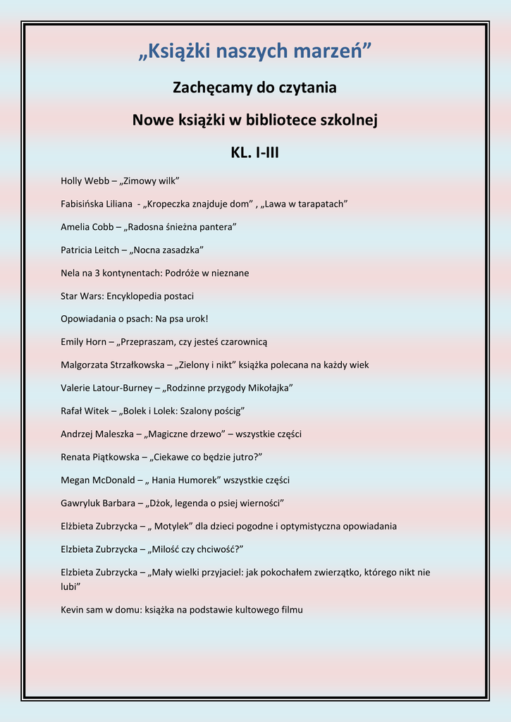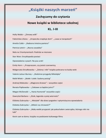 „Książki naszych marzeń” Zachęcamy do czytania Nowe książki w bibliotece szkolnej KL. I-III Holly Webb – „Zimowy wilk” Fabisińska Liliana - „Kropeczka znajduje dom” , „Lawa w tarapatach” Amelia Cobb – „Radosna śnieżna pantera” Patricia Leitch – „Nocna zasadzka” Nela na 3 kontynentach: Podróże w nieznane Star Wars: Encyklopedia postaci Opowiadania o psach: Na psa urok! Emily Horn – „Przepraszam, czy jesteś czarownicą Malgorzata Strzałkowska – „Zielony i nikt” książka polecana na każdy wiek Valerie Latour-Burney – „Rodzinne przygody Mikołajka” Rafał Witek – „Bolek i Lolek: Szalony pościg” Andrzej Maleszka – „Magiczne drzewo” – wszystkie części Renata Piątkowska – „Ciekawe co będzie jutro?” Megan McDonald – „ Hania Humorek” wszystkie części Gawryluk Barbara – „Dżok, legenda o psiej wierności” Elżbieta Zubrzycka – „ Motylek” dla dzieci pogodne i optymistyczna opowiadania Elzbieta Zubrzycka – „Milość czy chciwość?” Elzbieta Zubrzycka – „Mały wielki przyjaciel: jak pokochałem zwierzątko, którego nikt nie lubi” Kevin sam w domu: książka na podstawie kultowego filmu KL. IV – VI A.U. Mielech – „ Jaga Czekolada i Baszta Czarownic Anna Kantoch - „Tajemnica nawiedzonego lasu” Marcin Szczygielski - „Arka czasu: czyli wielka ucieczka Rafała od kiedyś przez wtedy do teraz i wstecz” książka ta zdobyła wiele nagród m.in. Grand Prix książka polecana również dla gimnazjalistów Aga Szczepańska – „Patka i Pepe” Rafał Kosik – „Felix, Net i Nika oraz Klątwa Domu McKillianów” Olech Joanna „Tarantula Klops i Herkules” Chmielewski Henryk – „Tytus, Romek i A’Tomek” wszystkie księgi Jeff Kinney – „Dziennik cwaniaczka” wszystkie części St John Lauren – „Biała żyrafa” Agnieszka Stelmaszyk – „Kroniki Archeo” wszystkie części Rick Riordan – „Percy Jackson i Bogowie Olimpijscy” wszystkie części Moony Witcher – „Dziewczynka z szóstego księżyca” Gimnazjum Marcin Szczygielski - „Arka czasu: czyli wielka ucieczka Rafała od kiedyś przez wtedy do teraz i wstecz” książka ta zdobyła wiele nagród m.in. Grand Prix Katarzyna Ryrych – „Król” John Flanagan – „Zwiadowcy: Wczesne lata” Camila Lackberg – „Pogromca lwów” Zafon C.R. – „Cień wiatru” Terakowska Dorota – „Samotność bogów” Malala Yousafzai, Christina Lamb – „To ja, Malala” Felicity Brooks – „O dojrzewaniu dla dziewczyn” Felicity Brooks – „O dojrzewaniu dla chłopaków” Biblioteka Szkolna