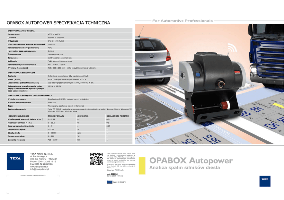 OPABOX AUTOPOWER SPECYFIKACJA TCHNICZNA SPECYFIKACJA TECHNICZNA Temperatura +5°C ÷ +40°C Ciśnienie 850 hPa ÷ 1025 hPa Wilgotność 0 % RH ÷ 95 % RH Efektywna długość komory pomiarowej 200 mm Temperatura komory pomiarowej 75°C Maxymalny czas nagrzewania 5 minut Źródło światła Zielona dioda LED Zerowanie Elektroniczne i automatyczne Kalibracja Elektroniczne i automatyczne Temperatura przechowywania Min. -20 Max. +60 °C Wymiary (bez wózka) 460 x 200 x 250 mm - 15 kg (przybliżona masa z wózkiem) SPECYFIKACJE ELEKTRYCZNE Zasilanie 2 ołowiowe akumulatory 12V o pojemności 7A/h Pobór (maks.) 80 W (zabezpieczenie bezpiecznikiem 2 x 1 A Ładowanie z jednostki zasilającej 115-230 V prądem zmiennym ± 10%, 50-60 Hz ± 2% Automatyczne sygnalizowanie zmian napięcia akumulatora wykraczającego poza ustalony zakres 11,3 V ÷ 14,5 V SPECYFIKACJE SPRZĘTU I OPROGRAMOWANIA Wyjście szeregowe Standardowy RS232 z zastrzerzonym protokołem Wyjście bezprzewodowe Bluetooth Zegar Wewnętrzny, zasilany z baterii systemowej System sterowania Płyta CD NERO zawierająca oprogramowanie do analizatora spalin- kompatybilna z Windows XP, Windows 2000 oraz Windows Vista Mierzone wilekości Zakres pomiaru Jednostka Dokładność pomiaru Współczynnik absorbcji światła K [m ] 0 ÷ 9.99 m 0.01 Nieprzezroczystość N [%] 0 ÷ 99.9 % 0.1 Czas wzrostu obrotów silnika 0÷5 s 0.05 -1 -1 Temperatura spalin 0 ÷ 300 °C 1 Obroty silnika 0 ÷ 10000 rpm 1 Temperatura oleju 0 ÷ 200 °C 1 Ciśnienie otoczenia 750 ÷ 1100 hPa 1 TEXA Poland Sp. z o.o. ul. Babińskiego, 4 330-393 Kraków - POLAND Phone: 0048-12-263 10 12 Fax 0048-12-263 29 85 www.texapoland.pl [email protected] AUTORYZOWANI DYSTRYBUTORZY Dane, opisy i ilustracje mogą ulegać zmianie zgodnie z informacjami zawartymi w niniejszej ulotce. Texa S.p.A. zastrzega sobie prawo do wprowadzania jakichkolwiek zmian do swoich produktów, bez żadnego wcześniejszego ostrzeżenia. BLUETOOTH jest marką pozostającą własnością firmy Bluetooth SIG, Inc., U.S.A. na licencji dla Texa S.p.A. Copyright TEXA S.p.A. cod. 8800264 Lipiec 2008 - Polacco MADE IN EUROPE OPABOX Autopower Analiza spalin silników diesla REWOLUCJA W WARSZTATACH TEXA jest wiodącą firmą na rynku światowym w dziedzinie diagnostyki samochodów osobowych, motocykli oraz pracować bez niewygodnych często utrudniających testy kabli elektrycznych. samochodów ciężarowych. Posiada również własną sieć sprzedaży w takich krajach jak Hiszpania, Niemcy, Wielka Bezprzewodowe połączenie Bluetooth zapewnia komunikację między modułem OPABOX Autopower i RC3 (inter- Brytania, Francja, Polska oraz Stany Zjednoczone. fejs odczytujący obroty i temperaturę silnika), a urządzeniami takimi jak komputer, stacja MULTI PEGASO, AXONE Dzięki wieloletniemu doświadczeniu i wysoko wykwalifikowanej kadrze działu badawczo-rozwojowego, TEXA ofe- Palm lub Pad. ruje dziś w pełni nowoczesne rozwiązania dla warsztatów i stacji obsługi pojazdów. OPABOX Autopower jest nowym modułem przeznaczonym do analizy spalin dla silników o zapłonie samoczyn- Operator będzie mógł zmieniać dowolnie swoje położenie bez konieczności zachowania niewielkiej odległości od nym, a w szczególności do wykonywania „analizy spalin” na potrzeby diagnostyki (w przypadku gdy występuje: analizatora. Tak więc możliwe jest nawet przeprowadzenie testu samochodu pozostawionego na zewnątrz war- brak mocy silnika, zbyt duże spalanie, zapalona kontrolka silnika, uruchamianie zimnego silnika, test katalizatora sztatu. itd.), ale także do sprawdzenia czy dany pojazd spełnia normy ochrony środowiska. Moduł OPABOX Autopower został zaprojektowany jako RC3 czyli interfejs odczytujący obroty oraz temperaturę silnika, pozwala na testy urządzenie praktyczne i wielofunkcyjne, spełniające wszystkie samochodów nowej generacji bez potrzeby otwierania maski pojazdu. Innowacja ta wymagania pracujących na nim mechaników. Poprzedni model skraca czas pracy i upraszcza wszystkie procedury dotyczące analizy spalin. został wyposażony w poręczny wózek. Wysuwając praktyczny RC3 jest jedynym modułem łączącym w sobie trzy tryby odczytu: teleskopowy uchwyt możemy z łatwością przemieszczać anali- - przez port EOBD we wszystkich samochodach wyprodukowanych po roku 2000; zator w warsztacie ustawiając go w pobliżu samochodu, który - za pomocą mikrofonu i przy użyciu akumulatora we wszystkich pojazdach; ma zostać przetestowany. - tradycyjnie, używając zacisku indukcyjnego oraz sondy piezoelektrycznej w samochodach wyposażonych w silnik benzynowy i diesla. Kolejnym wygodnym rozwiązaniem jest zastosowanie specjalnej dźwigni, po odblokowaniu której można zdjąć cały moduł i przenieść go w dowolne miejsce. PROSTE I PEŁNE OPROGRAMOWANIE System operacyjny dostarczany jest na CD NERO i zawiera kompletną bazę danych Gwarantowany czas pracy urządzenia to pełny dzień, bez pozwalającą na wybór z MENU głównego marki, modelu oraz silnika; aktywowana konieczności ładowania baterii. OPABOX Autopower jest wyposażony w wysoko-pojemną baterię dostarczającą energię Licensed material, program property of TEXA www.texa.com All Rights Reserved Release przez ponad 8 godzin. Dzięki temu mechanik może swobodnie Unauthorized use, duplication or distribution is a violation of applicable laws zostaje sekwencja wskazówek, która poprowadzi krok po kroku operatora podczas przeprowadzania testu. Możliwa jest również integracja oprogramowania analizatora spalin z systemem IDC3, wtedy wyniki testów można odczytywać bezpośrednio z programów diagnostycznych zawartych w IDC3. Strona startowa oprogramowania Strona pomiarowa z urządzenia zwierająca okno wyboru marki, odczytującego modelu oraz typu silnika z syste- temperaturę silnika (w przypad- mu IDC3. ku użycia interfejsu RC3). obroty i Strona pomiarowa/analiza spalin