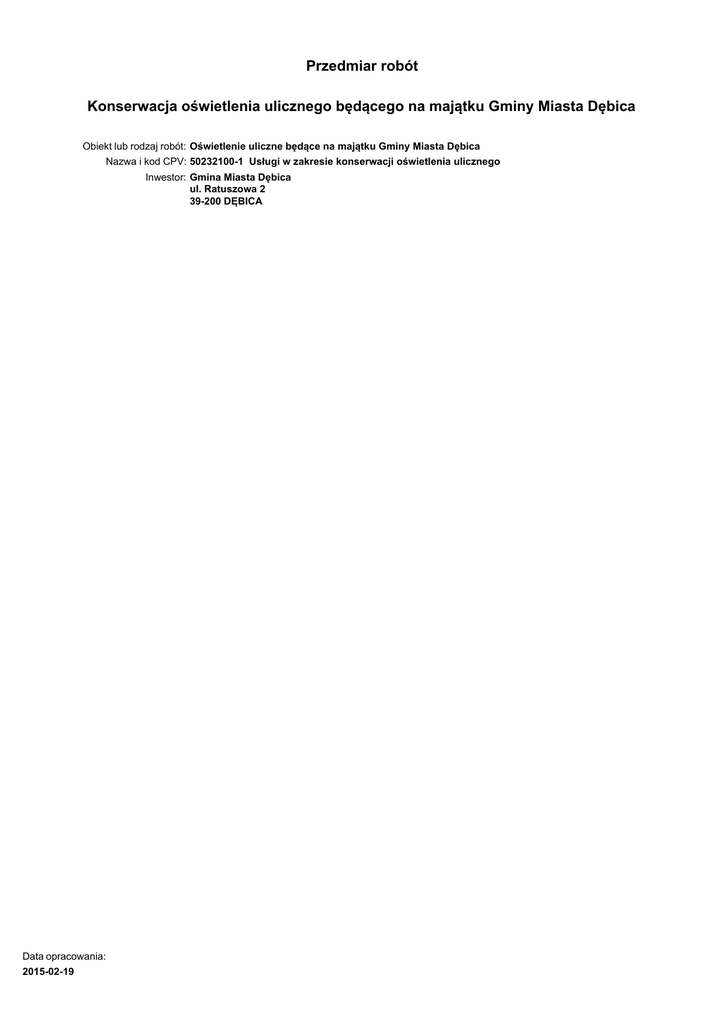 Przedmiar robót Konserwacja oświetlenia ulicznego będącego na majątku Gminy Miasta Dębica Obiekt lub rodzaj robót: Oświetlenie uliczne będące na majątku Gminy Miasta Dębica Nazwa i kod CPV: 50232100-1 Usługi w zakresie konserwacji oświetlenia ulicznego Inwestor: Gmina Miasta Dębica ul. Ratuszowa 2 39-200 DĘBICA Data opracowania: 2015-02-19 Konserwacja oświetlenia - 2011 ZUZIA11 (C) Datacomp 1994-2014 (lic. 000541C4) strona nr: 2 Ogólna charakterystyka robót Kosztorys obejmuje wycenę czynności awaryjnych występujących w trakcie eksploatacji oświetlenia ulicznego m.in. takich jak: wymiany uszkodzonych elementów układów zasilania i sterowania, wymiany uszkodzonych słupów oświetleniowych, wymiany wysięgników, uszkodzonych tabliczek słupowych, drzwiczek wnękowych latarni, opraw oświetleniowych, źródeł światła,likwidacja awarii w urządzeniach oświetlenia ulicznego, lokalizacja uszkodzenia linii oświetleniowej kablowej i.t.p. Przedmiar robót <-NR-> <-PODST-> Nr 1 1.1 1.2 1.3 1.4 1.5 1.6 1.7 1.8 1.9 1.10 1.11 1.12 1.13 1.14 1.15 1.16 1.17 1.18 1.19 1.20 1.21 1.22 1.23 1.24 1.25 1.26 1.27 1.28 1.29 1.30 1.31 1.32 1.33 1.34 Podstawa Kosztorys <-OPIS-> <-JEDN-> Opis robót <-ILOSC-> Jm Ilość Konserwacja oświetlenia ulicznego będącego na majątku Gminy Miasta Dębica Element Konserwacja oświetlenia ulicznego będącego na majątku Gminy Miasta Dębica KNNR 9/1005/1 Oprawy oświetlenia zewnętrznego, wymiana na trzpieniu słupa lub wysięgnika - wymiana źródła światła WLS150W p.a. R = 0,500 M = 1,000 S = 0,500 KNNR 9/501/2 Oprawy oświetleniowe zawieszane, przykręcane, wymiana oprawy świetlówkowej do 3x40˙W, 1x40˙W (1) wymiana źródła światła 36W p.a. R = 0,500 M = 1,000 S = 1,000 KNNR 9/1005/3 Oprawy oświetlenia zewnętrznego, demontaż na trzpieniu słupa lub wysięgnika KNNR 9/1005/3 Oprawy oświetlenia zewnętrznego, demontaż na trzpieniu słupa lub wysięgnika - montaż oprawy z demontażu KNNR 9/1005/1 Oprawy oświetlenia zewnętrznego, wymiana na trzpieniu słupa lub wysięgnika - OCP-70, klosz przezroczysty, źródło światła HST70W KNNR 9/1005/1 Oprawy oświetlenia zewnętrznego, wymiana na trzpieniu słupa lub wysięgnika - SGS 102/150 kompletna KNNR 9/501/2 Oprawy oświetleniowe zawieszane, przykręcane, wymiana oprawy świetlówkowej do 3x40˙W (1) KNNR 9/1001/8 Słupy oświetleniowe, demontaż słupa, masa do 300˙kg - dem. słupa parkowego KNNR 9/1001/2 Słupy oświetleniowe, wymiana słupa, masa do 300˙kg - słup stalowy 8m (1) KNNR 9/1004/3 Przewody izolowane w słupach oświetleniowych, rurach osłonowych, wysięgnikach oraz na linkach (1) nośnych przewieszek, wymiana przewodów w latarniach o wysokości do 10˙m KNNR 9/1006/2 Tabliczki bezpiecznikowe i skrzynki rozdzielcze, wymiana tabliczki bezpiecznikowej KNNR 9/203/1 Aparaty elektryczne, masa do 2.5˙kg, wymiana - gniazdo bezpiecznikowe KNR 403/305/1 Wymiana wkładek topikowych, prąd znamionowy do 25˙A KNNR 5/906/2 Montaż skrzynki bezpiecznikowej SV KNNR 9/1005/1 Oprawy oświetlenia zewnętrznego, wymiana na trzpieniu słupa lub wysięgnika - p.a. wymiana ukł zapłonowego IDS4.1 KNNR 5/902/7 Montaż konstrukcji stalowych i osprzętu linii napowietrznej nn, odgromnik GZA 0,66/2,5, po wejściu na (1) słup KNNR 5/906/3 Montaż ogranicznika przepięć GXO KNNR 9/1002/6 Wysięgniki rurowe, demontaż wysięgnika mocowanego na słupie lub ścianie, ciężar do 30˙kg KNNR 5/1002/1 Montaż wysięgników rurowych i przewieszek z lin stalowych, na słupie, wysięgnik do 15˙kg KNNR 9/1006/1 Tabliczki bezpiecznikowe i skrzynki rozdzielcze, wymiana tabliczki zaciskowej KNR 403/313/2 Wymiana drzwiczek wnękowych z kotwami, do 0,5˙m2, na podłożu betonowym KNNR 9/203/1 Aparaty elektryczne, masa do 2.5˙kg, wymiana - Programator CPA4.0 KNNR 9/203/1 Aparaty elektryczne, masa do 2.5˙kg, wymiana - stycznik KNNR 9/203/1 Aparaty elektryczne, masa do 2.5˙kg, wymiana - statecznik KNNR 9/801/2 Kable wielożyłowe układane w ziemi, wymiana kabla do 2,0˙kg/m, kategoria gruntu III-IV KNNR 9/304/2 Przewody kabelkowe wciągane w rury instalacyjne, wymiana przewodu, łączny przekrój żył do 30˙mm2 KNNR 9/806/1 Mufy z tworzyw termokurczliwych przelotowe na kablach energetycznych wielożyłowych o izolacji i powłoce z tworzyw sztucznych w rowach kablowych, kabel o przekroju żył do 35˙mm2 KNNR 5/907/5 Mechaniczne pogrążanie uziomów pionowych prętowych, kategoria gruntu III KNR 510/710/1 Malowanie słupów stalowych oświetleniowych, słup o wysokości do 5˙m R = 0,955 M = 1,000 S = 1,000 KNR 510/710/1 Malowanie słupów stalowych oświetleniowych, słup o wysokości do 5˙m - dod. za drugie malowanie R = 0,955 M = 1,000 S = 1,000 KNR 510/710/3 Malowanie słupów stalowych oświetleniowych, słup o wysokości do 9˙m R = 0,955 M = 1,000 S = 1,000 KNR 510/710/3 Malowanie słupów stalowych oświetleniowych, słup o wysokości do 9˙m - dod. za drugie malowanie R = 0,600 M = 1,000 S = 0,600 KNR 510/710/3 Malowanie słupów stalowych oświetleniowych, słup o wysokości do 9˙m - malowanie wysięgników p.a. R = 0,500 M = 0,300 S = 0,500 KNR 510/710/3 Malowanie słupów stalowych oświetleniowych, słup o wysokości do 9˙m - dod. za drugie malowanie p.a. R = 0,400 M = 0,300 S = 0,400 ZUZIA11 (C) Datacomp 1994-2014 (lic. 000541C4) kpl 40 szt kpl 10 1 kpl 1 kpl 3 kpl 12 szt słup 1 1 słup 1 kpl szt szt szt szt 1 1 1 20 1 kpl 15 szt szt szt szt szt szt szt szt szt m m 1 1 1 10 1 4 1 1 15 20 1 szt m 1 3 szt 1 szt 1 szt 20 szt 20 szt 1 szt 1 Konserwacja oświetlenia ulicznego będącego na majątku Gminy Miasta Dębica Konserwacja oświetlenia - 2011 <-NR-> <-PODST-> ZUZIA11 (C) Datacomp 1994-2014 (lic. 000541C4) strona nr: 3 <-OPIS-> <-JEDN-> Nr Podstawa Opis robót 1.35 KNNR 2/1403/2 Malowanie powierzchni metalowych pełnych, drzwi, drzwiczki i elementy pełne o powierzchni ponad (1) 0.50˙m2, farba olejna (dm3) 1.36 KNNR 5/1304/5 Badania i pomiary instalacji uziemiającej,