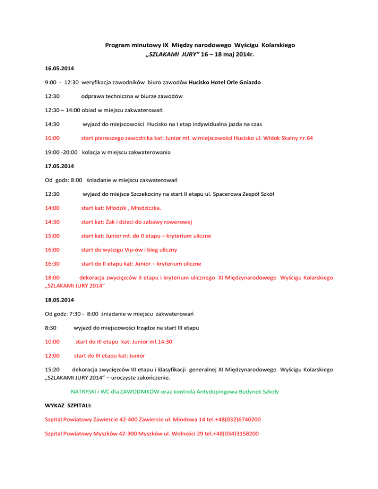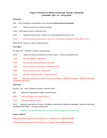Program minutowy IX Między narodowego Wyścigu Kolarskiego „SZLAKAMI JURY” 16 – 18 maj 2014r. 16.05.2014 9:00 - 12:30 weryfikacja zawodników biuro zawodów Hucisko Hotel Orle Gniazdo 12:30 odprawa techniczna w biurze zawodów 12:30 – 14:00 obiad w miejscu zakwaterowań 14:30 wyjazd do miejscowości Hucisko na I etap indywidualna jazda na czas 16:00 start pierwszego zawodnika kat: Junior mł. w miejscowości Hucisko ul. Widok Skalny nr.64 19:00 -20:00 kolacja w miejscu zakwaterowania 17.05.2014 Od godz: 8:00 śniadanie w miejscu zakwaterowań 12:30 wyjazd do miejsce Szczekociny na start II etapu ul. Spacerowa Zespół Szkół 14:00 start kat: Młodzik , Młodziczka. 14:30 start kat: Żak i dzieci do zabawy rowerowej 15:00 start kat: Junior mł. do II etapu – kryterium uliczne 16:00 start do wyścigu Vip-ów i bieg uliczny 16:30 start do II etapu kat: Junior – kryterium uliczne 18:00 dekoracja zwycięzców II etapu i kryterium ulicznego XI Międzynarodowego Wyścigu Kolarskiego „SZLAKAMI JURY 2014” 18.05.2014 Od godz: 7:30 - 8:00 śniadanie w miejscu zakwaterowań 8:30 wyjazd do miejscowości Irządze na start III etapu 10:00 start do III etapu kat: Junior mł.14:30 12:00 start do III etapu kat: Junior 15:20 dekoracja zwycięzców III etapu i klasyfikacji generalnej XI Międzynarodowego Wyścigu Kolarskiego „SZLAKAMI JURY 2014” – uroczyste zakończenie. NATRYSKI i WC dla ZAWODNIKÓW oraz kontrola Antydopingowa Budynek Szkoły WYKAZ SZPITALI: Szpital Powiatowy Zawiercie 42-400 Zawiercie ul. Miodowa 14 tel.+48(032)6740200 Szpital Powiatowy Myszków 42-300 Myszków ul. Wolności 29 tel.+48(034)3158200