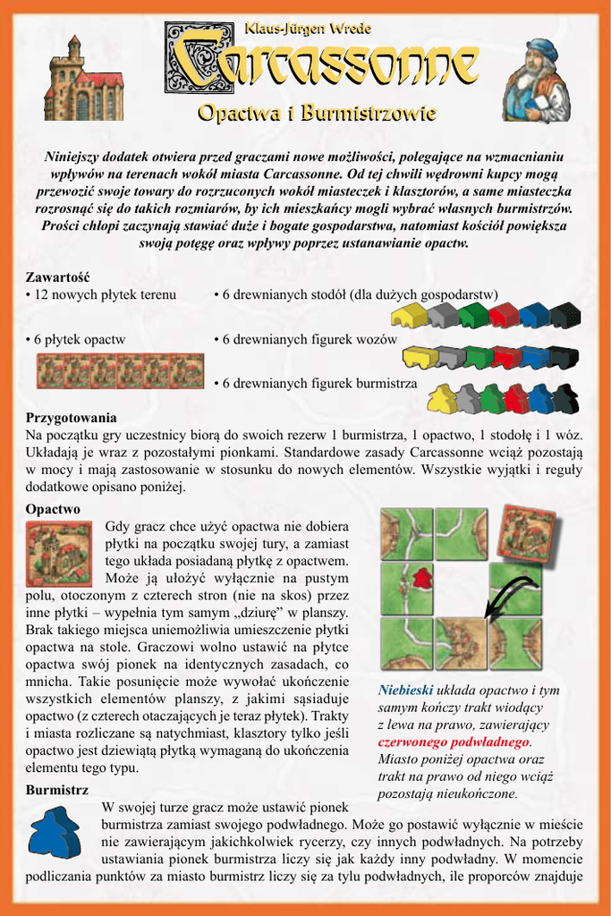 Klaus-Jürgen Wrede Opactwa i Burmistrzowie Niniejszy dodatek otwiera przed graczami nowe możliwości, polegające na wzmacnianiu wpływów na terenach wokół miasta Carcassonne. Od tej chwili wędrowni kupcy mogą przewozić swoje towary do rozrzuconych wokół miasteczek i klasztorów, a same miasteczka rozrosnąć się do takich rozmiarów, by ich mieszkańcy mogli wybrać własnych burmistrzów. Prości chłopi zaczynają stawiać duże i bogate gospodarstwa, natomiast kościół powiększa swoją potęgę oraz wpływy poprzez ustanawianie opactw. Zawartość • 12 nowych płytek terenu • 6 drewnianych stodół (dla dużych gospodarstw) • 6 płytek opactw • 6 drewnianych figurek wozów • 6 drewnianych figurek burmistrza Przygotowania Na początku gry uczestnicy biorą do swoich rezerw 1 burmistrza, 1 opactwo, 1 stodołę i 1 wóz. Układają je wraz z pozostałymi pionkami. Standardowe zasady Carcassonne wciąż pozostają w mocy i mają zastosowanie w stosunku do nowych elementów. Wszystkie wyjątki i reguły dodatkowe opisano poniżej. Opactwo Gdy gracz chce użyć opactwa nie dobiera płytki na początku swojej tury, a zamiast tego układa posiadaną płytkę z opactwem. Może ją ułożyć wyłącznie na pustym polu, otoczonym z czterech stron (nie na skos) przez inne płytki – wypełnia tym samym „dziurę” w planszy. Brak takiego miejsca uniemożliwia umieszczenie płytki opactwa na stole. Graczowi wolno ustawić na płytce opactwa swój pionek na identycznych zasadach, co mnicha. Takie posunięcie może wywołać ukończenie wszystkich elementów planszy, z jakimi sąsiaduje opactwo (z czterech otaczających je teraz płytek). Trakty i miasta rozliczane są natychmiast, klasztory tylko jeśli opactwo jest dziewiątą płytką wymaganą do ukończenia elementu tego typu. Burmistrz Niebieski układa opactwo i tym samym kończy trakt wiodący z lewa na prawo, zawierający czerwonego podwładnego. Miasto poniżej opactwa oraz trakt na prawo od niego wciąż pozostają nieukończone. W swojej turze gracz może ustawić pionek burmistrza zamiast swojego podwładnego. Może go postawić wyłącznie w mieście nie zawierającym jakichkolwiek rycerzy, czy innych podwładnych. Na potrzeby ustawiania pionek burmistrza liczy się jak każdy inny podwładny. W momencie podliczania punktów za miasto burmistrz liczy się za tylu podwładnych, ile proporców znajduje się na obszarze tego miasta. Przykładowo, gdyby miasto zawierało 3 proporce, burmistrz miałby wartość 3 zwykłych podwładnych. Burmistrz w mieście pozbawionym proporców liczy się jak 0 podwładnych (jest bez wartości). Zwykły podwładny liczy się za 1. Duży podwładny z dodatku „Karczmy i Katedry” za 2. Wartość miasta nie zmienia się wyłącznie z powodu obecności w jego granicach burmistrza. Po obliczeniu Burmistrz ma siłę 3 podwładnych (za punktacji za dane miasto pionek burmistrza wraca do 3 proporce). Tym samym Niebieski właściciela na normalnych zasadach. zdobywa za miasto 18 punktów. Stodoła Ustawianie Kiedy gracz układa płytkę w taki sposób, że tworzy ona poczwórne połączenie płytek, a każda z nich w miejscu zejścia się krawędzi posiada segment pola, zamiast stawiać podwładnego może tam umieścić swoją stodołę. Pionek stodoły ustawia się dokładnie w miejscu zejścia się czterech płytek. Uczestnik ma prawo ułożyć stodołę nawet, jeśli na segmentach pól łączących się z miejscem jej ustawienia znajdują się już chłopi. Pozostaje ona w tym miejscu do końca gry. Tutaj nie można ustawić stodoły. Dwie niższe płytki w punkcie zejścia mają segmenty miasta wraz z segmentami pola. Stodołę wolno postawić jedynie w sytuacji, gdy w miejscu zejścia się czterech płytek znajdują się wyłącznie segmenty pola. Obliczanie punktacji po ustawieniu stodoły Po tym, jak uczestnik wprowadzi stodołę do gry, należy od razu podliczyć punkty za gospodarstwo, na które trafiła. Gracz z największą ilością chłopów na danym polu otrzymuje 3 punkty za każde skończone miasto, łączące się z gospodarstwem. Nie ma znaczenia, czy właściciel stodoły ma w gospodarstwie jakichkolwiek chłopów. Po zebraniu punktów za gospodarstwo wszyscy uczestnicy posiadający pionki podwładnych na rozliczonym polu zabierają je do swoich rezerw, natomiast pionek stodoły pozostaje na swoim miejscu. Jeśli gracie z dodatkiem „Kupcy i Budowniczowie” osoba posiadająca w gospodarstwie świnię otrzymuje 4 punkty za miasto (zamiast 3) w momencie podliczenia punktacji za to gospodarstwo. Potem bierze swoją świnię z powrotem do rezerw. Niebieski ustawia swoją stodołę. Żółty zdobywa 6 punktów za 2 ukończone miasta i bierze swojego chłopa do rezerw. Zdobywanie punktów za łączenie pól ze stodołami Gracz nie może ustawić podwładnego Ułożenie płytki na segmencie gospodarstwa wywołuje połączonym z punktem zejścia połączenie się płytek zawierającym stodołę. czerwonego W każdym gospodarstwie może chłopa z dużym być maksymalnie jedna stodoła. gospodarstwem, Dozwolone jest oczywiście należącym do połączenie dwóch gospodarstw, Niebieskiego z których każde zawiera stodołę. (właściciela Jeśli uczestnik ułoży płytkę łączącą stodoły). gospodarstwo bez stodoły z tym, Czerwony które ją zawiera, natychmiast należy otrzymuje obliczyć punktację za nowe, duże 2 punkty za gospodarstwo, a gracze posiadający ukończone w nim chłopów zabierają ich pionki miasta i zabiera swojego do rezerw. W takich okolicznościach uczestnik otrzymuje poddanego do rezerw. tylko 1 punkt za każde ukończone miasto (jeśli posiada świnię z „Kupców i Budowniczych” należą mu się 2 punkty od każdego ukończonego miasta). Zdobywanie punktów na zakończenie gry Na koniec gry osoba posiadająca stodołę w gospodarstwie zyskuje 4 punkty za każde ukończone miasto stykające się z tym gospodarstwem. Nie ma znaczenia odległ