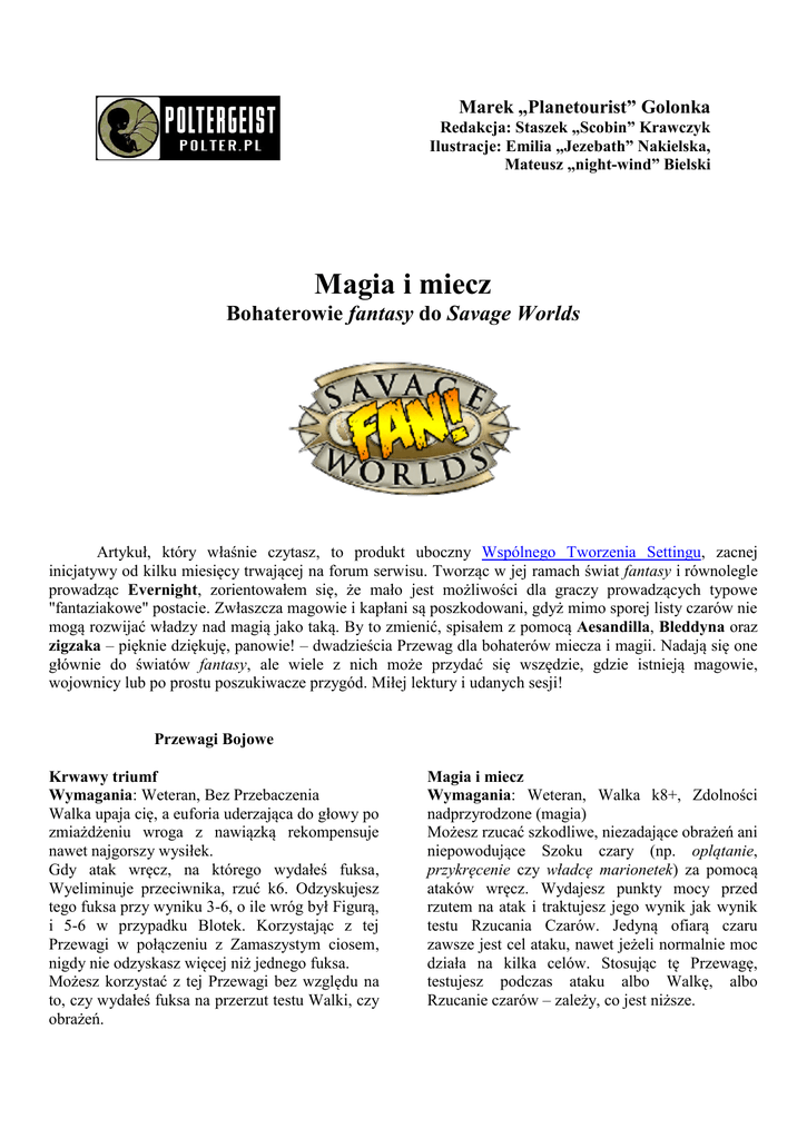 Marek „Planetourist” Golonka Redakcja: Staszek „Scobin” Krawczyk Ilustracje: Emilia „Jezebath” Nakielska, Mateusz „night-wind” Bielski Magia i miecz Bohaterowie fantasy do Savage Worlds Artykuł, który właśnie czytasz, to produkt uboczny Wspólnego Tworzenia Settingu, zacnej inicjatywy od kilku miesięcy trwającej na forum serwisu. Tworząc w jej ramach świat fantasy i równolegle prowadząc Evernight, zorientowałem się, że mało jest możliwości dla graczy prowadzących typowe "fantaziakowe" postacie. Zwłaszcza magowie i kapłani są poszkodowani, gdyż mimo sporej listy czarów nie mogą rozwijać władzy nad magią jako taką. By to zmienić, spisałem z pomocą Aesandilla, Bleddyna oraz zigzaka – pięknie dziękuję, panowie! – dwadzieścia Przewag dla bohaterów miecza i magii. Nadają się one głównie do światów fantasy, ale wiele z nich może przydać się wszędzie, gdzie istnieją magowie, wojownicy lub po prostu poszukiwacze przygód. Miłej lektury i udanych sesji! Przewagi Bojowe Krwawy triumf Wymagania: Weteran, Bez Przebaczenia Walka upaja cię, a euforia uderzająca do głowy po zmiażdżeniu wroga z nawiązką rekompensuje nawet najgorszy wysiłek. Gdy atak wręcz, na którego wydałeś fuksa, Wyeliminuje przeciwnika, rzuć k6. Odzyskujesz tego fuksa przy wyniku 3-6, o ile wróg był Figurą, i 5-6 w przypadku Blotek. Korzystając z tej Przewagi w połączeniu z Zamaszystym ciosem, nigdy nie odzyskasz więcej niż jednego fuksa. Możesz korzystać z tej Przewagi bez względu na to, czy wydałeś fuksa na przerzut testu Walki, czy obrażeń. Magia i miecz Wymagania: Weteran, Walka k8+, Zdolności nadprzyrodzone (magia) Możesz rzucać szkodliwe, niezadające obrażeń ani niepowodujące Szoku czary (np. oplątanie, przykręcenie czy władcę marionetek) za pomocą ataków wręcz. Wydajesz punkty mocy przed rzutem na atak i traktujesz jego wynik jak wynik testu Rzucania Czarów. Jedyną ofiarą czaru zawsze jest cel ataku, nawet jeżeli normalnie moc działa na kilka celów. Stosując tę Przewagę, testujesz podczas ataku albo Walkę, albo Rzucanie czarów – zależy, co jest niższe. Nieposkromiony szał Wymagania: Berseker, Weteran, Zaprawiony w walce W szale żaden ból cię nie powstrzyma. Gdy wpadasz w berserk, w Szoku wciąż możesz wykonywać wszystkie akcje. Wciąż jednak wystarczy zadać ci tyle obrażeń, ile masz Wytrzymałości, abyś otrzymał Ranę. Na początku każdej rundy decydujesz, czy chcesz działać, czy próbować wyjść z Szoku na normalnych zasadach. Przytłaczające natarcie Wymagania: Weteran, Si k10+ Gdy trafisz z przebiciem, korzystając z Desperackiego ataku (SWEPl, str. 64), możesz po rozliczeniu obrażeń spróbować za darmo Odepchnąć przeciwnika (Patch 2.0, str. 17). Nie możesz tego zrobić, jeżeli atakowałeś Zamaszystym Cięciem, a jeżeli chcesz Odpychać wroga po pierwszym ataku z Gradu Ciosów, drugi przepada. Ostatkiem sił Wymagania: Weteran, Werwa (Patch 2.0, str. 12) Na każdej sesji dostajesz dodatkowego, specjalnego fuksa, którego możesz wydać tylko, gdy nie masz już żadnych innych. Pozwala on przerzucić test z premią +4 (zastępującą +2 za Werwę). Nie ma sposobu, by odzyskać na sesji tego fuksa. Sprytny szermierz Wymagania: Walka k8+, Zręczność, Spryt lub Wyśmiewanie k8+ Zwody i szyderstwa są dla ciebie równie ważne w walce, jak cięcia i parady. Gdy w tej samej rundzie najpierw skutecznie użyjesz na wrogu Wyśmiewania bądź sztuczki opartej na Sprycie albo Zręczności, a potem zaatakujesz go wręcz, ten drugi atak nie będzie obarczony karą -2 za wiele akcji. Jezebath night-wind Pojedynkowicz Wymagania: Walka k10+ Świetnie sobie radzisz w walce jeden na jednego. Gdy walczysz z jednym przeciwnikiem i nikt inny go nie atakuje, otrzymujesz premię +1 do testów Walki, Obrony, Sztuczek i Prób Woli oraz obrony przed atakami wykorzystującymi te testy – względem tego jednego wroga. Te premie znikają do końca twojej najbliższej rundy, gdy ktoś inny trafi cię lub okpi Sztuczką albo Próbą Woli. Tabuny tałatajstwa Wymagania: Doświadczony, Figura, Znienawidzony Wróg (orki, gobliny lub inne dzikie, "stadne" humanoidy) Poszukiwacze przygód często stają naprzeciw całym plemionom gnolli, koboldów, zgrzytników czy innego tałatajstwa – i wygrywają! Jak to możliwe? Lata praktyki. Gdy wrogowie mają względem ciebie przewagę liczebną, otrzymujesz premię do testów Walki, wyjścia z Szoku i Wyparowania równą połowie ich premii za liczebność (zaokrąglając w górę). Przewagi Nadprzyrodzone Arcykapłan Wymagania: Heros, Wiara k12+, Zdolności nadprzyrodzone (cuda) Jesteś potężnym sługą swego boga, obrońcą wiernych i szafarzem łask. Możesz rzucać dwa dobroczynne zaklęcia (leczenie, grom, odbicie itp.) naraz. Wydajesz tyle punktów mocy, ile oba kosztują razem, i wykonujesz jeden test Wiary – wszystko w jednej akcji. Jeżeli masz premię do rzucania jednego z wybranych czarów (np. Przewagę Uzdrowiciel), po rzucie dodaj ją do wyniku na potrzeby tego jednego czaru. Świeckie objawienie Powyższa Przewaga nadaje się tylko dla cudotwórców. Jeżeli chcesz, by Twoja świecka postać przeżyła objawienie, zaproponuj MG następujący sposób: przy najbliższym rozwinięciu wykupisz Zdolności Nadprzyrodzone (cuda). Od razu otrzymasz też k6 Wiary, co – o ile nie masz Ducha k4 – będzie odpowiadało jednej poważnej i jednej drobnej Zawadzie. Te wybierasz tak samo, jak cudotwórcy. Ponieważ, mimo Zawad, takie objawienie oznacza znaczne wzmocnienie postaci, powinieneś zdobyć także zgodę pozostałych graczy. Arcymag Wymagania: Heros, Rzucanie czarów k12+, Wiedza (tajemna) k10+, Czarodziej Poznałeś najgłębsze sekrety magii, jesteś jednym z najmożniejszych czarodziei świata. Możesz rzucać dwa czary w rundzie. Każdy z nich liczy się jako osobna akcja. Elastyczna magia Wymagania: Weteran, Rzucanie czarów k10+, Wiedza (ta