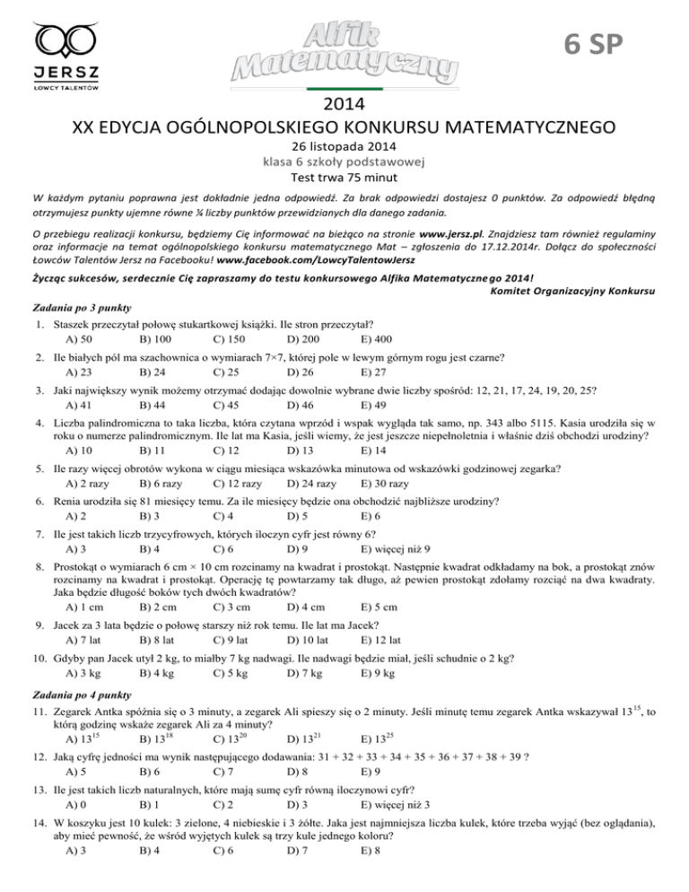 6 SP 2014 XX EDYCJA OGÓLNOPOLSKIEGO KONKURSU MATEMATYCZNEGO 26 listopada 2014 klasa 6 szkoły podstawowej Test trwa 75 minut W każdym pytaniu poprawna jest dokładnie jedna odpowiedź. Za brak odpowiedzi dostajesz 0 punktów. Za odpowiedź błędną otrzymujesz punkty ujemne równe ¼ liczby punktów przewidzianych dla danego zadania. O przebiegu realizacji konkursu, będziemy Cię informować na bieżąco na stronie www.jersz.pl. Znajdziesz tam również regulaminy oraz informacje na temat ogólnopolskiego konkursu matematycznego Mat – zgłoszenia do 17.12.2014r. Dołącz do społeczności Łowców Talentów Jersz na Facebooku! www.facebook.com/LowcyTalentowJersz Życząc sukcesów, serdecznie Cię zapraszamy do testu konkursowego Alfika Matematyczne go 2014! Komitet Organizacyjny Konkursu Zadania po 3 punkty 1. Staszek przeczytał połowę stukartkowej książki. Ile stron przeczytał? A) 50 B) 100 C) 150 D) 200 E) 400 2. Ile białych pól ma szachownica o wymiarach 7×7, której pole w lewym górnym rogu jest czarne? A) 23 B) 24 C) 25 D) 26 E) 27 3. Jaki największy wynik możemy otrzymać dodając dowolnie wybrane dwie liczby spośród: 12, 21, 17, 24, 19, 20, 25? A) 41 B) 44 C) 45 D) 46 E) 49 4. Liczba palindromiczna to taka liczba, która czytana wprzód i wspak wygląda tak samo, np. 343 albo 5115. Kasia urodziła się w roku o numerze palindromicznym. Ile lat ma Kasia, jeśli wiemy, że jest jeszcze niepełnoletnia i właśnie dziś obchodzi urodziny? A) 10 B) 11 C) 12 D) 13 E) 14 5. Ile razy więcej obrotów wykona w ciągu miesiąca wskazówka minutowa od wskazówki godzinowej zegarka? A) 2 razy B) 6 razy C) 12 razy D) 24 razy E) 30 razy 6. Renia urodziła się 81 miesięcy temu. Za ile miesięcy będzie ona obchodzić najbliższe urodziny? A) 2 B) 3 C) 4 D) 5 E) 6 7. Ile jest takich liczb trzycyfrowych, których iloczyn cyfr jest równy 6? A) 3 B) 4 C) 6 D) 9 E) więcej niż 9 8. Prostokąt o wymiarach 6 cm × 10 cm rozcinamy na kwadrat i prostokąt. Następnie kwadrat odkładamy na bok, a prostokąt znów rozcinamy na kwadrat i prostokąt. Operację tę powtarzamy tak długo, aż pewien prostokąt zdołamy rozciąć na dwa kwadraty. Jaka będzie długość boków tych dwóch kwadratów? A) 1 cm B) 2 cm C) 3 cm D) 4 cm E) 5 cm 9. Jacek za 3 lata będzie o połowę starszy niż rok temu. Ile lat ma Jacek? A) 7 lat B) 8 lat C) 9 lat D) 10 lat E) 12 lat 10. Gdyby pan Jacek utył 2 kg, to miałby 7 kg nadwagi. Ile nadwagi będzie miał, jeśli schudnie o 2 kg? A) 3 kg B) 4 kg C) 5 kg D) 7 kg E) 9 kg Zadania po 4 punkty 11. Zegarek Antka spóźnia się o 3 minuty, a zegarek Ali spieszy się o 2 minuty. Jeśli minutę temu zegarek Antka wskazywał 13 15, to którą godzinę wskaże zegarek Ali za 4 minuty? A) 1315 B) 1318 C) 1320 D) 1321 E) 1325 12. Jaką cyfrę jedności ma wynik następującego dodawania: 31 + 32 + 33 + 34 + 35 + 36 + 37 + 38 + 39 ? A) 5 B) 6 C) 7 D) 8 E) 9 13. Ile jest takich liczb naturalnych, które mają sumę cyfr równą iloczynowi cyfr? A) 0 B) 1 C) 2 D) 3 E) więcej niż 3 14. W koszyku jest 10 kulek: 3 zielone, 4 niebieskie i 3 żółte. Jaka jest najmniejsza liczba kulek, które trzeba wyjąć (bez oglądania), aby mieć pewność, że wśród wyjętych kulek są trzy kule jednego koloru? A) 3 B) 4 C) 6 D) 7 E) 8 15. Półtoralitrowa butelka zawiera trochę wody. Jacek wypił połowę zawartości butelki, po czym uzupełnił butelkę do pełna, dolewając litr wody. Ile wody było na początku w butelce? A) 500 ml B) 600 ml C) 800 ml D) 1 litr E) więcej niż 1 litr 16. Ile jest takich pól na szachownicy o wymiarach 8×8, które sąsiadują (tj. mają wspólny bok) z mniej niż czterema innymi polami? A) 28 B) 24 C) 32 D) 36 E) inny wynik 17. Pewną liczbę kulek chcemy rozłożyć w 3 pudełkach tak, by w każdym pudełku była inna liczba kulek i by w każdym z tych pudełek była mniej niż połowa wszystkich kulek. Jaka jest najmniejsza liczba kulek, dla której możemy to zrobić? A) 6 B) 7 C) 8 D) 9 E) 10 18. Ściany pewnej sześciennej kostki do gry ponumerowane są liczbami 1, 2, 4, 6, 8, 9 (każda ściana inną liczbą). Wiemy, że suma liczb na ścianach sąsiadujących ze ścianą numer 2 wynosi 19, a suma liczb na ścianach sąsiadujących ze ścianą numer 4 wynosi 20. Jaki numer ma ściana leżąca naprzeciwko ściany numer 8? A) 1 B) 2 C) 4 D) 6 E) 9 19. W pewnej klasie jest trzy razy mniej dziewcząt niż chłopców i o 12 więcej chłopców niż dziewcząt. Ilu uczniów liczy ta klasa? A) 18 B) 24 C) 28 D) 32 E) 36 20. W którym dniu wypada środek roku, który nie jest przestępny? A) 30 czerwca B) 1 lipca C) 2 lipca D) 3 lipca E) 4 lipca Zadania po 5 punktów 21. Bartek zaczął rozwiązywać zadanie domowe, gdy do północy było jeszcze dwa razy tyle czasu, ile upłynęło od południa, a skończył rozwiązywać zadanie, gdy do północy została połowa czasu, który upłynął od południa. Ile godzin Bartek rozwiązywał zadanie domowe? A) 3 B) 4 C) 5 D) 6 E) 8 22. Prostokąt o wymiarach 16 cm × 9 cm rozcięto na kilka części, z których ułożono (wykorzystując wszystkie części) kwadrat. Jaka jest długość boku tego kwadratu? A) 10 cm B) 11 cm C) 12 cm D) 13 cm E) 14 cm 23. Pewna dwucyfrowa liczba ma tę własność, że jeśli między jej cyfrę dziesiątek a cyfrę jedności wpiszemy 0, to liczba ta zwiększy się dokładnie 6 razy. Jaka jest cyfra dziesiątek tej liczby? A) 1 B) 2 C) 3 D) 4 E) 5 24. W torebce są cukierki w trzech smakach: truskawkowym, cytrynowym i pomarańczowym. Wiemy, że w torebce jest łącznie 11 cukierków truskawkowych i cytrynowych, jest łącznie 17 cukierków cytrynowych i pomarańczowych, natomiast pomarańczowych i truskawkowych jest łącznie 14 cukierków. Ile jest wszystkich cukierków w tej torebce? A) 24 B) 18 C) 42 D) 21 E) inny wynik 25. Kwadrat rozcięto na dwa prostokąty, których obwody mają długości 18 cm i 24 cm. Jaką długość ma bok tego kwadratu? A) 4 cm B) 5 cm