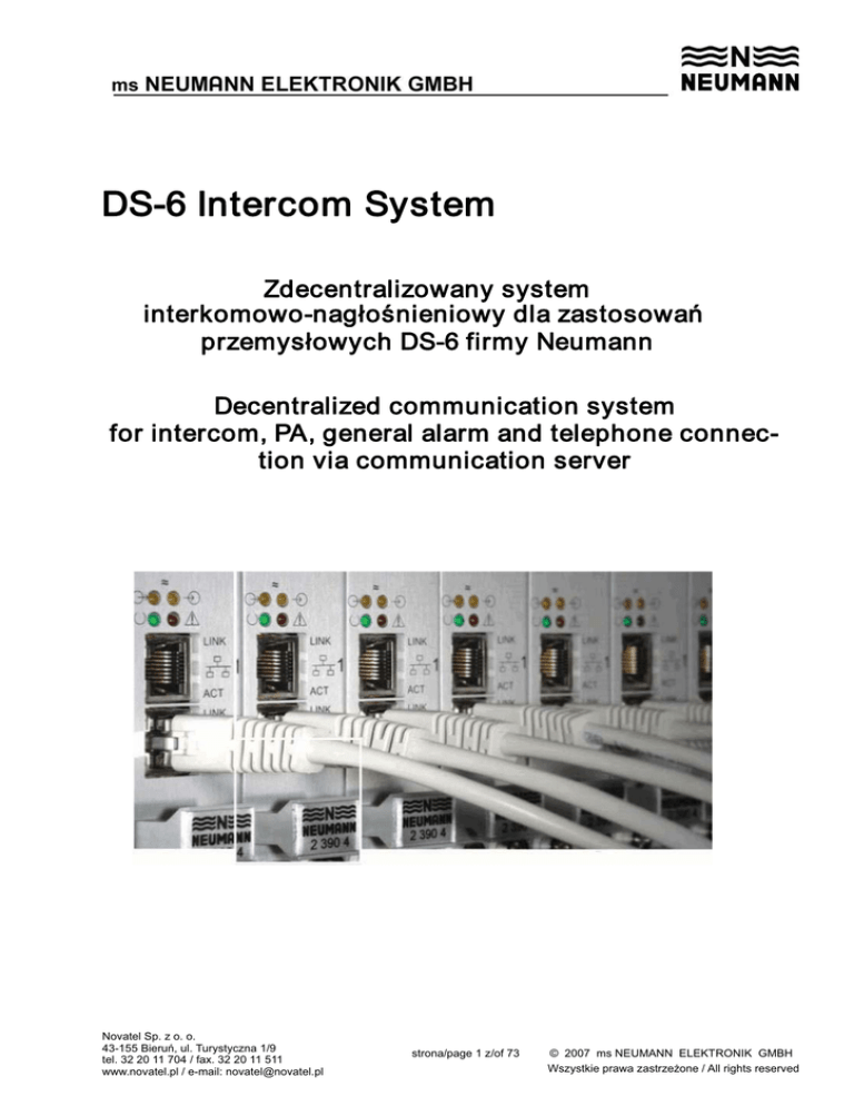DS-6 Intercom System Zdecentralizowany system interkomowo-nagłośnieniowy dla zastosowań przemysłowych DS-6 firmy Neumann Decentralized communication system for intercom, PA, general alarm and telephone connection via communication server Novatel Sp. z o. o. 43-155 Bieruń, ul. Turystyczna 1/9 tel. 32 20 11 704 / fax. 32 20 11 511 www.novatel.pl / e-mail: [email protected] strona/page 1 z/of 73 © 2007 ms NEUMANN ELEKTRONIK GMBH Wszystkie prawa zastrzeżone / All rights reserved Spis zawartości / Contents Firma ms NEUMANN ELEKTRONIK GmbH The Company ms NEUMANN ELEKTRONIK GmbH.................................................................................... 5 System interkomowy ms NEUMANN DS-6 The ms NEUMANN DS-6 Intercom System .................................................................................................. 7 Cechy systemu System advantages .................................................................................................................. 9 Bezpieczeństwo systemu System safety............................................................................................................................ 9 Skuteczność systemu System efficiency.................................................................................................................... 10 Wydajność sieci Network capacity..................................................................................................................... 10 Składniki systemu System components ............................................................................................................... 10 Innowacyjna technologia interkomowa Innovative intercom technology .............................................................................................. 11 Budowa systemu System Design Intercom/PA ................................................................................................... 13 System DS-6 z redundancją DS-6 Intercom System with redundant BUS System.............................................................. 14 Novatel Sp. z o. o. 43-155 Bieruń, ul. Turystyczna 1/9 tel. 32 20 11 704 / fax. 32 20 11 511 www.novatel.pl / e-mail: [email protected] strona/page 2 z/of 73 © 2007 ms NEUMANN ELEKTRONIK GMBH Wszystkie prawa zastrzeżone / All rights reserved Podstawowe funkcje użytkowe systemu DS-6 Basic Functions and Operation DS-6 .......................................................................................................... 15 Funkcje komunikacyjne DS-6 DS-6 Communication functions................................................................................................................... 16 Rozmowy indywidualne Individual calls......................................................................................................................... 16 Wywołania grupowe Group calls .............................................................................................................................. 17 Wywołania zbiorowe Collective calls ........................................................................................................................ 18 Funkcje alarmowe Alarm functions ....................................................................................................................... 19 Przykłady aplikacji Application examples................................................................................................................................... 20 Konfiguracja DS-6 Configuration DS-6 ...................................................................................................................................... 22 Architektura systemu z podłączeniem do serwera komunikacyjnego System design with connection to a communication server........................................................................ 31 Podstawowe funkcje stacji interkomowych, telefonów i serwerów komunikacyjnych Basic functions call stations / telephone / communication server ............................................................... 32 Użytkownik DS-6 inicjuje rozmowę z użytkownikiem telefonicznym DS-6 user initiates a conversation with a telephone user.......................................................32 Użytkownik telefoniczny inicjuje rozmowę z użytkownikiem DS-6 Telephone user initiates a conversation with DS-6 user ........................................................34 Połączenie telefoniczne do obwodu nagłośnieniowego (LC) Telephone user connects to a DS-6 loudspeaker circuit (LC) ................................................ 35 Przechowywanie wiadomości od użytkownika DS-6 Store a message from DS-6 user ........................................................................................... 36 Odtwarzanie przechowywanych wiadomości Telephone retrieves stored message .....................................................................................36 Wymuszone rozłączenie telefoniczne Forced telephone disconnection............................................................................................. 37 Konfiguracja systemu System configuration .............................................................................................................. 37 Konfiguracja – Serwer komunikacyjny Configuration Communication Server .........................................................................................................38 Novatel Sp. z o. o. 43-155 Bieruń, ul. Turystyczna 1/9 tel. 32 20 11 704 / fax. 32 20 11 511 www.novatel.pl / e-mail: [email protected] strona/page 3 z/of 73 © 2007 ms NEUMANN ELEKTRONIK GMBH Wszystkie prawa zastrzeżone / All rights reserved Serwer komunikacyjny DS-6 F14 DS-6 Communication Server F14 ............................................................................................................... 40 Karta interfejsu U DS-6 U-Call station adapter.........................................................................................