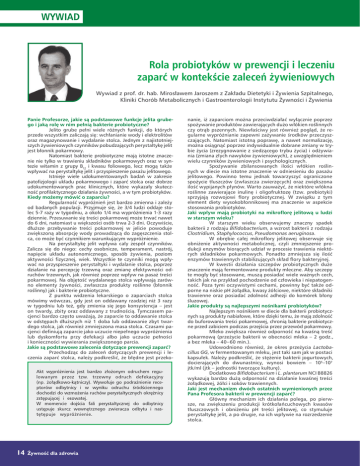 Rola probiotyków w prewencji i leczeniu zaparć w kontekście zaleceń żywieniowych Wywiad z prof. dr. hab. Mirosławem Jaroszem z Zakładu Dietetyki i Żywienia Szpitalnego, Kliniki Chorób Metabolicznych i Gastroenterologii Instytutu Żywności i Żywienia Panie Profesorze, jakie są podstawowe funkcje jelita grubego i jaką rolę w nim pełnią bakterie probiotyczne? Jelito grube pełni wiele różnych funkcji, do których przede wszystkim zaliczają się: wchłanianie wody i elektrolitów oraz magazynowanie i wydalanie stolca. Jednym z najistotniejszych żywieniowych czynników pobudzających perystaltykę jelit jest błonnik pokarmowy. Natomiast bakterie probiotyczne mają istotne znaczenie nie tylko w trawieniu składników pokarmowych oraz w syntezie witamin z grupy B12 i kwasu foliowego, lecz mogą także wpływać na perystaltykę jelit i przyspieszenie pasażu jelitowego. Istnieje wiele udokumentowanych badań w zakresie patofizjologii układu pokarmowego i zaparć stolca oraz dobrze udokumentowanych prac klinicznych, które wykazały skuteczność profilaktycznego działania żywności, a w tym probiotyków. Kiedy możemy mówić o zaparciu? Regularność wypróżnień jest bardzo zmienna i zależy od badanych populacji. Przyjmuje się, że 3/4 ludzi oddaje stolec 5-7 razy w tygodniu, a około 1/4 ma wypróżnienia 1-3 razy dziennie. Przesuwanie się treści pokarmowej może trwać nawet do 6 dni, natomiast u większości osób trwa 2-3 dni. Oczywiście, dłuższe przebywanie treści pokarmowej w jelicie powoduje zwiększoną absorpcję wody prowadzącą do zagęszczenia stolca, co może być czynnikiem warunkującym wypróżnienie. Na perystaltykę jelit wpływa cały zespół czynników. Zalicza się do niego: cechy osobnicze, temperament, nastrój, napięcie układu autonomicznego, sposób żywienia, poziom aktywności fizycznej, wiek. Wszystkie te czynniki mogą wpływać na przyspieszenie perystaltyki i wydalanie stolca, poprzez działanie na percepcję trzewną oraz zmianę efektywności odruchów trzewnych, jak również poprzez wpływ na pasaż treści pokarmowej. Na objętość wydalanego stolca wpływają zarówno elementy żywności, zwłaszcza produkty roślinne (błonnik roślinny) jak i bakterie probiotyczne. Z punktu widzenia lekarskiego o zaparciach stolca mówimy wówczas, gdy jest on oddawany rzadziej niż 3 razy w tygodniu lub też, gdy zmienia się jego konsystencja – jest on twardy, zbity oraz oddawany z trudnością. Tymczasem pacjenci bardzo często uważają, że zaparcie to oddawanie stolca w odstępach dłuższych niż 1 doba lub oddawanie zbyt twardego stolca, jak również zmniejszona masa stolca. Czasami pacjenci definiują zaparcie jako uczucie niepełnego wypróżnienia lub dyskomfortu przy defekacji albo jako uczucie pełności i konieczności wywierania zwiększonego parcia. Jakie są podstawowe zalecenia dotyczące prewencji zaparć? Przechodząc do zaleceń dotyczących prewencji i leczenia zaparć stolca, należy podkreślić, że błędne jest przeko- 14 Żywność dla zdrowia nanie, iż zaparciom można przeciwdziałać wyłącznie poprzez spożywanie produktów zawierających dużo włókien roślinnych czy otrąb pszennych. Niewłaściwy jest również pogląd, że regularne wypróżnianie zapewni zażywanie środków przeczyszczających. Natomiast istotną poprawę, a nawet normalizację, można osiągnąć poprzez indywidualnie dobrane zmiany w trybie życia (zrezygnowanie z siedzącego trybu życia) i odżywiania (zmiana złych nawyków żywieniowych), z uwzględnieniem wielu czynników żywieniowych i psychologicznych. Spożywanie zbilansowanych ilości włókien roślinnych w diecie ma istotne znaczenie w odniesieniu do pasażu jelitowego. Powinno temu jednak towarzyszyć ograniczone spożycie tłuszczów (zwłaszcza zwierzęcych) oraz zwiększona ilość wypijanych płynów. Warto zauważyć, że niektóre włókna roślinne zawierające inulinę i oligofruktozę (tzw. prebiotyki) sprzyjają rozwojowi flory probiotycznej. W związku z tym element diety wysokobłonnikowej ma znaczenie w aspekcie stosowania probiotyków. Jaki wpływ mają probiotyki na mikroflorę jelitową u ludzi w starszym wieku? W starszym wieku obserwujemy znaczny spadek bakterii z rodzaju Bifidobacterium, a wzrost bakterii z rodzaju Clostridium, Staphylococcus, Pseudomonas aeruginosa. W obrębie całej mikroflory jelitowej obserwuje się obniżenie aktywności metabolicznej, czyli zmniejszenie produkcji enzymów biorących udział w procesie trawienia niektórych składników pokarmowych. Ponadto zmniejsza się ilość enzymów trawiennych stabilizujących skład flory bakteryjnej. W kwestii działania szczepów probiotycznych duże znaczenie mają fermentowane produkty mleczne. Aby szczepy te mogły być stosowane, muszą posiadać wiele ważnych cech, takich jak na przykład pochodzenie od człowieka i niepatogenność. Poza tymi oczywistymi cechami, powinny być także odporne na niskie pH żołądka, kwasy żółciowe, niektóre składniki trawienne oraz posiadać zdolność adhezji do komórek błony śluzowej. Jakie produkty są najlepszymi nośnikami probiotyków? Najlepszym nośnikiem w diecie dla bakterii probiotycznych są produkty nabiałowe, które dzięki temu, że mają zdolność do buforowania treści pokarmowej, chronią bakterie probiotyczne przed zabiciem podczas przejścia przez przewód pokarmowy. Mleko zwiększa również odporność na kwaśną treść pokarmową (przeżycie bakterii w obecności mleka – 2 godz., a bez mleka – 40–60 min.). Udowodniono również, że okres przeżycia Lactobacillus GG, w fermentowanym mleku, jest taki sam jak w postaci kapsułek. Należy podkreślić, że stężenie bakterii jogurtowych, docierających do dwunastnicy, wynosi bowiem – 105 –107 jtk/ml (jtk – jednostki tworzące kulturę). Dodatkowo Bifidobacterium i L. plantarum NCI B8826 wykazują bardzo dużą odporność na działanie kwaś
