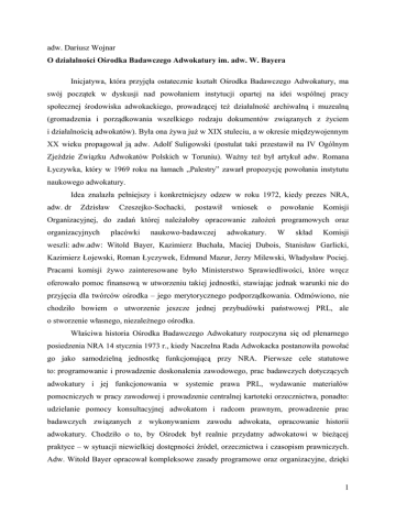 adw. Dariusz Wojnar O działalności Ośrodka Badawczego Adwokatury im. adw. W. Bayera Inicjatywa, która przyjęła ostatecznie kształt Ośrodka Badawczego Adwokatury, ma swój początek w dyskusji nad powołaniem instytucji opartej na idei wspólnej pracy społecznej środowiska adwokackiego, prowadzącej też działalność archiwalną i muzealną (gromadzenia i porządkowania wszelkiego rodzaju dokumentów związanych z życiem i działalnością adwokatów). Była ona żywa już w XIX stuleciu, a w okresie międzywojennym XX wieku propagował ją adw. Adolf Suligowski (postulat taki przestawił na IV Ogólnym Zjeździe Związku Adwokatów Polskich w Toruniu). Ważny też był artykuł adw. Romana Łyczywka, który w 1969 roku na łamach „Palestry” zawarł propozycję powołania instytutu naukowego adwokatury. Idea znalazła pełniejszy i konkretniejszy odzew w roku 1972, kiedy prezes NRA, adw. dr Zdzisław Czeszejko-Sochacki, postawił wniosek o powołanie Komisji Organizacyjnej, do zadań której należałoby opracowanie założeń programowych oraz organizacyjnych placówki naukowo-badawczej adwokatury. W skład Komisji weszli: adw.adw: Witold Bayer, Kazimierz Buchała, Maciej Dubois, Stanisław Garlicki, Kazimierz Łojewski, Roman Łyczywek, Edmund Mazur, Jerzy Milewski, Władysław Pociej. Pracami komisji żywo zainteresowane było Ministerstwo Sprawiedliwości, które wręcz oferowało pomoc finansową w utworzeniu takiej jednostki, stawiając jednak warunki nie do przyjęcia dla twórców ośrodka – jego merytorycznego podporządkowania. Odmówiono, nie chodziło bowiem o utworzenie jeszcze jednej przybudówki państwowej PRL, ale o stworzenie własnego, niezależnego ośrodka. Właściwa historia Ośrodka Badawczego Adwokatury rozpoczyna się od plenarnego posiedzenia NRA 14 stycznia 1973 r., kiedy Naczelna Rada Adwokacka postanowiła powołać go jako samodzielną jednostkę funkcjonującą przy NRA. Pierwsze cele statutowe to: programowanie i prowadzenie doskonalenia zawodowego, prac badawczych dotyczących adwokatury i jej funkcjonowania w systemie prawa PRL, wydawanie materiałów pomocniczych w pracy zawodowej i prowadzenie centralnej kartoteki orzecznictwa, ponadto: udzielanie pomocy konsultacyjnej adwokatom i radcom prawnym, prowadzenie prac badawczych związanych z wykonywaniem zawodu adwokata, opracowanie historii adwokatury. Chodziło o to, by Ośrodek był realnie przydatny adwokatowi w bieżącej praktyce – w sytuacji niewielkiej dostępności źródeł, orzecznictwa i czasopism prawniczych. Adw. Witold Bayer opracował kompleksowe zasady programowe oraz organizacyjne, dzięki 1 czemu istnienie placówki pod nazwą Ośrodek Badawczy Adwokatury przy Naczelnej Radzie Adwokackiej stało się faktem. Pouczająca jest treść artykułu Bayera Ośrodek Badawczy Adwokatury. Cele na dziś i jutro („Gazeta Sądowa” z sierpnia 1974). Okazuje się bowiem, że wskazywane w nim problemy są bardzo aktualne i obecnie. Później, w pierwszym sprawozdaniu z działalności OBA za lata 1973–75, adw. Bayer napisał na przykład w podpunkcie „postęp techniczny”: „Technika pracy adwokatów jest u nas skrajnie konserwatywna, zacofana i nie ma nic wspólnego z naukową organizacją pracy, ani z postępem technicznym”. Dziś, niemal 37 lat od powstania, nie zmieniły się cele i zadania Ośrodka, ale zmieniły się znacznie warunki społeczne, w jakich przyszło je realizować. Przez ostatnie dwie kadencje działalność Ośrodka Badawczego skoncentrowana była na kilku podstawowych dziedzinach: - prowadzeniu badań nad historią adwokatury (zakończono prace nad ostatnim tomem Słownika biograficznego adwokatów i rozpoczęto prace redakcyjne nad wydaniem całości dotychczasowych opracowań w jednym tomie oraz nad słownikiem biograficznym obejmującym biogramy adwokatów po 1945 roku); - gromadzeniu zbiorów Muzeum Adwokatury – unikatowego ośrodka w skali europejskiej – ma tu swojej nieocenione zasługi kustosz Muzeum, dr Andrzej Stoga; - pracach związanych z bieżącą działalnością biblioteki Ośrodka (powstał elektroniczny katalog wraz z wyszukiwarką, który umieszczono na stronie internetowej Ośrodka, dzięki czemu każdy z adwokatów z terenu całej Polski, poszukując materiałów w starych źródłach – czasopisma międzywojenne, archiwalne dzienniki ustaw – jest w stanie otrzymać kopie potrzebnych materiałów1; trwają prace nad zdefiniowaniem na nowo funkcji Biblioteki, także jako archiwum gromadzącego dokumentację organów samorządu i akt osobowych adwokatów. Na ostatnim Krajowym Zjeździe Adwokatury sformułowany został wniosek o powołanie Archiwum Adwokatury Polskiej, który podpisali min. adw. adw. Andrzej Michałowski p.o. Prezesa NRA; Stanisław Rymar (były Prezes NRA), Zenon Marciniak (wiceprezes NRA); Roman Nowosielski (członek ORA w Gdańsku), Dariusz Wojnar (członek NRA, Dyrektor OBA); Edward Rzeka (członek NRA), Marek Mikołajczyk (Dziekan ORA w Szczecinie), Jerzy Zięba (Dziekan ORA w Kielcach, Andrzej Wosiński (Sędzia Trybunału Stanu), Andrzej Tomaszek; Witold Majchrzak (b. Dziekan ORA w Zielonej 1 Katalog dostępny na stronie http://www.adwokatura.pl/oba_katalog.htm Zawiera opisy KSIĄŻEK i CZASOPISM znajdujących się w zbiorach Biblioteki Adwokatury. Informacje o poszukiwanej pozycji znajdziemy wpisując dane: w okienko: AUTOR – nazwisko autora lub autorów albo w okienko: TYTUŁ LUB SŁOWO Z TYTUŁU – tytuł pozycji. Jeśli poszukujemy wszystkich pozycji znajdujących się w bibliotece, a dotyczących np. adwokatury, wpisujemy – w okienko: TYTUŁ LUB SŁOWO Z TYTUŁU – rdzeń lub człon poszukiwanego słowa – (w tym przypadku wpisujemy „adwok”). 2 Górze) Jarosław Szymański (członek ORA w Łodzi), Marek Kopczyński (ORA w Łodzi). Autorzy w uzasadnieniu wniosku napisali, że zadaniem archiwum, którego zalążkiem jest istniejąca biblioteka OBA, winno być gromadzenie akt adwokatów po
