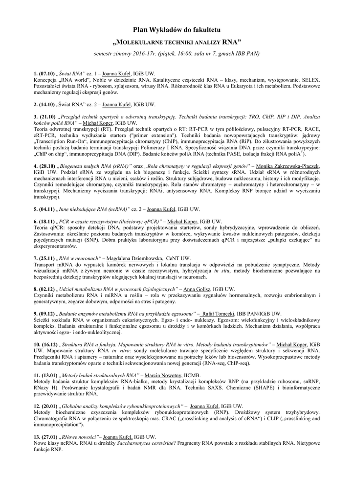 11. (13.01) „Metody badań strukturalnych RNA” – Marcin Nowotny, IICMB.