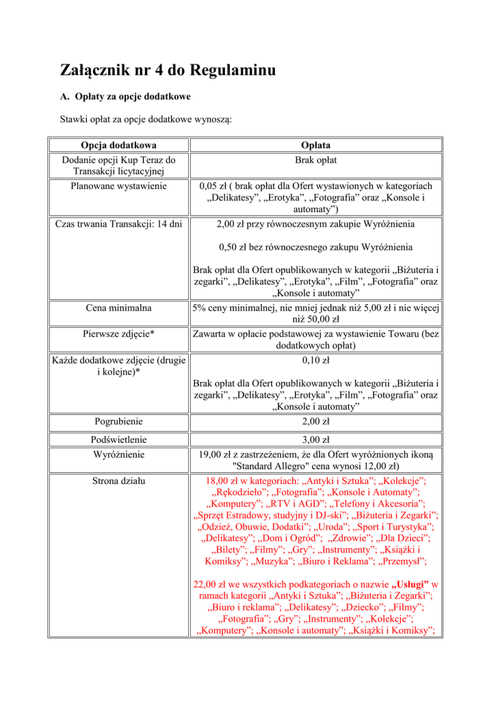 Załącznik nr 4 do Regulaminu A. Opłaty za opcje dodatkowe Stawki opłat za opcje dodatkowe wynoszą: Opcja dodatkowa Dodanie opcji Kup Teraz do Transakcji licytacyjnej Planowane wystawienie Czas trwania Transakcji: 14 dni Opłata Brak opłat 0,05 zł ( brak opłat dla Ofert wystawionych w kategoriach „Delikatesy”, „Erotyka”, „Fotografia” oraz „Konsole i automaty”) 2,00 zł przy równoczesnym zakupie Wyróżnienia 0,50 zł bez równoczesnego zakupu Wyróżnienia Brak opłat dla Ofert opublikowanych w kategorii „Biżuteria i zegarki”, „Delikatesy”, „Erotyka”, „Film”, „Fotografia” oraz „Konsole i automaty” Cena minimalna 5% ceny minimalnej, nie mniej jednak niż 5,00 zł i nie więcej niż 50,00 zł Pierwsze zdjęcie* Zawarta w opłacie podstawowej za wystawienie Towaru (bez dodatkowych opłat) Każde dodatkowe zdjęcie (drugie 0,10 zł i kolejne)* Brak opłat dla Ofert opublikowanych w kategorii „Biżuteria i zegarki”, „Delikatesy”, „Erotyka”, „Film”, „Fotografia” oraz „Konsole i automaty” Pogrubienie 2,00 zł Podświetlenie Wyróżnienie Strona działu 3,00 zł 19,00 zł z zastrzeżeniem, że dla Ofert wyróżnionych ikoną "Standard Allegro" cena wynosi 12,00 zł) 18,00 zł w kategoriach: „Antyki i Sztuka”; „Kolekcje”; „Rękodzieło”; „Fotografia”; „Konsole i Automaty”; „Komputery”; „RTV i AGD”; „Telefony i Akcesoria”; „Sprzęt Estradowy, studyjny i DJ-ski”; „Biżuteria i Zegarki”; „Odzież, Obuwie, Dodatki”; „Uroda”; „Sport i Turystyka”; „Delikatesy”; „Dom i Ogród”; „Zdrowie”; „Dla Dzieci”; „Bilety”; „Filmy”; „Gry”; „Instrumenty”; „Książki i Komiksy”; „Muzyka”; „Biuro i Reklama”; „Przemysł”; 22,00 zł we wszystkich podkategoriach o nazwie „Usługi” w ramach kategorii „Antyki i Sztuka”; „Biżuteria i Zegarki”; „Biuro i reklama”; „Delikatesy”; „Dziecko”; „Filmy”; „Fotografia”; „Gry”; „Instrumenty”; „Kolekcje”; „Komputery”; „Konsole i automaty”; „Książki i Komiksy”; „Motoryzacja”; „Muzyka”; „Odzież, Obuwie, Dodatki”; „Przemysł”; „RTV i AGD”; „Rękodzieło”; „Sport i Turystyka”; „Sprzęt estradowy, studyjny i DJ-ski”; „Telefony i Akcesoria”; „Uroda”; „Zdrowie”; „Dom i Ogród” (w podkategoriach: „Budownictwo i Akcesoria”; „Ogród”; „Utrzymanie czystości”; „Wyposażenie”; „Zwierzęta”) oraz w podkategoriach o nazwie „Meble na wymiar” w ramach kategorii „Dom i Ogród” w podkategorii „Meble” i „Kuchnia na zamówienie” w ramach kategorii „Dom i ogród > Meble > Kuchnia” 29,00 zł Pakiet Wyróżnienie + Pogrubienie + Podświetlenie 19,99 zł * dotyczy zdjęć wprowadzonych na serwer Allegro poprzez formularz sprzedaży; zamieszczanie zdjęć z zewnętrznych serwerów jest bezpłatne. B. Opcje dodatkowe dla kategorii „Motoryzacja” Stawki opłat za opcje dodatkowe wynoszą: Opcja dodatkowa Dodanie opcji Kup Teraz do Transakcji licytacyjnej Planowane wystawienie Czas trwania Transakcji: 14 dni Opłata Brak opłat 0,05 zł 2,00 zł przy równoczesnym zakupie Wyróżnienia w kategoriach : „Chemia”; „Części do innych pojazdów”; „Części motocyklowe”; „Części samochodowe”; „Akcesoria samochodowe”, „Literatura”; „Narzędzia i sprzęt warsztatowy”; „Części do maszyn”; „Opony” 0,50 zł bez równoczesnego zakupu Wyróżnienia w kategoriach : „Chemia”; „Części do innych pojazdów”; „Części motocyklowe”; „Części samochodowe”; „Akcesoria samochodowe”, „Literatura”; „Narzędzia i sprzęt warsztatowy”; „Części do maszyn”; „Opony” Cena minimalna Pierwsze zdjęcie* Każde dodatkowe zdjęcie (drugie i kolejne)* 4,00 w kategoriach: „Inne pojazdy i łodzie”; „Maszyny”; „Motocykle i quady”; „Przyczepy, naczepy”; „Samochody”; 5% ceny minimalnej, nie mniej jednak niż 5,00 zł i nie więcej niż 50,00 zł Zawarta w opłacie podstawowej za wystawienie Towaru (bez dodatkowych opłat) 0,10 zł Pogrubienie Podświetlenie Wyróżnienie Strona działu 2,00 zł dla kategorii : „Chemia”; „Części do innych pojazdów”; „Części motocyklowe”; „Części samochodowe”; „Akcesoria samochodowe”, „Literatura”; „Narzędzia i sprzęt warsztatowy”; „Części do maszyn”; „Opony” 4,00 zł dla kategorii: „Inne pojazdy i łodzie”; „Maszyny”; „Motocykle i quady”; „Przyczepy, naczepy”; „Samochody”; 3,00 zł dla kategorii: „Chemia”; „Części do innych pojazdów”; „Części motocyklowe”; „Części samochodowe”; „Akcesoria samochodowe”, „Literatura”; „Narzędzia i sprzęt warsztatowy”; „Części do maszyn”; „Opony” 6,00 zł w kategoriach: „Inne pojazdy i łodzie”; „Maszyny”; „Motocykle i quady”; „Przyczepy, naczepy”; „Samochody”; 19,00 zł w kategoriach: „Chemia”; „Części do innych pojazdów”; „Części motocyklowe”; „Części samochodowe”; „Akcesoria samochodowe”, „Literatura”; „Narzędzia i sprzęt warsztatowy”; „Części do maszyn”; „Opony” (dla Transakcji wyróżnionych ikoną "Standard Allegro" cena wynosi 12,00 zł) 29,00 zł w kategoriach: „Maszyny”; „Motocykle”; „Narzędzia i sprzęt warsztatowy”; „Przyczepy, naczepy”; „Inne pojazdy i łodzie”; „Samochody” 18,00 zł w kategoriach: „Chemia”; „Części do innych pojazdów”; „Części motocyklowe”; „Części samochodowe”; „Akcesoria samochodowe”, „Literatura”; „Narzędzia i sprzęt warsztatowy”; „Części do maszyn”; „Opony” 29,00 zł w kategoriach: „Chemia”; „Części do innych pojazdów”; „Części motocyklowe”; „Części samochodowe”; „Akcesoria samochodowe”, „Literatura”; „Narzędzia i sprzęt warsztatowy”; „Części do maszyn