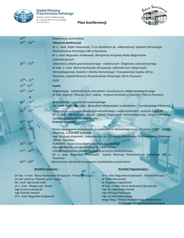 Plan konferencji 1000 1020 – 1030 1200 – 1245 Rejestracja uczestników Otwarcie konferencji dr n. med. Rafał Staszewski, Z-ca Dyrektora ds. Administracji Szpitala Klinicznego Przemienienia Pańskiego UM w Poznaniu dr n. med. Bogusław Grabowski, Wiceprezes Krajowej Rady Diagnostów Laboratoryjnych Zaburzenia układu granulocytarnego - vademecum Diagnosty Laboratoryjnego dr hab. n. med. Maria Kozłowska-Skrzypczak, Laboratorium Diagnostyki Hematologicznej, Katedra i Klinika Hematologii i Transplantacji Szpiku UM w Poznaniu, Szpital Kliniczny Przemienienia Pańskiego UM w Poznaniu QUIZ 1245 – 1320 Lunch 1320 – 1425 Diagnostyka molekularna w chorobach rozrostowych układu krwiotwórczego dr hab. Andrzej Pławski, prof. nadzw. Instytut Genetyki Człowieka PAN w Poznaniu 1425 – 1510 Krwinki białe – spojrzenie transfuzjologa lek. med. Agnieszka Łaba, Konsultant Wojewódzki w dziedzinie - Transfuzjologii Klinicznej 1510 - 1555 Diagnostyka schorzeń układu granulocytarnego z wykorzystaniem systemu EasyCell dr n. med. Małgorzata Rusak Zakład Diagnostyki Hematologicznej, Uniwersyteckiego Szpitala Klinicznego w Białymstoku Przerwa kawowa 1030 – 1200 1555 - 1605 1605 – 1650 1650 – 1735 1735 – 1820 1820 – 1830 Nowe rozwiązania metodyczne w analizatorze hematologicznym (Yumizen H500 - Horiba Medical), a praktyka kliniczna mgr Grażyna Kasprzak, Laboratorium nr 2 Szpitala Klinicznego Przemienienia Pańskiego UM w Poznaniu YUMIZEN - nowa linia diagnostyczna w hematologii Danuta Haertle, Horiba Medical Sp. z o.o. Polska Udział diagnostów laboratoryjnych w procesie leczenia krwią Dr n. med. Bogusław Grabowski Szpital Kliniczny Przemienienia Pańskiego UM w Poznaniu Zakończenie szkolenia i wręczenie certyfikatów uczestnikom Komitet naukowy : dr hab. n med. Maria Kozłowska-Skrzypczak - Przewodnicząca dr hab. Andrzej Pławski, prof. nadzw. lek. med. Agnieszka Łaba dr n. med. Małgorzata Rusak mgr Grażyna Kasprzak mgr Danuta Heartle dr n. med. Bogusław Grabowski Komitet Organizacyjny : dr n. med. Bogusław Grabowski - Przewodniczący dr Rafał Staszewski dr Zbigniew Łagodziński dr hab. n med. Maria Kozłowska-Skrzypczak mgr inż. Agnieszka Kubiak mgr Patrycja Rakowska mgr Karolina Moszyńska Kinga Eling – Prezes Poznańskiego Towarzystwa Studentów Medycyny Laboratoryjnej