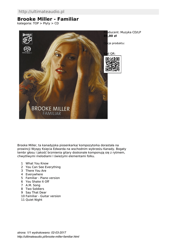 http://ultimateaudio.pl Brooke Miller - Familiar kategoria: TOP > Płyty > CD Producent: Muzyka CD/LP 89,00 zł Opcje produktu: Kod QR: Brooke Miller, ta kanadyjska piosenkarka/ kompozytorka dorastała na prowincji Wyspy Księcia Edwarda na wschodnim wybrzeżu Kanady. Bogaty tembr głosu i jakość brzmienia gitary doskonale komponują się z rytmem, chwytliwymi melodiami I świeżymi elementami folku. 1 2 3 4 5 6 7 8 9 10 11 What You Know You Can See Everything There You Are Everywhere Familiar - Piano version You Shake It Off A.M. Song Two Soldiers Say That Dear Familiar - Guitar version Quiet Night strona: 1/1 wydrukowano: 02-03-2017 http://ultimateaudio.pl/brooke-miller-familiar.html