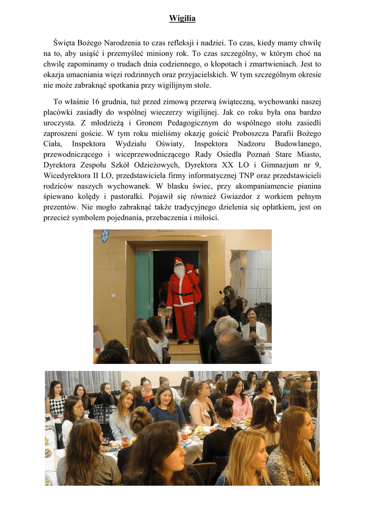 Wigilia Święta Bożego Narodzenia to czas refleksji i nadziei. To czas, kiedy mamy chwilę na to, aby usiąść i przemyśleć miniony rok. To czas szczególny, w którym choć na chwilę zapominamy o trudach dnia codziennego, o kłopotach i zmartwieniach. Jest to okazja umacniania więzi rodzinnych oraz przyjacielskich. W tym szczególnym okresie nie może zabraknąć spotkania przy wigilijnym stole. To właśnie 16 grudnia, tuż przed zimową przerwą świąteczną, wychowanki naszej placówki zasiadły do wspólnej wieczerzy wigilijnej. Jak co roku była ona bardzo uroczysta. Z młodzieżą i Gronem Pedagogicznym do wspólnego stołu zasiedli zaproszeni goście. W tym roku mieliśmy okazję gościć Proboszcza Parafii Bożego Ciała, Inspektora Wydziału Oświaty, Inspektora Nadzoru Budowlanego, przewodniczącego i wiceprzewodniczącego Rady Osiedla Poznań Stare Miasto, Dyrektora Zespołu Szkół Odzieżowych, Dyrektora XX LO i Gimnazjum nr 9, Wicedyrektora II LO, przedstawiciela firmy informatycznej TNP oraz przedstawicieli rodziców naszych wychowanek. W blasku świec, przy akompaniamencie pianina śpiewano kolędy i pastorałki. Pojawił się również Gwiazdor z workiem pełnym prezentów. Nie mogło zabraknąć także tradycyjnego dzielenia się opłatkiem, jest on przecież symbolem pojednania, przebaczenia i miłości.