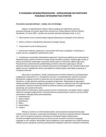 O OCENIANIU WEWNĄTRZSZKOLNYM – OPRACOWANIE NA PODSTAWIE PUBLIKACJI WYDAWNICTWA STENTOR O ocenianiu wewnątrzszkolnym – rodzaje, cele, terminologia. Jednym z fundamentalnych założeń reformy edukacji jest oddzielenie oceniania wewnątrzszkolnego od systemu egzaminów zewnętrznych. Rozporządzenie Ministra Edukacji Narodowej z 21 marca 2001 r. określa cele oceniania wewnątrzszkolnego (rozdz. 2. p.2.): À informowanie ucznia o poziomie jego osiągnięć edukacyjnych i postępach w tym zakresie; À pomoc uczniowi w samodzielnym planowaniu swojego rozwoju; À motywowanie ucznia do dalszej pracy; À dostarczanie rodzicom, opiekunom i nauczycielom informacji o postępach, trudnościach w uczeniu się oraz szczególnych uzdolnieniach ucznia; À umożliwianie nauczycielom doskonalenia organizacji i metod pracy dydaktyczno-wychowawczej. Wewnątrzszkolny system oceniania ma służyć przede wszystkim uczniowi i wspierać jego rozwój, w dalszej zaś kolejności wspomagać nauczyciela, dostarczając mu informacji o jakości jego pracy. Powszechnemu zainteresowaniu problematyką oceniania i docenieniu jego wagi w różnych obszarach edukacji towarzyszy dziś niemałe zamieszanie terminologiczne. Dla uściślenia dobrze więc będzie chociaż w największym skrócie uporządkować niektóre pojęcia, jakie będą się pojawiać w niniejszym materiale. Gdy mowa o sprawdzaniu, chodzi o porównywanie wyników kształcenia z przewidywanymi osiągnięciami (zapisanymi m.in. w programie nauczania i w przedmiotowym systemie oceniania). Sprawdzanie osiągnięć uczniów to upewnianie się, czy opanowali oni zaplanowane czynności, i określanie, na jakim poziomie spełniają wymagania programowe. Wprowadzenie tego pojęcia zakłada uprzednie istnienie wymagań programowych, a dopiero w odniesieniu do nich organizowanie sprawdzania i oceniania. Ocenianie szkolne to zarówno ustalanie oceny (zgodnie z przyjętą procedurą), jak i jej komunikowanie. Ocena szkolna to informacja o wyniku uczenia się wraz z komentarzem, zaś stopień szkolny –symbol spełnienia wymagań programowych. W proponowanym przedmiotowym systemie oceniania (PSO) zastosowano tradycyjną skalę sześciostopniową: 1 – niedostateczny, 2 – dopuszczający, 3 – dostateczny, 4 – dobry, 5 – bardzo dobry, 6 – celujący. Mówiąc o ocenianiu w zreformowanej szkole, warto przywołać przynajmniej dwa jego rodzaje: ocenianie sumujące i wspierające (kształtujące). W ocenianiu wewnątrzszkolnym występują oba – choć ich wzajemne proporcje zmieniają się na kolejnych etapach edukacyjnych. W szkole ponadgimnazjalnej kończącej się maturą wzrasta znaczenie oceniania sumującego, mającego na celu ustalenie, jaką wiedzę i jakie umiejętności uczeń opanował oraz na jakim poziomie. Odbywa się ono najczęściej za pomocą sprawdzianów badających spełnienie ustalonych standardów. Ten typ oceniania (odbywa się ono po upływie jakiegoś czasu nauki, np. na zakończenie semestru lub po omówieniu dłuższego działu materiału; jest także związane z systemem egzaminów zewnętrznych) umożliwia dokonywanie analiz ilościowych i jakościowych; spełnia funkcję informacyjną, a często selekcyjną. Ocenianie wzmacniające – zgodnie ze swą nazwą – ma stymulować rozwój ucznia. Dokonywane jest w sposób ciągły, za pomocą różnych technik i narzędzi, eksponuje znaczenie komentarza towarzyszącego ocenie. Należy do głównych sposobów oceniania stosowanych w szkole. Ma prawo uwzględniać także kontekstowe czynniki społeczno-wychowawcze, w tym indywidualne predyspozycje i możliwości ucznia. Podstawą oceniania stosowanego w szkole są jednak zawsze ustalone kryteria (mówiące, co będzie sprawdzane) i wymagania programowe (mówiące, w jakim stopniu uczeń opanował zaplanowaną wiedzę i umiejętności). Ich istnienie i respektowanie przez nauczyciela decyduje o poczuciu „sprawiedliwości” oceniania, a także o rzetelności informacji, jaką otrzymuje uczeń o wyniku swego uczenia się. Kryteria oceniania i wymagania programowe stanowią zasadniczą część niniejszego przedmiotowego systemu oceniania, przy czym należy pamiętać, iż – jak wszystkie tego rodzaju materiały – jest on tylko propozycją, którą każdy nauczyciel dostosuje do indywidualnych warunków swojej pracy. W ramach oceniania wewnątrzszkolnego nauczyciel przedmiotu formułuje wymagania edukacyjne, na które wpływ mają: program i jego założenia, potrzeby i możliwości klasy oraz – niejednokrotnie – uwarunkowania środowiskowe, a także standardy wymagań egzaminacyjnych. O ile nadrzędnym celem oceniania jest wspomaganie rozwoju ucznia w najszerszym rozumieniu tego słowa, wspieranie go w zdobywaniu wiedzy i umiejętności, osiąganiu dojrzałości intelektualnej, moralnej i emocjonalnej, o tyle w praktyce nie mniejsze znaczenie mają cele sformułowane instrumentalnie, jak np. zdanie egzaminu dojrzałości na odpowiednio wysokim poziomie. W związku z tym w przedmiotowym systemie oceniania wyraźnie muszą zostać podkreślone te elementy wiedzy, umiejętności i kompetencje ucznia , które badane są na maturze i określone w standardach wymagań egzaminacyjnych. Zaproponowany przedmiotowy system oceniania uwzględnia kilka założeń: 1. Ocena powinna określać poziom realizacji zadania pod względem ilościowym i jakościowym, a więc formułowana jest na podstawie wcześniej określonych wymagań mówiących: À co, À w jaki sposób À i w jakiej mierze powinien wykonać uczeń, by otrzymać określony stopień szkolny. 2. Podstawą formułowania oceny są dające się zaobserwować czynności ucznia, a więc wymagania muszą być ujęte w języku dydaktyki czynnościowej (z wykorzystaniem czasowników operacyjnych), przy czym polonista musi w znacznym stopniu uwzględniać zadania wieloczynnościowe, złożone, zgodne ze strategią holistyczną, bo one są bardziej adekwatne do zdobywanych przez ucznia