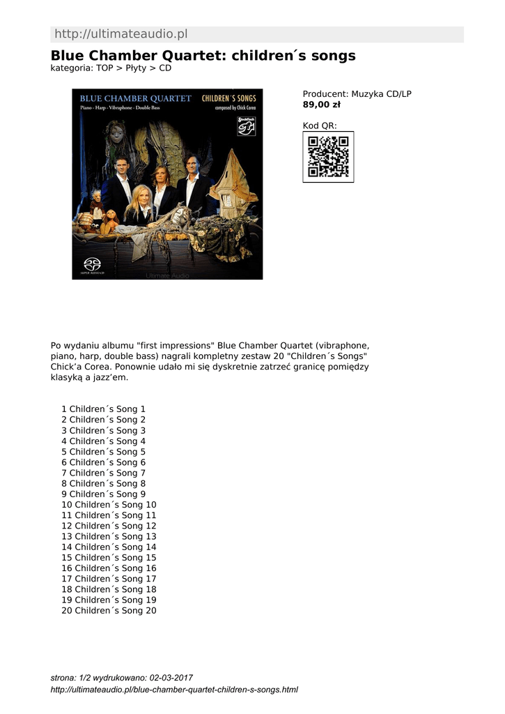 http://ultimateaudio.pl Blue Chamber Quartet: children ́s songs kategoria: TOP > Płyty > CD Producent: Muzyka CD/LP 89,00 zł Kod QR: Po wydaniu albumu "first impressions" Blue Chamber Quartet (vibraphone, piano, harp, double bass) nagrali kompletny zestaw 20 "Children´s Songs" Chick’a Corea. Ponownie udało mi się dyskretnie zatrzeć granicę pomiędzy klasyką a jazz’em. 1 Children´s Song 1 2 Children´s Song 2 3 Children´s Song 3 4 Children´s Song 4 5 Children´s Song 5 6 Children´s Song 6 7 Children´s Song 7 8 Children´s Song 8 9 Children´s Song 9 10 Children´s Song 10 11 Children´s Song 11 12 Children´s Song 12 13 Children´s Song 13 14 Children´s Song 14 15 Children´s Song 15 16 Children´s Song 16 17 Children´s Song 17 18 Children´s Song 18 19 Children´s Song 19 20 Children´s Song 20 strona: 1/2 wydrukowano: 02-03-2017 http://ultimateaudio.pl/blue-chamber-quartet-children-s-songs.html strona: 2/2 wydrukowano: 02-03-2017 http://ultimateaudio.pl/blue-chamber-quartet-children-s-songs.html