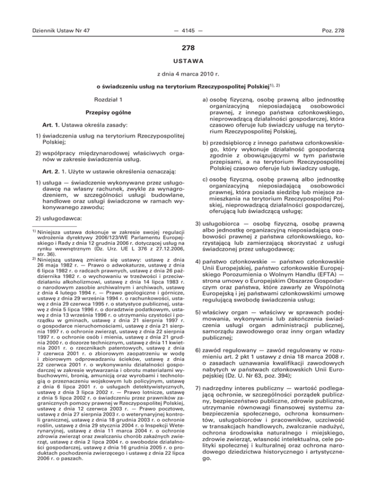 Dziennik Ustaw Nr 47 — 4145 — Poz. 278 278 USTA WA z dnia 4 marca 2010 r. o świadczeniu usług na terytorium Rzeczypospolitej Polskiej1), 2) Rozdział 1 Przepisy ogólne Art. 1. Ustawa określa zasady: 1) świadczenia usług na terytorium Rzeczypospolitej Polskiej; 2) współpracy międzynarodowej właściwych organów w zakresie świadczenia usług. Art. 2. 1. Użyte w ustawie określenia oznaczają: 1) usługa — świadczenie wykonywane przez usługodawcę na własny rachunek, zwykle za wynagrodzeniem, w szczególności usługi budowlane, handlowe oraz usługi świadczone w ramach wykonywanego zawodu; a) osobę fizyczną, osobę prawną albo jednostkę organizacyjną nieposiadającą osobowości prawnej, z innego państwa członkowskiego, nieprowadzącą działalności gospodarczej, która czasowo oferuje lub świadczy usługę na terytorium Rzeczypospolitej Polskiej, b) przedsiębiorcę z innego państwa członkowskiego, który wykonuje działalność gospodarczą zgodnie z obowiązującymi w tym państwie przepisami, a na terytorium Rzeczypospolitej Polskiej czasowo oferuje lub świadczy usługę, c) osobę fizyczną, osobę prawną albo jednostkę organizacyjną nieposiadającą osobowości prawnej, która posiada siedzibę lub miejsce zamieszkania na terytorium Rzeczypospolitej Polskiej, nieprowadzącą działalności gospodarczej, oferującą lub świadczącą usługę; 2) usługodawca: 1) Niniejsza ustawa dokonuje w zakresie swojej regulacji wdrożenia dyrektywy 2006/123/WE Parlamentu Europejskiego i Rady z dnia 12 grudnia 2006 r. dotyczącej usług na rynku wewnętrznym (Dz. Urz. UE L 376 z 27.12.2006, str. 36). 2) Niniejszą ustawą zmienia się ustawy: ustawę z dnia 26 maja 1982 r. — Prawo o adwokaturze, ustawę z dnia 6 lipca 1982 r. o radcach prawnych, ustawę z dnia 26 października 1982 r. o wychowaniu w trzeźwości i przeciwdziałaniu alkoholizmowi, ustawę z dnia 14 lipca 1983 r. o narodowym zasobie archiwalnym i archiwach, ustawę z dnia 4 lutego 1994 r. — Prawo geologiczne i górnicze, ustawę z dnia 29 września 1994 r. o rachunkowości, ustawę z dnia 29 czerwca 1995 r. o statystyce publicznej, ustawę z dnia 5 lipca 1996 r. o doradztwie podatkowym, ustawę z dnia 13 września 1996 r. o utrzymaniu czystości i porządku w gminach, ustawę z dnia 21 sierpnia 1997 r. o gospodarce nieruchomościami, ustawę z dnia 21 sierpnia 1997 r. o ochronie zwierząt, ustawę z dnia 22 sierpnia 1997 r. o ochronie osób i mienia, ustawę z dnia 21 grudnia 2000 r. o dozorze technicznym, ustawę z dnia 11 kwietnia 2001 r. o rzecznikach patentowych, ustawę z dnia 7 czerwca 2001 r. o zbiorowym zaopatrzeniu w wodę i zbiorowym odprowadzaniu ścieków, ustawę z dnia 22 czerwca 2001 r. o wykonywaniu działalności gospodarczej w zakresie wytwarzania i obrotu materiałami wybuchowymi, bronią, amunicją oraz wyrobami i technologią o przeznaczeniu wojskowym lub policyjnym, ustawę z dnia 6 lipca 2001 r. o usługach detektywistycznych, ustawę z dnia 3 lipca 2002 r. — Prawo lotnicze, ustawę z dnia 5 lipca 2002 r. o świadczeniu przez prawników zagranicznych pomocy prawnej w Rzeczypospolitej Polskiej, ustawę z dnia 12 czerwca 2003 r. — Prawo pocztowe, ustawę z dnia 27 sierpnia 2003 r. o weterynaryjnej kontroli granicznej, ustawę z dnia 18 grudnia 2003 r. o ochronie roślin, ustawę z dnia 29 stycznia 2004 r. o Inspekcji Weterynaryjnej, ustawę z dnia 11 marca 2004 r. o ochronie zdrowia zwierząt oraz zwalczaniu chorób zakaźnych zwierząt, ustawę z dnia 2 lipca 2004 r. o swobodzie działalności gospodarczej, ustawę z dnia 16 grudnia 2005 r. o produktach pochodzenia zwierzęcego i ustawę z dnia 22 lipca 2006 r. o paszach. 3) usługobiorca — osobę fizyczną, osobę prawną albo jednostkę organizacyjną nieposiadającą osobowości prawnej z państwa członkowskiego, korzystającą lub zamierzającą skorzystać z usługi świadczonej przez usługodawcę; 4) państwo członkowskie — państwo członkowskie Unii Europejskiej, państwo członkowskie Europejskiego Porozumienia o Wolnym Handlu (EFTA) — strona umowy o Europejskim Obszarze Gospodarczym oraz państwa, które zawarły ze Wspólnotą Europejską i jej państwami członkowskimi umowę regulującą swobodę świadczenia usług; 5) właściwy organ — właściwy w sprawach podejmowania, wykonywania lub zakończenia świadczenia usługi organ administracji publicznej, samorządu zawodowego oraz inny organ władzy publicznej; 6) zawód regulowany — zawód regulowany w rozumieniu art. 2 pkt 1 ustawy z dnia 18 marca 2008 r. o zasadach uznawania kwalifikacji zawodowych nabytych w państwach członkowskich Unii Europejskiej (Dz. U. Nr 63, poz. 394); 7) nadrzędny interes publiczny — wartość podlegającą ochronie, w szczególności porządek publiczny, bezpieczeństwo publiczne, zdrowie publiczne, utrzymanie równowagi finansowej systemu zabezpieczenia społecznego, ochrona konsumentów, usługobiorców i pracowników, uczciwość w transakcjach handlowych, zwalczanie nadużyć, ochrona środowiska naturalnego i miejskiego, zdrowie zwierząt, własność intelektualna, cele polityki społecznej i kulturalnej oraz ochrona narodowego dziedzictwa historycznego i artystycznego. Dziennik Ustaw Nr 47 — 4146 — 2. Do świadczenia usług przez usługodawców stosuje się odpowiednio przepisy art. 6 ust. 3, art. 9a, art. 9b, art. 11 i art. 75a oraz przepisy rozdziału 2a ustawy z dnia 2 lipca 2004 r. o swobodzie działalności gospodarczej (Dz. U. z 2007 r. Nr 155, poz. 1095, z późn. zm.3)). Art. 3. 1. Przepisów ustawy nie stosuje się do świadczenia usług, o których mowa w: 1) ustawie z dnia 15 listopada 1984 r. — Prawo przewozowe (Dz. U. z 2000 r. Nr 50, poz. 601, z późn. zm.4)); 2) ustawie z dnia 14 lutego 1991 r. — Prawo o notariacie (Dz. U. z 2008 r. Nr 189, poz. 1158 oraz z 2009 r. Nr 37, poz. 286 i Nr 166, poz. 1317); 3) ustawie z dnia 23 maja 1991 r. o pracy na morskich statkach handlowych (D